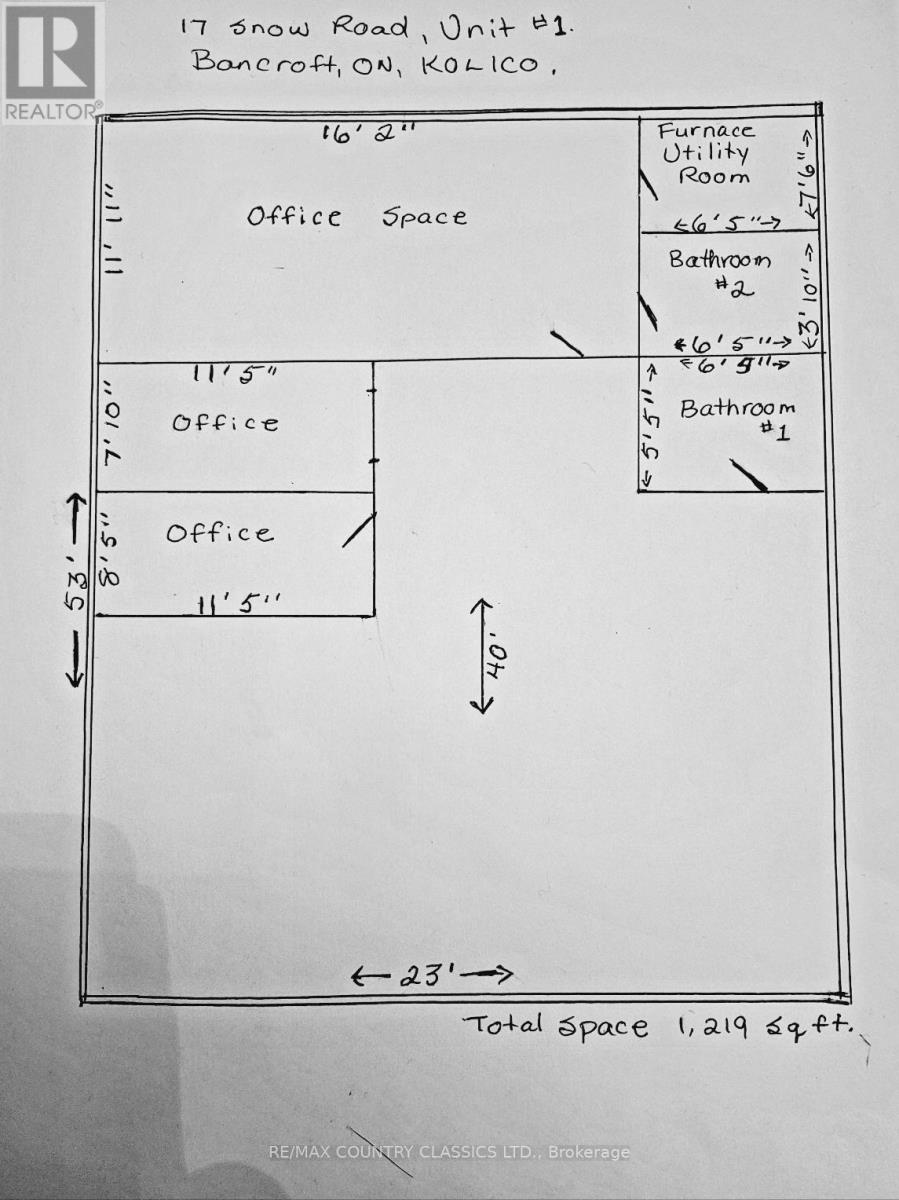 COMMERCIAL LEASE IN BANCROFT - AVAILABLE IMMEDIATELY. This unit, main floor property has 1219 Square feet of commercial space available in a well maintained building. Located in the heart of the Town of Bancroft in a high traffic location next to franchise retail stores, restaurants, a busy hotel, residential homes and Bancroft's Millenium Park. Property Zoning is C2 perfect for retail, QSR, office, or service applications. Rent base is $1,500 per month including TMI, All utilities are extra . Large open space has heating/AC, 200 Amp Service Electrical, 1 bathroom, with the potential for 2 bathrooms, wheelchair accessibility and ample parking in front of the unit and the street. Storefront features, large full front glass windows and awning location for box sign advertising possibilities. One of the best buildings available in the downtown core. **EXTRAS** Minimum1 Year lease. All upgrades and improvements required to the unit are the responsibility of the tenant at their own expense and further approved by the landlord before construction commences. There have been upgrades to the unit including new flooring , updated bathroom and walls installed for officespaces. Utilities are paid by the Tenant. This end unit is perfect for a restaurant or retail space. (id:49203)