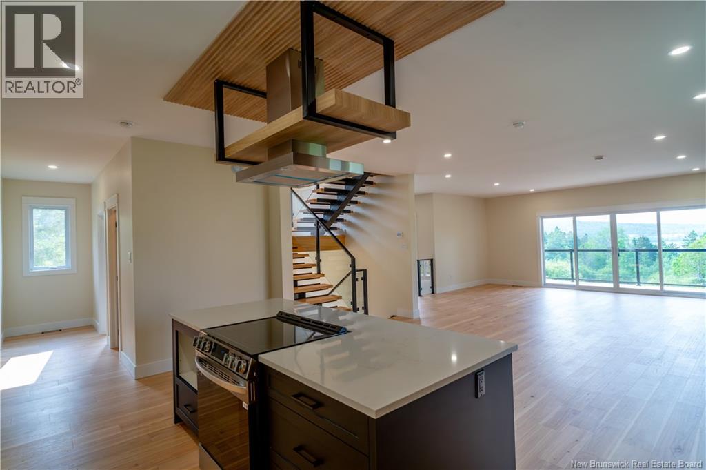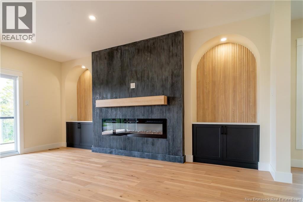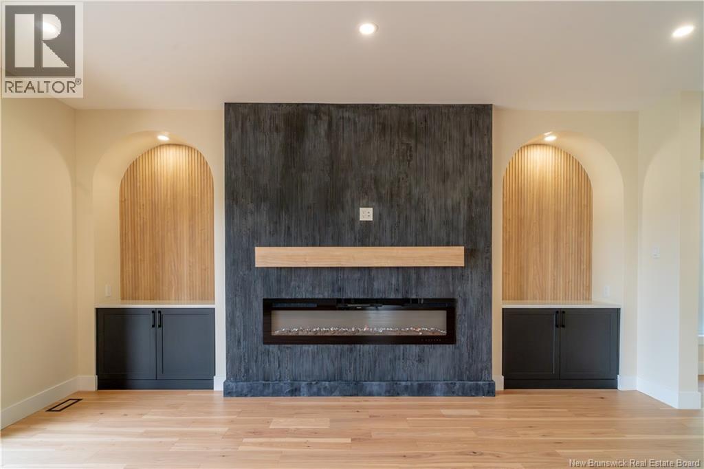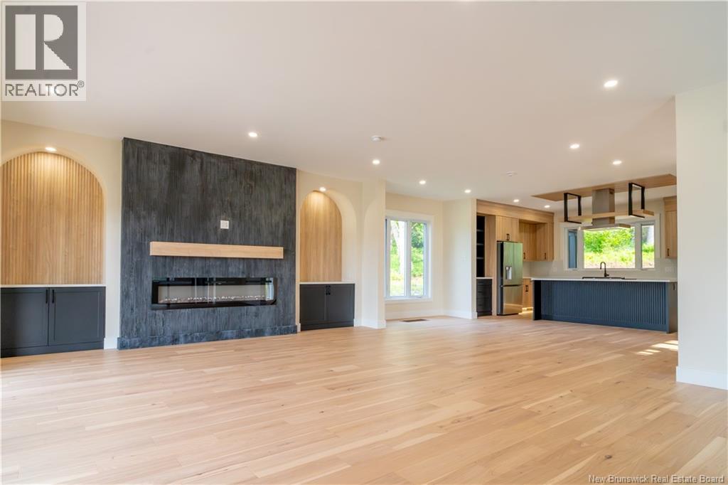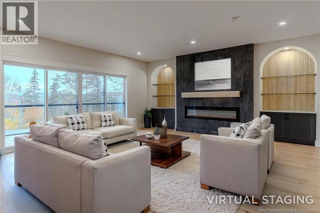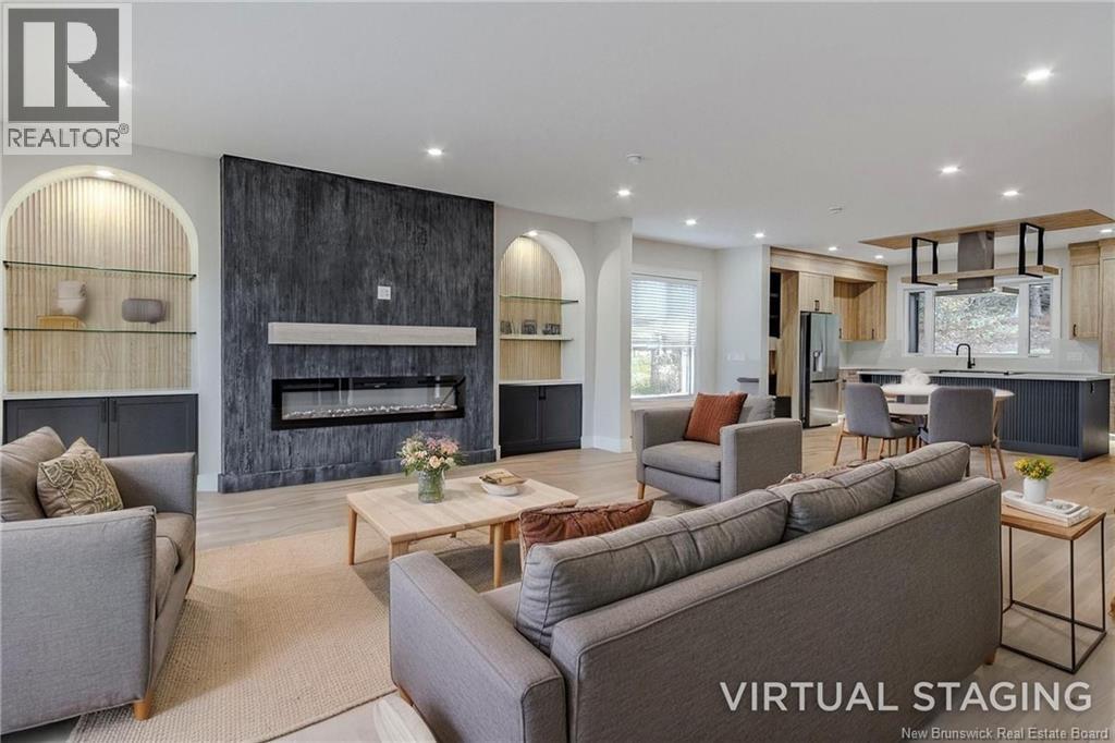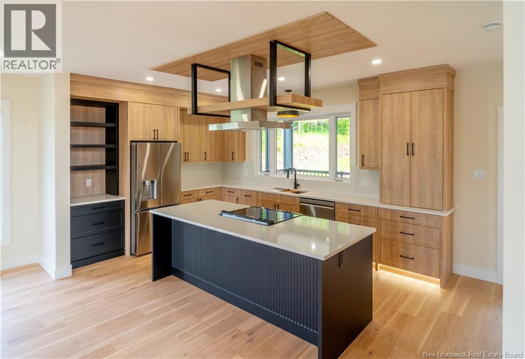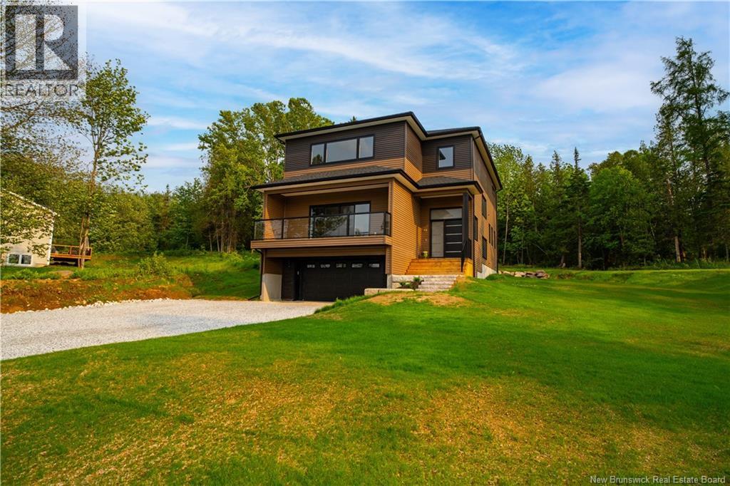 Welcome to 10 Motivation Avenue, a refined new build by Homestar Inc in the expanding Serenity Heights community. This contemporary two-storey home offers standout curb appeal with sleek lines, black-framed windows, and contrasting modern siding. A covered front porch plus a generous stone patio out back create inviting outdoor living spaces. The neighbourhood also provides easy access to the beautiful Hammond River only steps away. Inside, the open-concept main floor showcases a striking living area with a Venetian plaster fireplace flanked by arched built-ins. The designer kitchen impresses with a quartz island featuring the cooktop and custom range hood, bespoke cabinetry, seamless quartz backsplash, and a built-in coffee bar. A pantry, powder room, and combined laundry/mudroom with dog wash add convenience to the main level. A dramatic cantilevered metal and glass staircase anchors the home, connecting all three levels with architectural flair. Upstairs, the primary suite captures year-round Hammond River views, offers custom millwork, and features a spa-inspired ensuite with a soaker tub, oversized walk-in shower, solid wood vanity, built-in makeup area, and timeless tilework. A spacious walk-in closet provides organized storage. Two additional bedrooms and a full bath complete this level. With exceptional craftsmanship, elevated finishes, and thoughtful design throughout, this is a one-of-a-kind home for those who value both style and function. (id:49203)