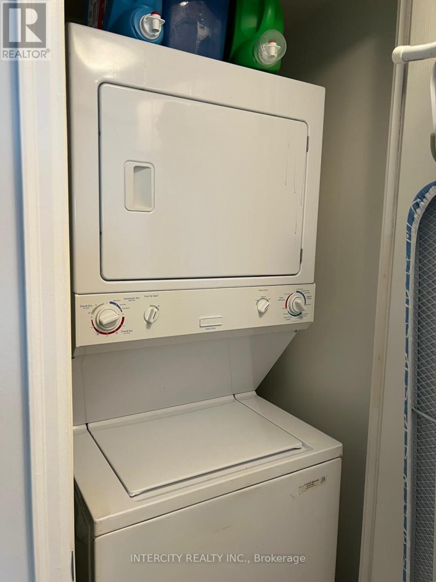 Luxury mid-rise condo offering a bright, open-concept living and dining area with walk-out to a private balcony and large windows. Modern kitchen features a centre island ideal for casual dining, granite countertops, and stainless steel appliances. Functional split-bedroom layout with 2 bedrooms, 2 full bathrooms, plus a den providing excellent privacy for residents and guests. Primary bedroom includes a walk-in closet and 4-piece ensuite. Convenient in-suite laundry with stackable washer and dryer. Open den is perfect for a home office. Building amenities include 24/7 concierge/security, exercise room, and games room. Ideally located close to all amenities, highways, transit (TTC), and places of worship. (id:49203)