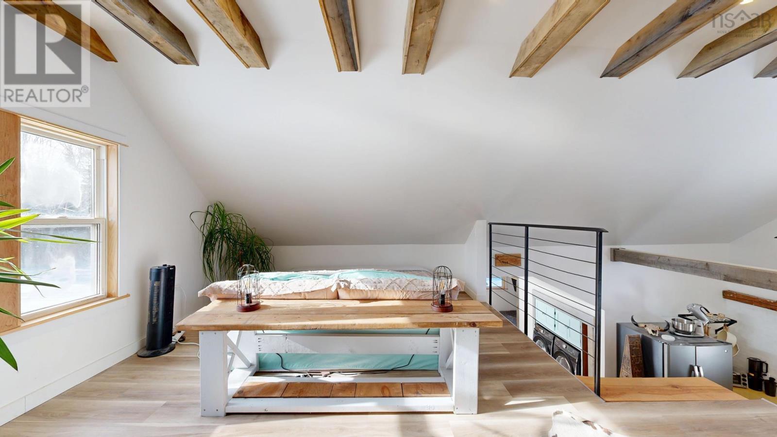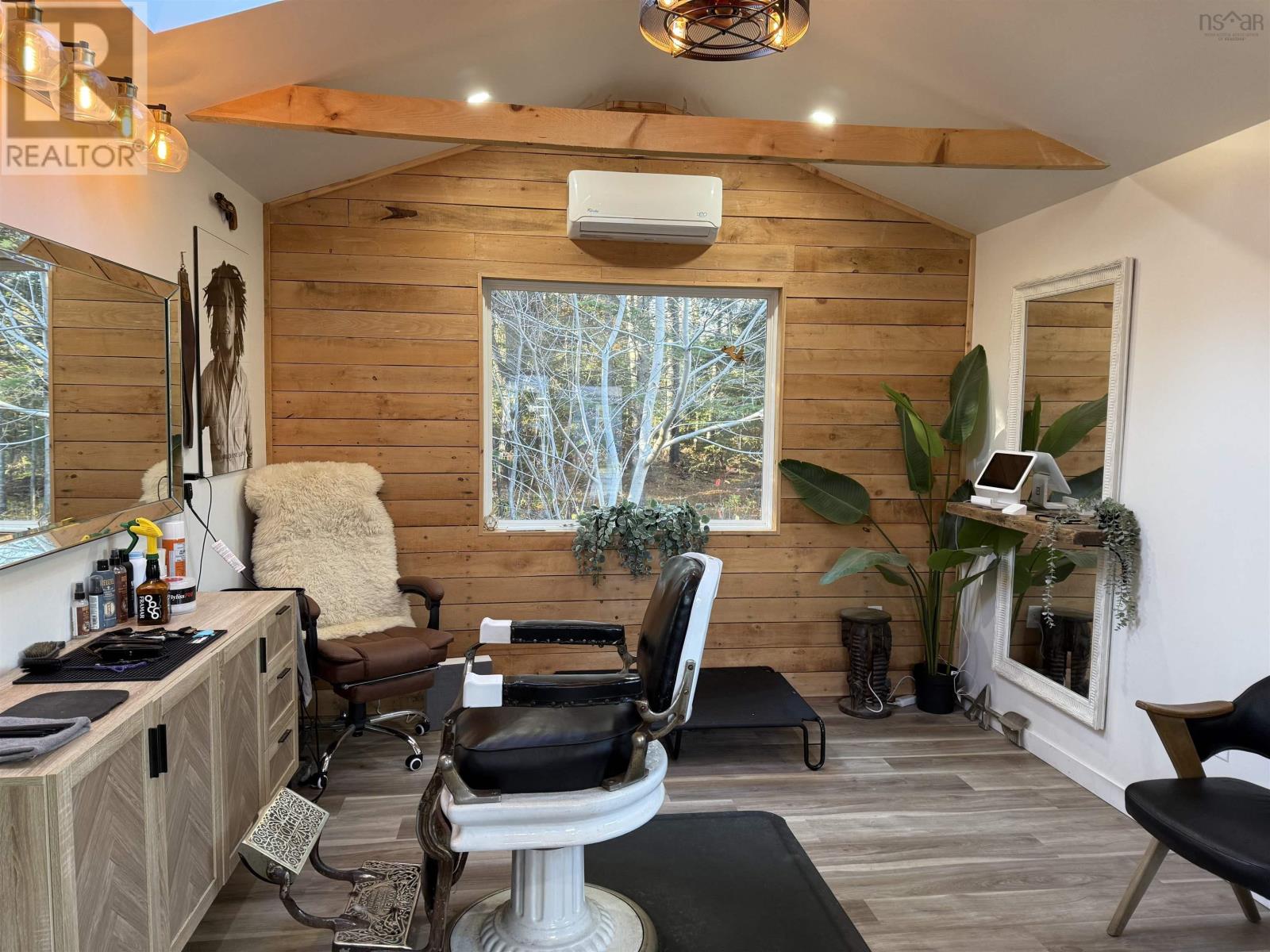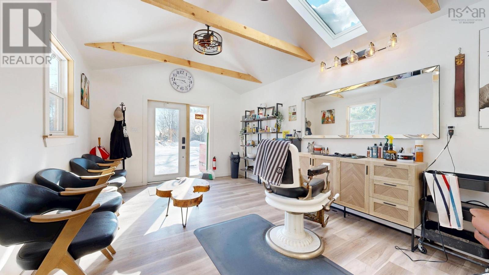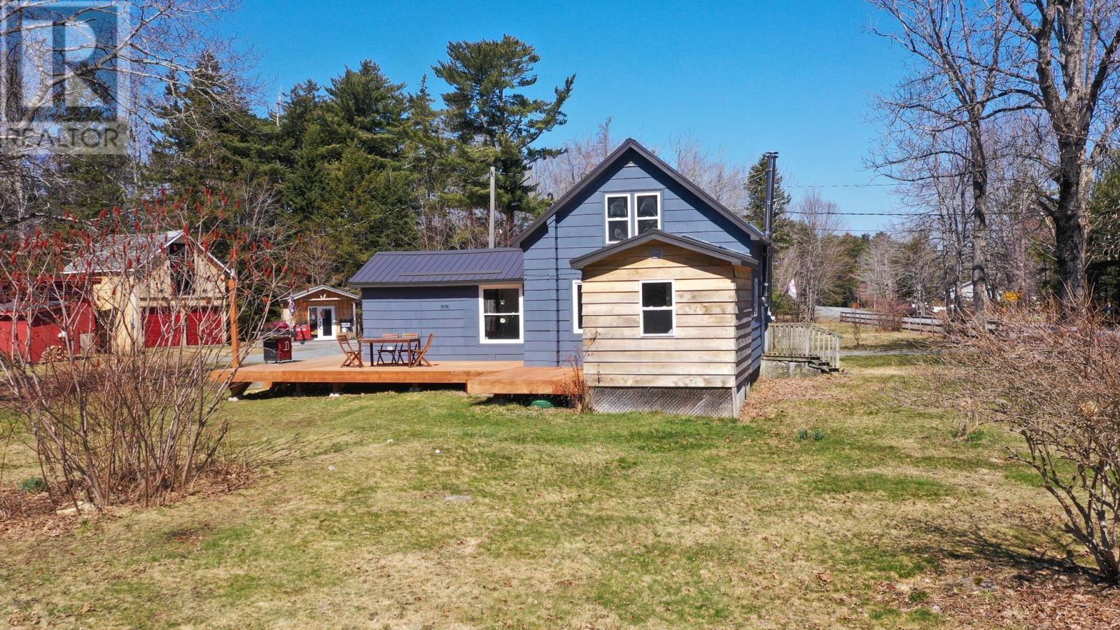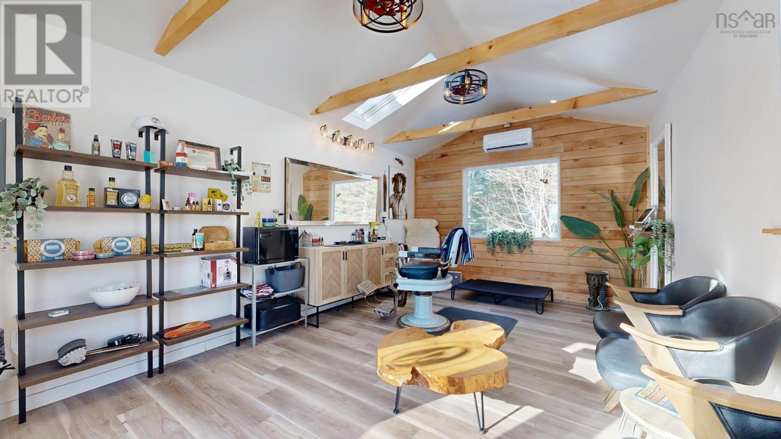 L&S #1296. Set on 2.3 acres, this thoroughly renovated 1,100 sq ft home offers country ambiance just minutes from a marina and the white sands of Beach Meadows Beach. Unassuming from the exterior - stunning on the interior. Major upgrades include new plumbing and wiring, metal roof, spray foam insulation, woodstove and mini split heat pump. The main floor features light-filled open-concept living areas with vaulted ceilings, full bath with soaker tub and tiled shower, and a flexible main floor bedroom or den with access to an expansive deck. An open staircase leads to the loft bedroom above. Special touches include exposed beams, curated light fixtures, vintage interior doors and metal accents. Outside, a trio of fabulous outbuildings share a separate 200 amp electrical service: a two story barn with spacious loft for guests, garage/workshop with 9 1/2 foot ceilings and recently added retail shop - currently operating as The Barefoot Barber. Board & batten with metal roof, the shop comprises 200 sq ft, with covered entry, mini split heat pump, skylight and vaulted ceilings. The grounds are level and partially fenced with ample parking, raised garden beds, and fruit trees including peach, apple, and cherry, along with grape vines. Its a perfect little hobby farm and an ideal setup for anyone wanting to combine home, business and creative pursuits. Conveniently located minutes from Liverpool amenities, including hospital, shopping, museums, and the Astor Theatre. Floor plans available. Most chattels (business and otherwise) may be purchased separately. (id:49203)