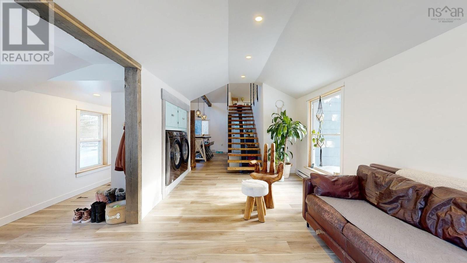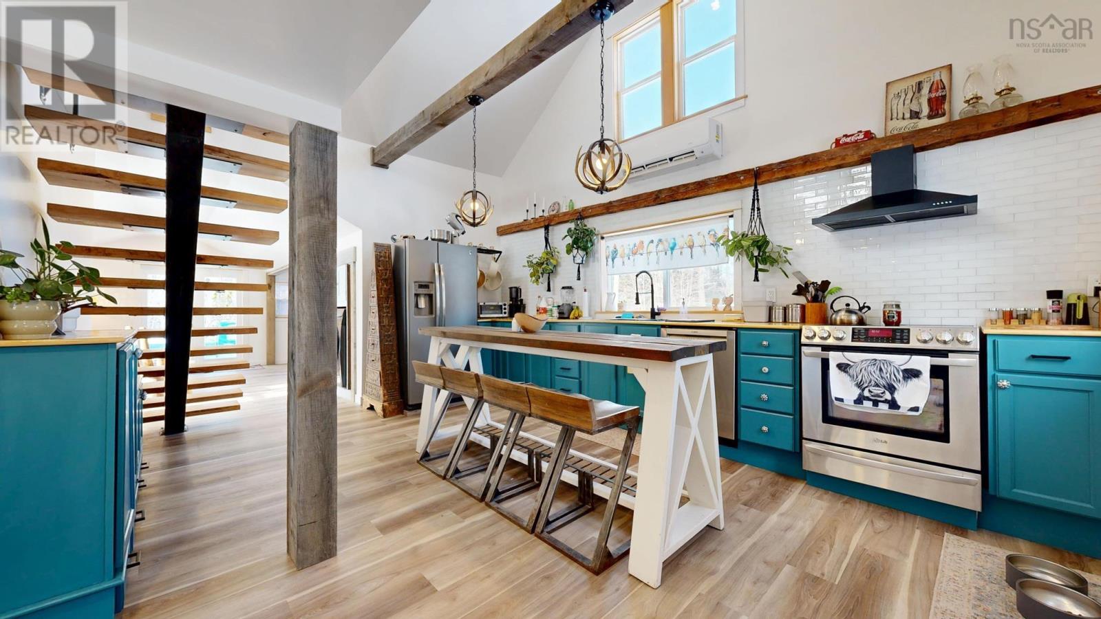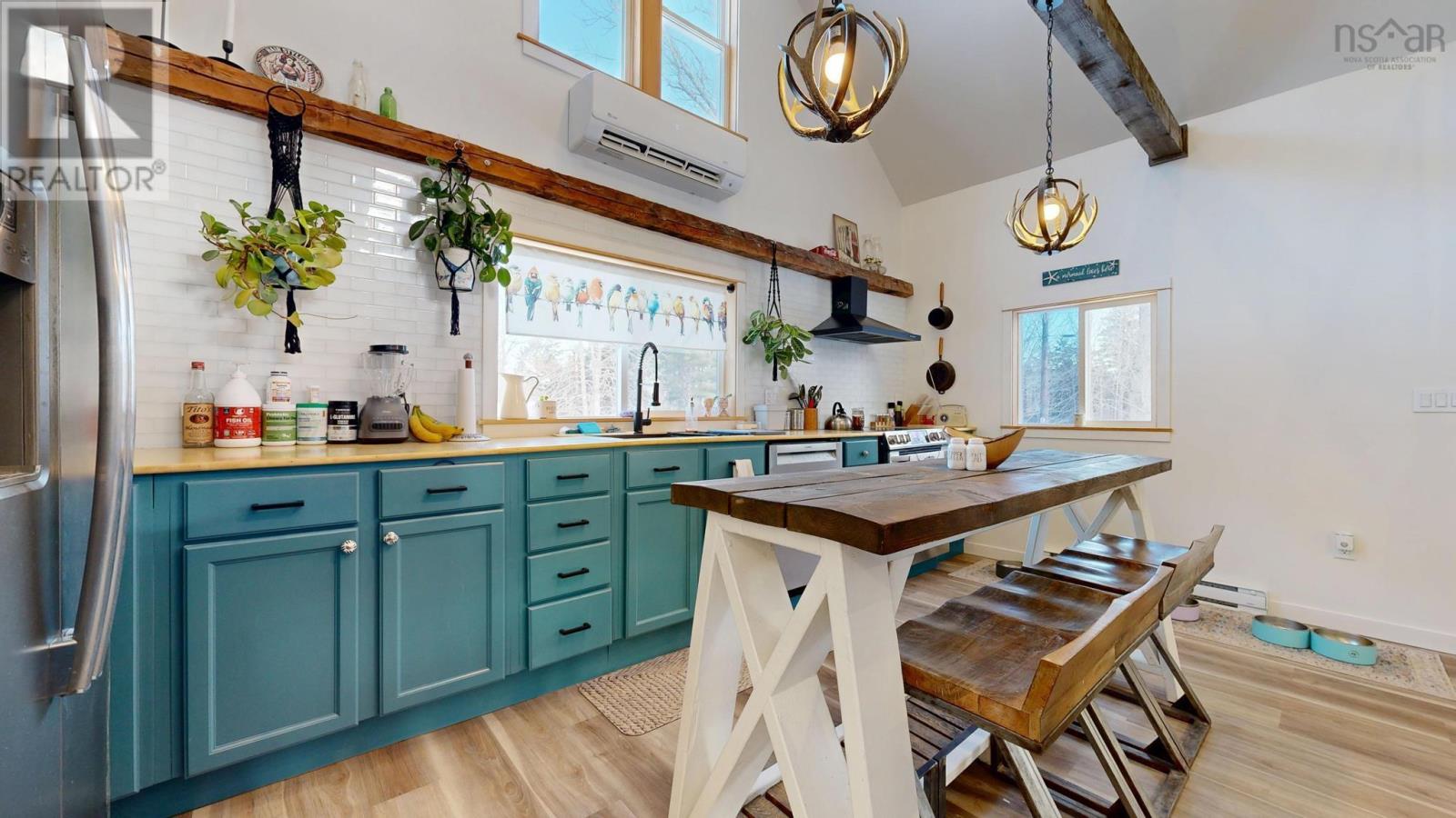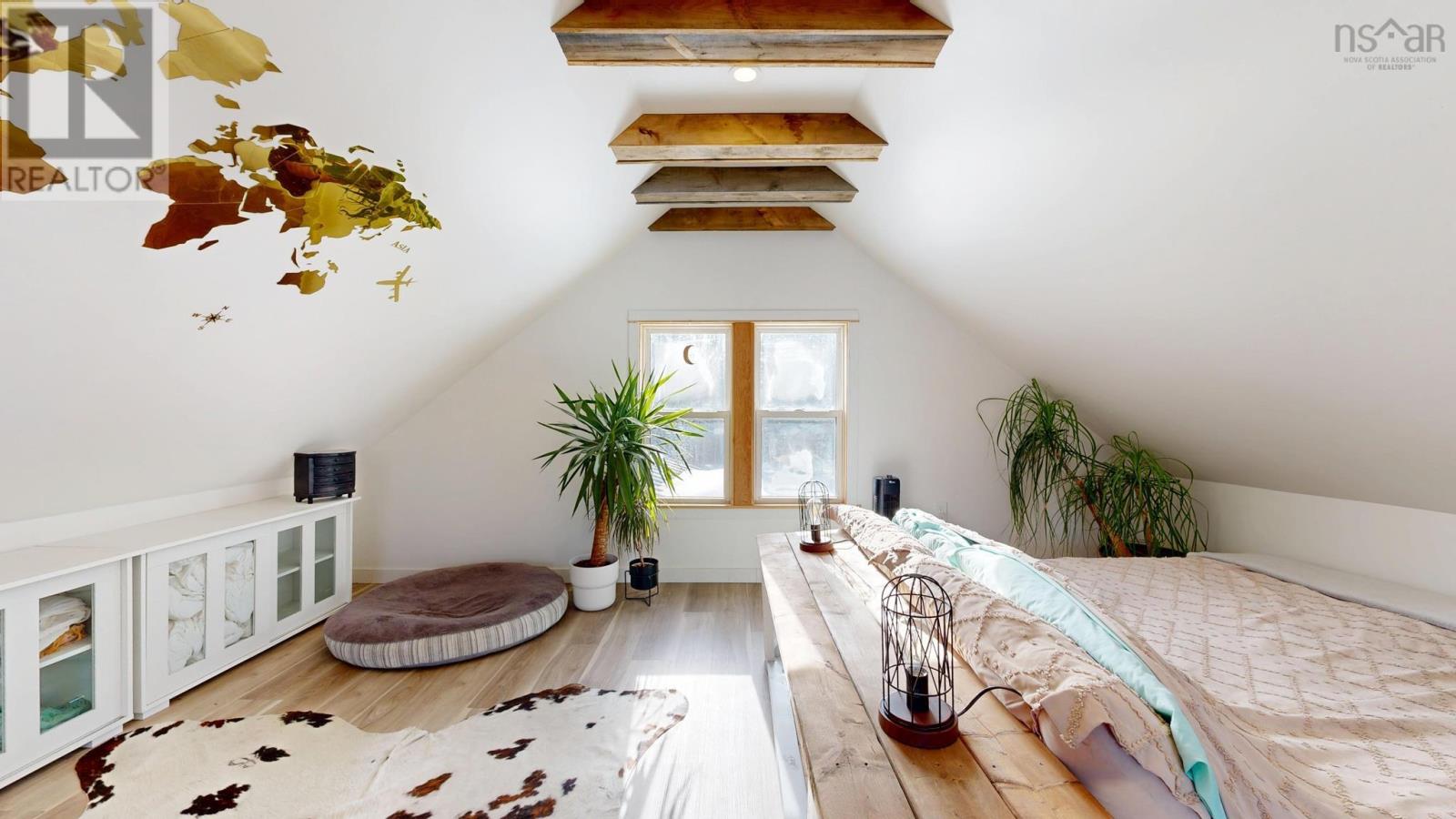 L&S #1296. Set on 2.3 acres, this thoroughly renovated 1,100 sq ft home offers country ambiance just minutes from a marina and the white sands of Beach Meadows Beach. Unassuming from the exterior - stunning on the interior. Major upgrades include new plumbing and wiring, metal roof, spray foam insulation, woodstove and mini split heat pump. The main floor features light-filled open-concept living areas with vaulted ceilings, full bath with soaker tub and tiled shower, and a flexible main floor bedroom or den with access to an expansive deck. An open staircase leads to the loft bedroom above. Special touches include exposed beams, curated light fixtures, vintage interior doors and metal accents. Outside, a trio of fabulous outbuildings share a separate 200 amp electrical service: a two story barn with spacious loft for guests, garage/workshop with 9 1/2 foot ceilings and recently added retail shop - currently operating as The Barefoot Barber. Board & batten with metal roof, the shop comprises 200 sq ft, with covered entry, mini split heat pump, skylight and vaulted ceilings. The grounds are level and partially fenced with ample parking, raised garden beds, and fruit trees including peach, apple, and cherry, along with grape vines. Its a perfect little hobby farm and an ideal setup for anyone wanting to combine home, business and creative pursuits. Conveniently located minutes from Liverpool amenities, including hospital, shopping, museums, and the Astor Theatre. Floor plans available. Most chattels (business and otherwise) may be purchased separately. (id:49203)