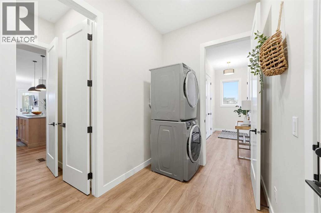 Incredible newly built bungalow by award-winning builder Renova Homes, offering refined craftsmanship, upscale finishes, and the ease of luxury single-level living in the highly sought-after community of Greystone! Backing a walking pathway and just minutes from all shopping amenities, the Spray Lakes Recreation Centre, and the Bow River, this prime central Cochrane location offers the perfect balance of convenience and lifestyle. Designed with discerning buyers in mind, the main floor features 10’ ceilings, oversized 8’ interior doors, sleek black matte finishes, upgraded lighting, and luxury vinyl plank flooring throughout the main floor. The chef-inspired kitchen is both elegant and functional, showcasing a premium KitchenAid built-in appliance package with 36" gas range & 36 " ceiling hood fan, quartz countertops, oversized island, 42” upper cabinetry, extended tile backsplash, and LED under-cabinet lighting—ideal for hosting or enjoying evenings at home. The open-concept dining and living areas are bright and inviting, centered by an electric fireplace and framed by large windows. Step outside to the full-width rear deck, with stairs to grade and a gas line for BBQ—perfect for effortless entertaining. The primary suite is a private retreat, complete with a spacious walk-in closet with built-ins and a spa-inspired ensuite featuring dual sinks, quartz countertops, soaker tub, and a beautifully tiled glass shower with upgraded 12” x 24” tile flooring and shower walls and a tiled shower niche-Thoughtful details include a timer exhaust fan and elegant wood-front medicine cabinet. A second main-floor bedroom or office provides flexibility for guests or working from home, while the well-appointed mudroom includes laundry with rough-in for a sink and space for future cabinetry, plus a convenient pass-through pantry with wood shelving. The fully developed basement expands your living space without compromise, offering a large recreation area with wet bar rough-in and de dicated electrical circuits, two additional bedrooms, and a full bathroom—ideal for visiting family or extended stays. Enhanced garage space with a 2’ extension and upgraded pre-finished door with windows and opener. Homes of this caliber and location don’t come along often! Notable upgrades include: central air conditioning, Roxul sound insulation between the living room and primary bedroom, powder room vanity with quartz countertops, upgraded light fixtures and high-end ceiling fans in all four bedrooms with added structural support, additional basement windows and enlarged office window, comfort-height toilets, HDMI conduit in the primary bedroom, living room & basement, eave plug with interior switch for seasonal lighting, and conduit for future fireplace media. Enjoy the benefits of new construction without the delay—move-in ready and fully protected under Alberta New Home Warranty. Experience elevated bungalow living in the heart of Cochrane—book your private showing today! (id:49203)