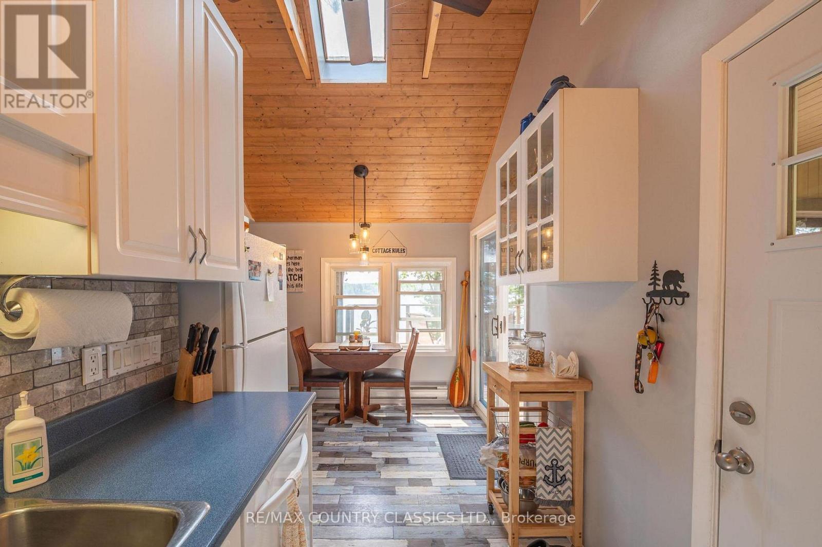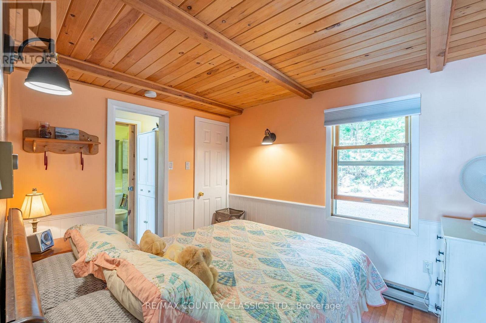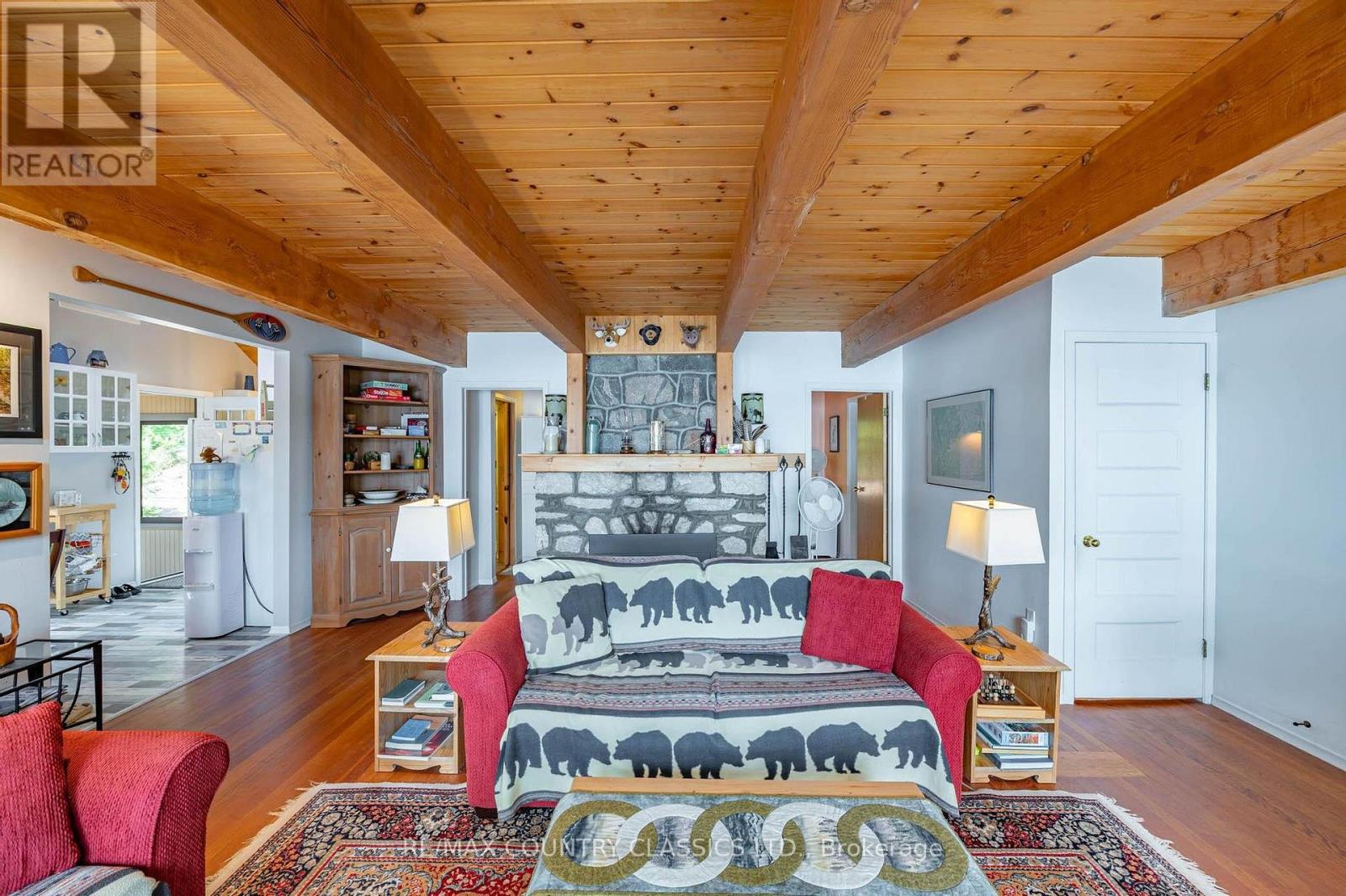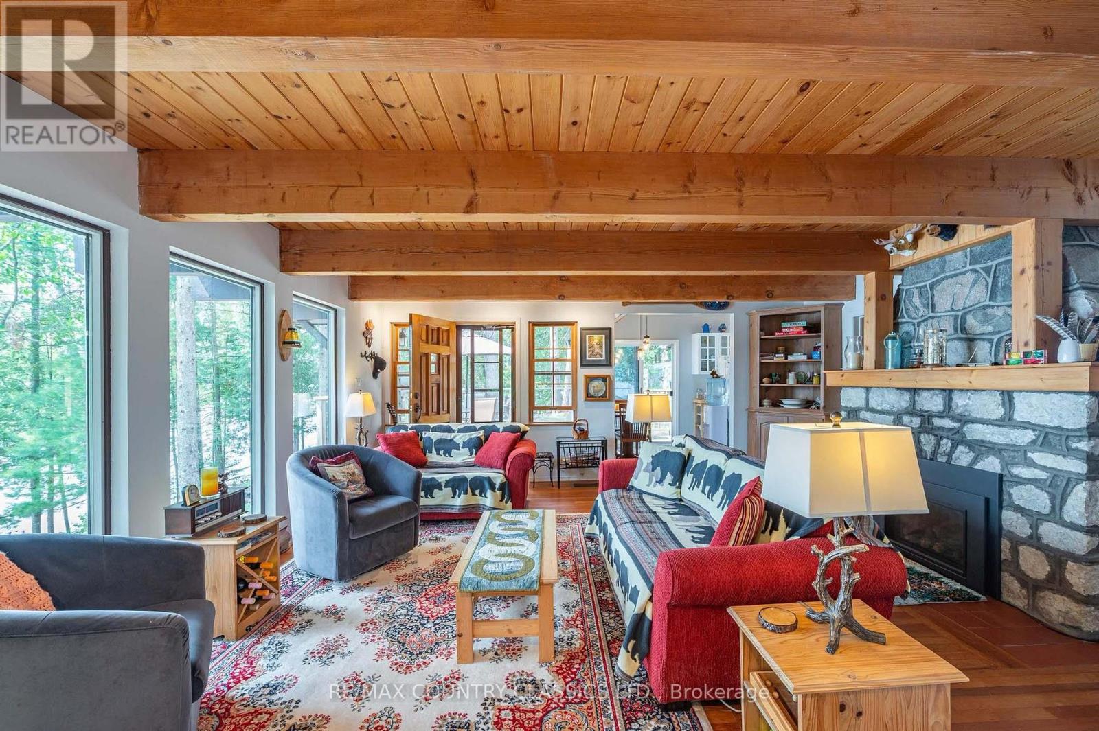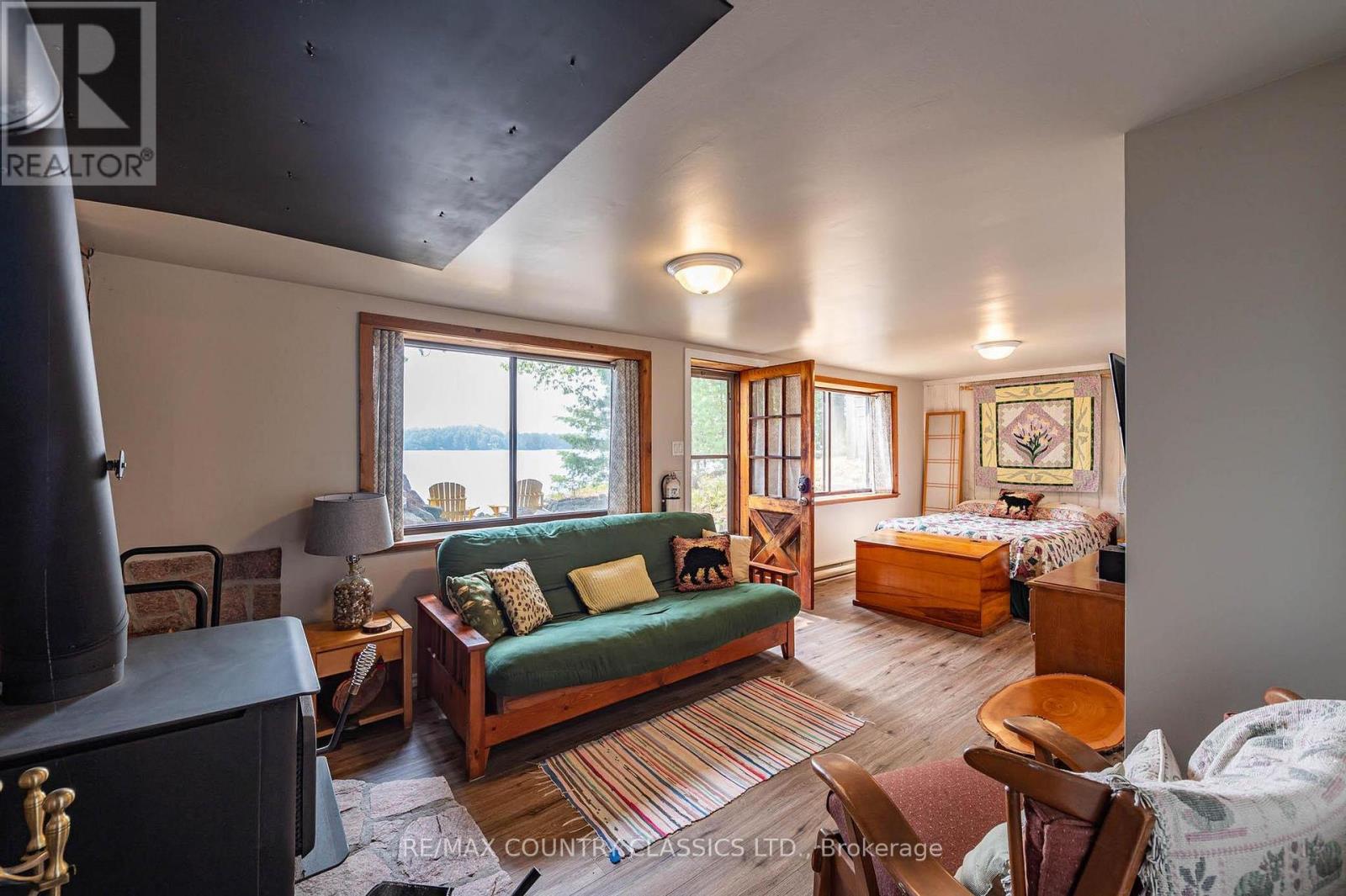 A remarkable four season cottage on Chandos Lake featuring 510 feet of outstanding private shoreline and stunning open lake views. This three bedroom, two bathroom property offers a bright, functional layout with an open concept living area, large windows, and warm natural finishes. The expansive frontage provides exceptional privacy, excellent swimming, and multiple vantage points to enjoy the lake. A rare dryland boathouse offers convenient storage and workspace. With year-round access, modern systems, and a peaceful setting on one of the region's premier lakes, this property is ideal for both seasonal enjoyment and full time lakeside living. (id:49203)