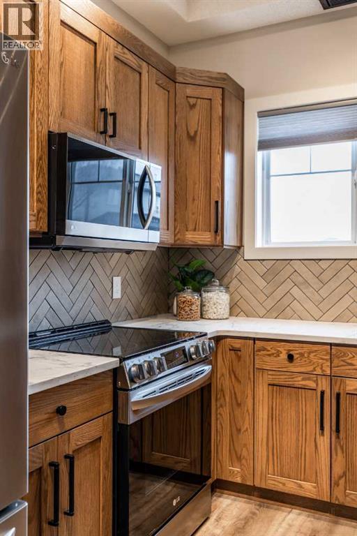$547.87 MonthlyWelcome to this absolutely stunning, fully renovated executive-style main floor, corner condo unit offering just under 1,100 sq ft of beautifully designed living space in a quiet, well-maintained building. You’ll appreciate the impressive 10-foot ceilings and abundance of natural light that create an open, airy feel throughout. The entire unit has been thoughtfully updated from top to bottom, showcasing modern finishes, and a cohesive, high-end design. The kitchen is a true centerpiece, with both style and functionality in mind. Cabinets have been refinished in a rich, darker stain, brand-new soft-close hinges, and updated stainless steel appliances. Undermount lighting adds warmth and perfectly complements the honed quartz countertops, striking herringbone-pattern backsplash and upgraded black granite undermount sink. The open-concept layout flows seamlessly into the dining and living area where custom oak slat feature walls create a bold and contemporary statement. The spacious two-bedroom layout includes a beautifully updated primary retreat with a fully renovated ensuite bathroom featuring modern black fixtures, and walkthrough closet with custom shelving and dresser. The bedroom ceiling showcases custom wood accent detailing, adding character and warmth. Doors and closets throughout the unit have been upgraded, offering a blend of solid and hollow core construction for durability and efficiency. Additional features include upgraded flooring with added underlay for comfort and sound reduction, LED halo-style lighting accents, new blinds throughout, allergen/dust filtering screens on windows and so much more. Step outside to your private balcony—perfect for relaxing or enjoying your morning coffee—while taking in the peaceful surroundings. The property is ideally situated adjacent to scenic walking paths, making it easy to enjoy the outdoors right from your doorstep. This quiet, well-managed building offers great amenities including a recreation room, small self -serve fitness area, and elevator access. Pet-friendly (with restrictions), it’s ideal for a variety of lifestyles. Condo fees of $547.87/month include all utilities (except cable and Wi-Fi), providing excellent value and convenience. The unit also comes with one underground titled parking stall and a dedicated storage space. Ideal for downsizers or a young professional couple, this gorgeous, one-of-a-kind condo stands out from anything else on the market. Reach out to your favorite REALTOR® today to set up a viewing! (id:49203)