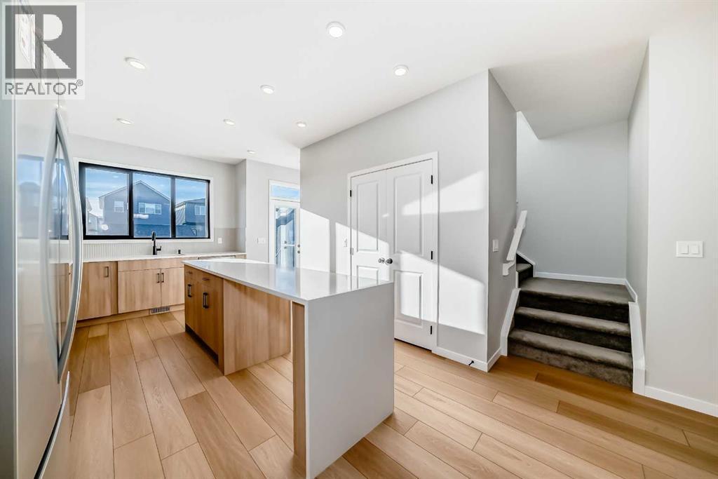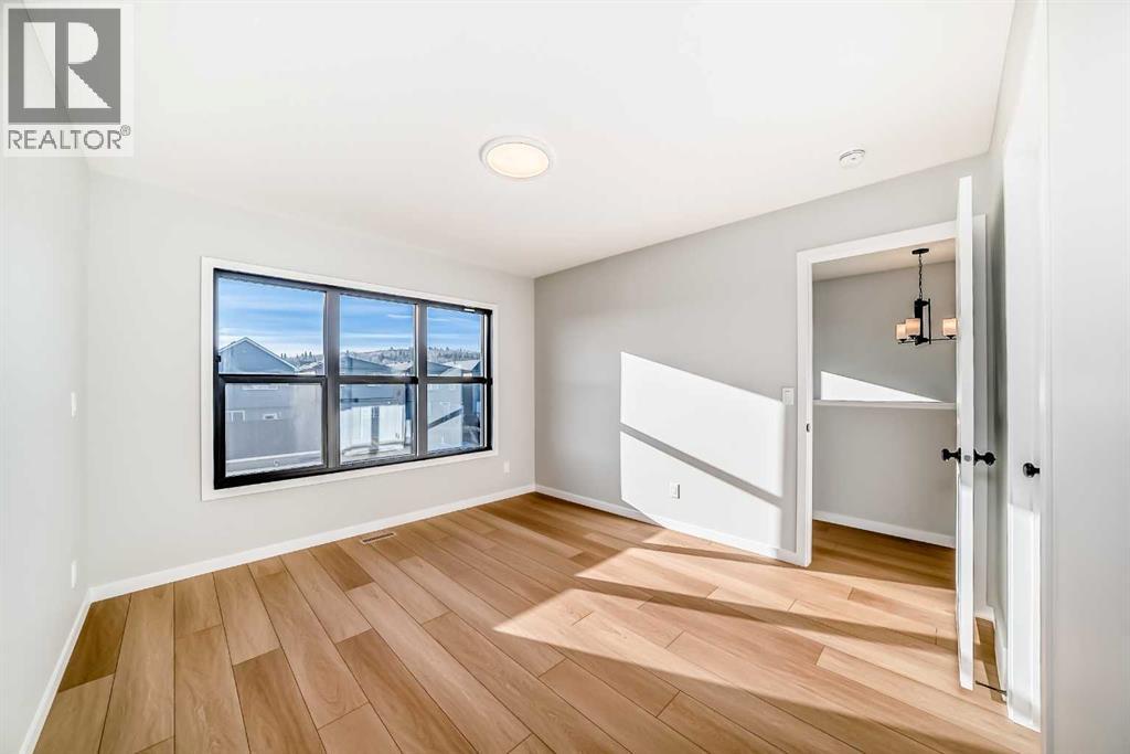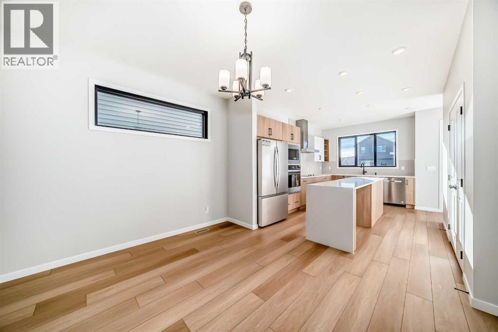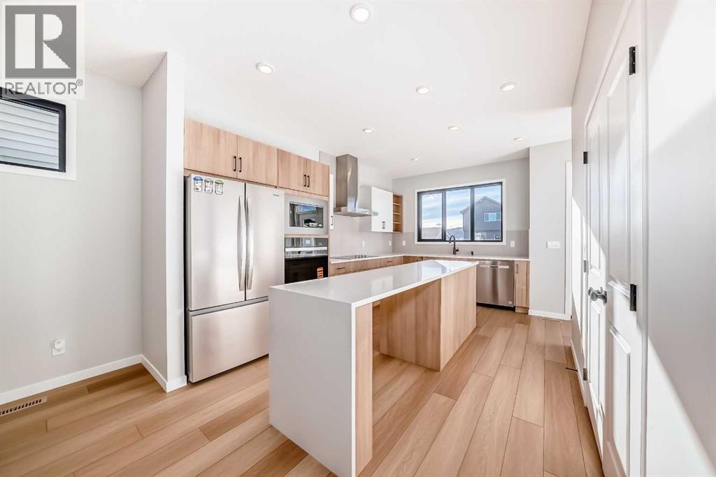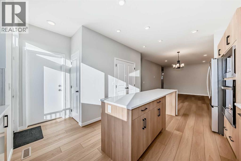 Welcome to this brand new, upgraded home in the vibrant community of Pine Creek! Known for blending nature, family living, and modern homes, Pine Creek offers scenic pathways, nearby parks, and easy access to city conveniences. This beautifully designed property features extensive upgrades throughout and is perfect for homeowners looking for a mortgage helper opportunity with its thoughtfully designed basement living space. The main floor showcases luxury vinyl plank flooring throughout the entire main and second floor, a spacious layout, and a gorgeous extended kitchen with two-tone cabinetry, waterfall island with additional cabinet storage, upgraded backsplash tiles, built-in appliances, and a modern upgraded hood fan. A larger walk-in pantry adds both convenience and storage. The home also features upgraded black window frames, adding a striking modern exterior and interior aesthetic. A versatile additional room on the main floor is complemented by a full bathroom with an upgraded standing shower and full wall tile finish, perfect for guests or multi-generational living. Upstairs, you’ll find spacious bedrooms and an upgraded ensuite featuring a beautifully finished standing shower with full wall tiles. The extended basement bedroom enhances the lower level’s functionality, making it ideal for extended family or rental potential. Both the main floor and basement kitchens feature stylish two-tone cabinetry, creating a cohesive and upscale look throughout. Additional highlights include: Upgraded washer and dryer sets for both main floor and basement, Upgraded stair carpet, Pressure-treated backyard deck with sleek black railings, Upgraded exterior stone detailing, Doorbell camera system for both the main entrance and basement entrance.This move in ready home combines style, functionality, and income potential in one of Calgary’s growing communities. (id:49203)
