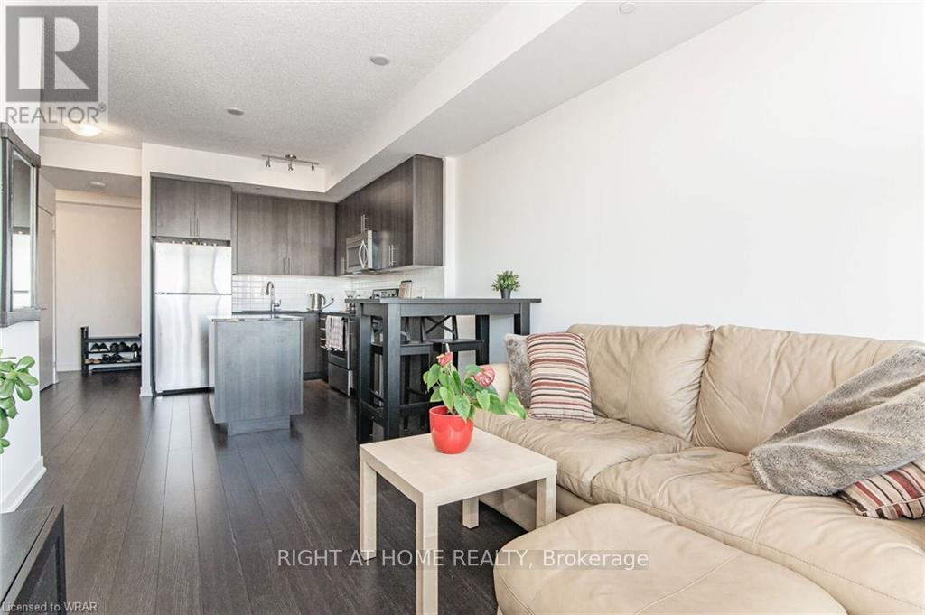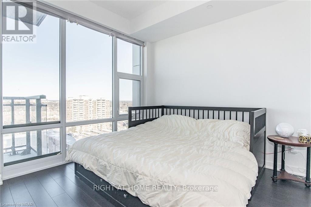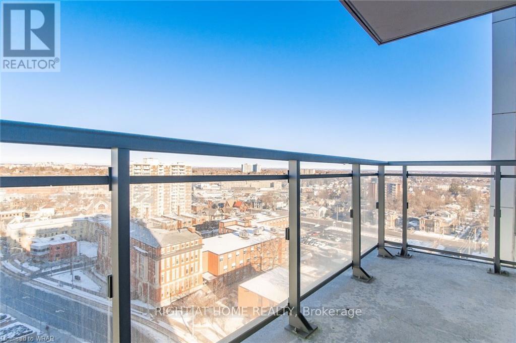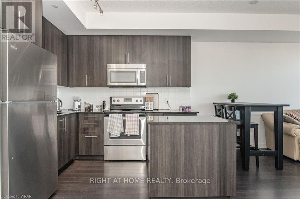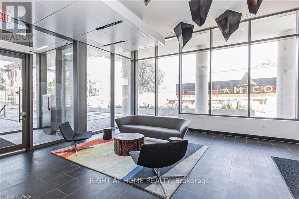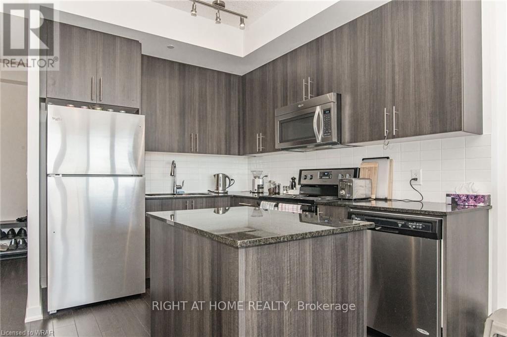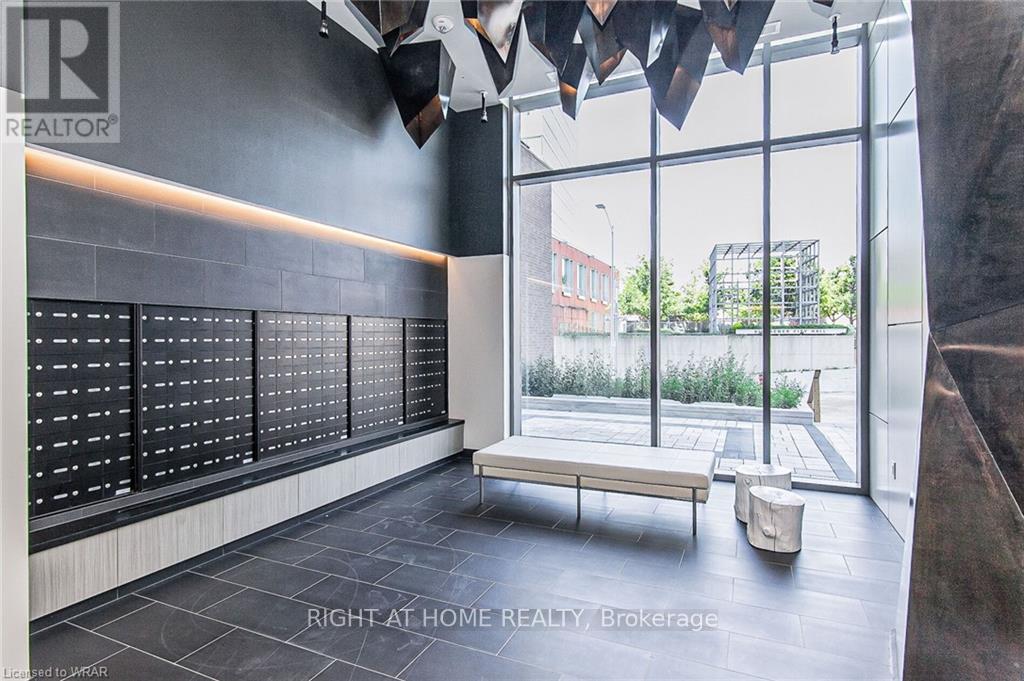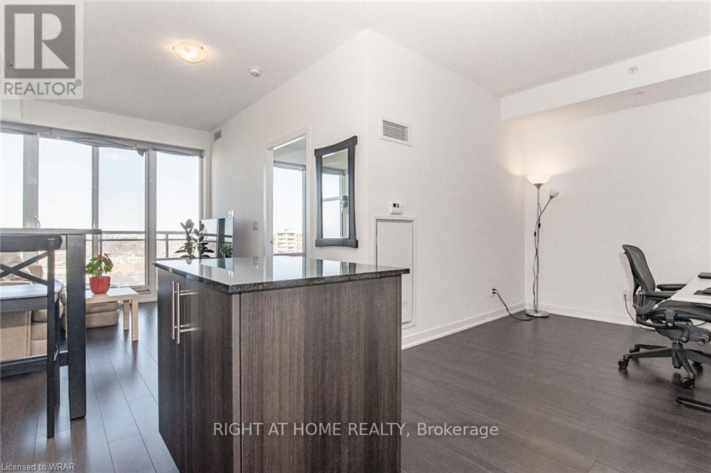 Welcome to this stunning, modern One Bedroom Plus Den In Downtown Kitchener. Elegant hardwood flooring and beautiful floor to ceilings windows. The living room is a versatile space, with walkout to your private balcony with excellent view. The den can be used as an office area or bedroom. Open to the living room is your kitchen, with stainless steel appliances, granite finishes and a spacious island. This condo has beautiful 9 foot ceilings and provides in-suite laundry. UnitComes With One Parking and One Locker. Steps public transit, LRT, Shops, Library, Victoria Park.Close To Go Stations And Tech Community (id:49203)