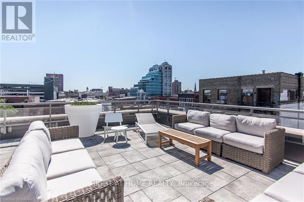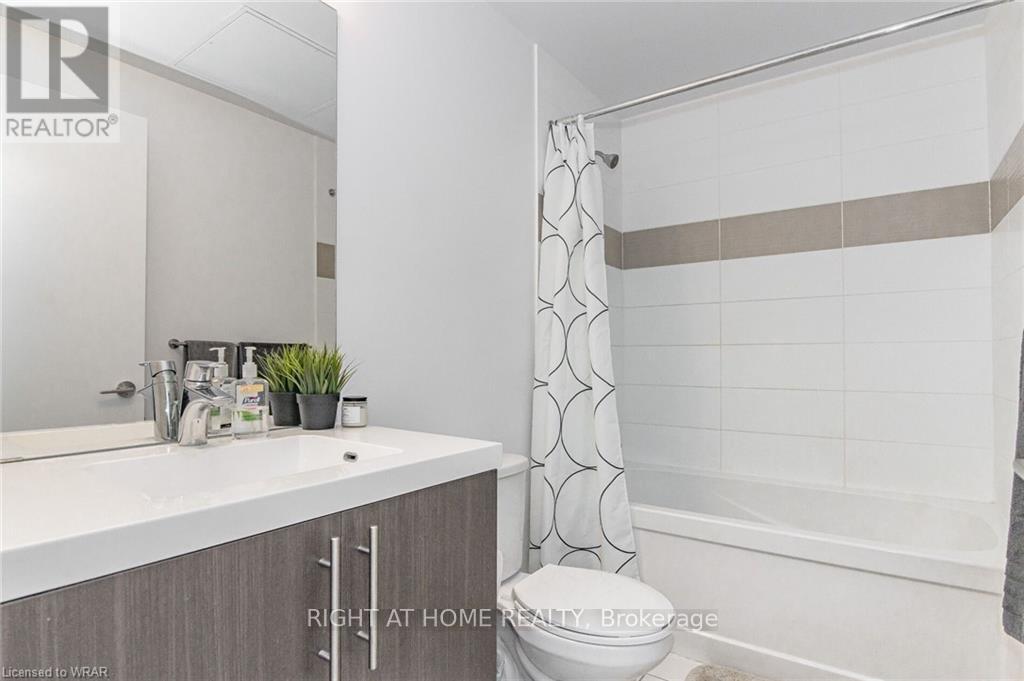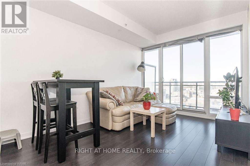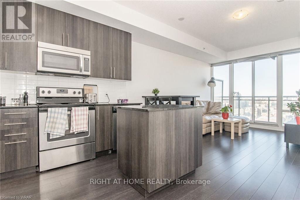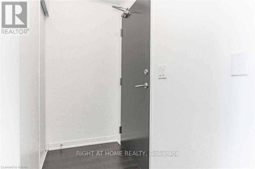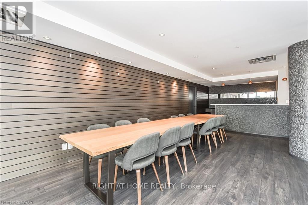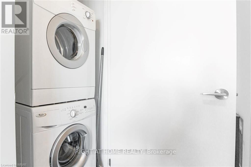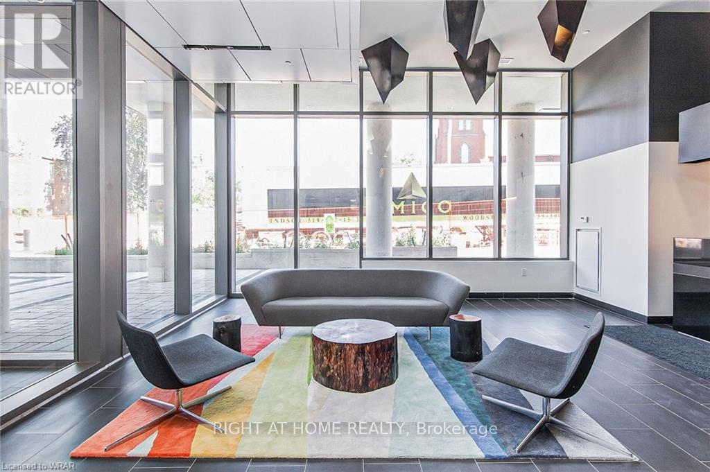 Welcome to this stunning, modern One Bedroom Plus Den In Downtown Kitchener. Elegant hardwood flooring and beautiful floor to ceilings windows. The living room is a versatile space, with walkout to your private balcony with excellent view. The den can be used as an office area or bedroom. Open to the living room is your kitchen, with stainless steel appliances, granite finishes and a spacious island. This condo has beautiful 9 foot ceilings and provides in-suite laundry. UnitComes With One Parking and One Locker. Steps public transit, LRT, Shops, Library, Victoria Park.Close To Go Stations And Tech Community (id:49203)