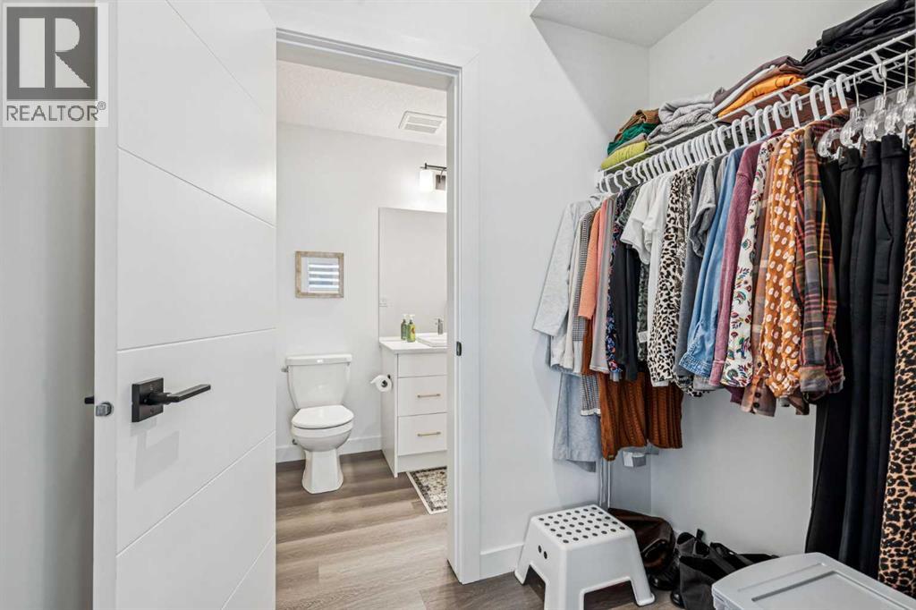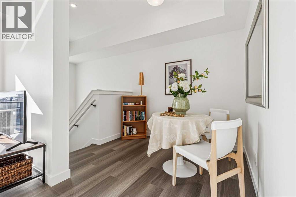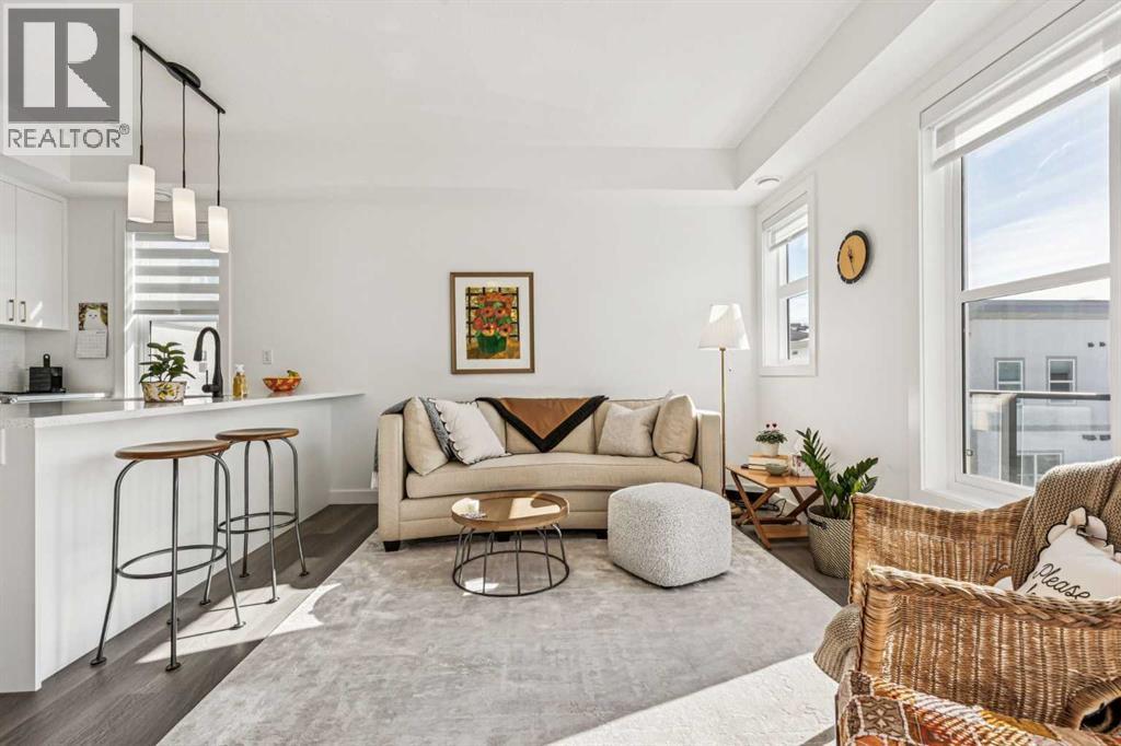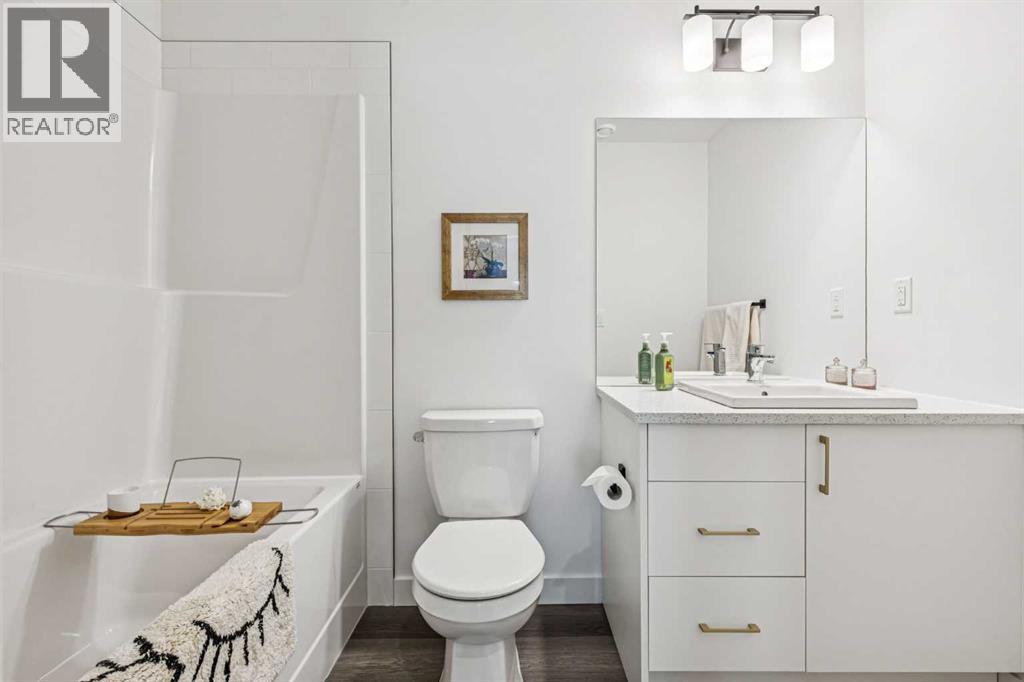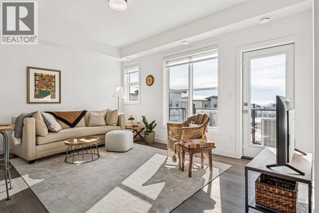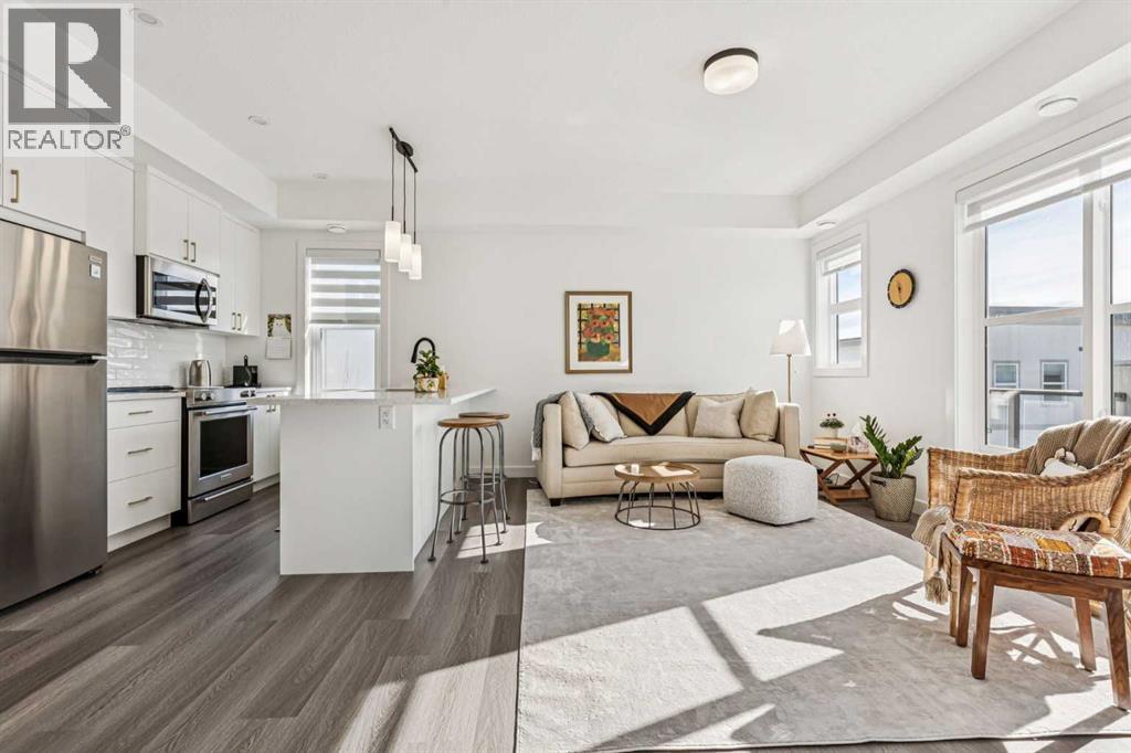 Discover Elkwood in Aspen Springs, located in one of Calgary’s most desirable southwest communities. Positioned at the end of a quiet street, this new stacked townhome enjoys some of the most open sightlines in the complex along with a sunny south-facing exposure, allowing natural light to pour in throughout the day. Thoughtful upgrades include central air conditioning and window coverings, making this home truly move-in ready. The home is also conveniently located close to guest parking, making it easy for visitors.Situated on the top floor, this modern home features 2 spacious bedrooms and 2 full bathrooms within a well-designed open-concept layout. 9-foot ceilings, expansive windows, and wide-plank luxury vinyl flooring create a bright and inviting atmosphere throughout the main living areas.The designer kitchen is both stylish and functional, featuring quartz countertops, soft-close cabinetry, a tiled backsplash, stainless steel appliances, a built-in microwave hood fan, and an upgraded convection oven. An east-facing kitchen window welcomes the morning sun, adding even more natural light to the space. The thoughtful layout offers both bar seating at the kitchen island and a dedicated dining area, making it ideal for everyday living and effortless entertaining.Convenience continues with a main floor laundry room featuring a front-load washer and dryer along with generous storage space. The lower level provides additional storage and a versatile flex room, perfect for a home office, workout space, or hobby area, plus private direct access to your attached garage—large enough to accommodate a Ford F-150 truck, a rare and valuable feature for townhome living.Ideally located just minutes from the shops and restaurants of Aspen Landing Shopping Centre, and easy C-Train access, along with nearby walking paths, schools, and beautiful green spaces, this home offers the perfect balance of style, comfort, and convenience.Whether you’re a first-time buyer, invest or, or seeking a low-maintenance lifestyle, this exceptional home truly checks all the boxes. (id:49203)