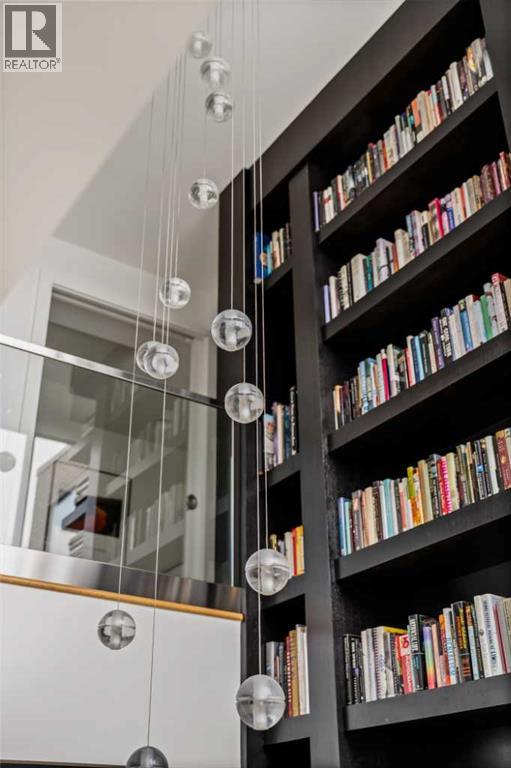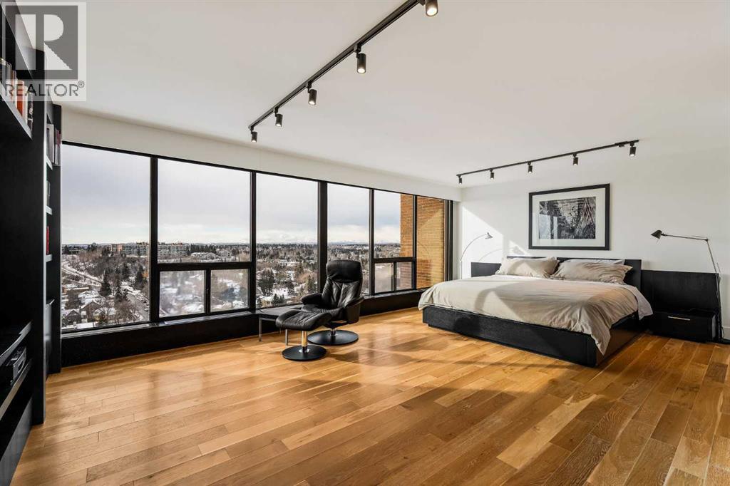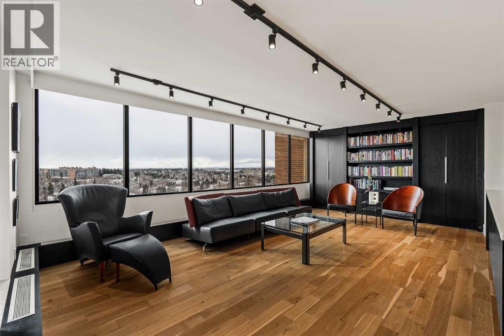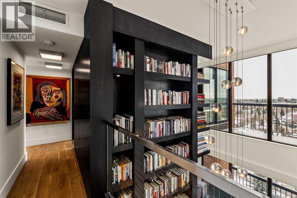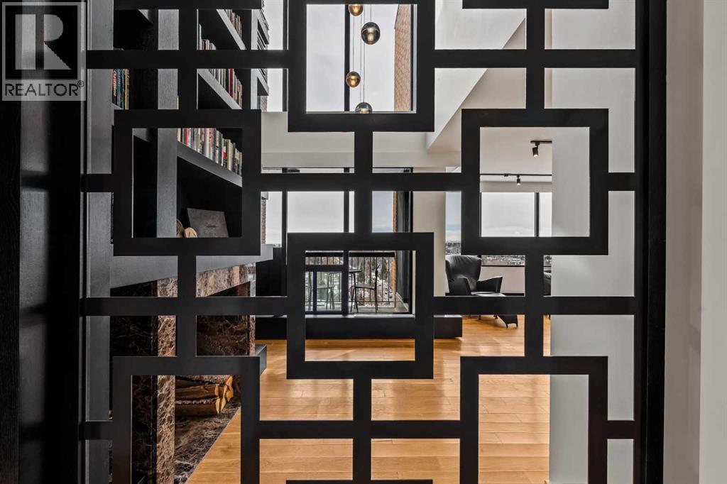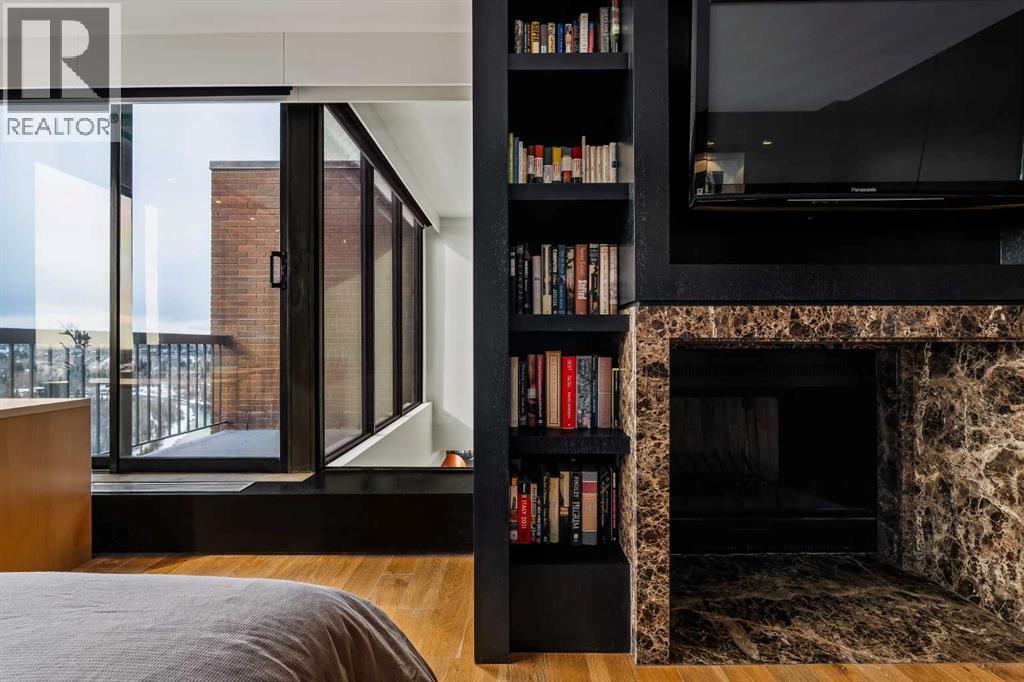 Architecturally renovated, this remarkable 2 storey penthouse delivers over 2,300 sq ft of refined living space with sweeping river valley and mountain views in the heart of Mission. Positioned within Roxboro House, one of Calgary’s most established concrete buildings, the home places river pathways, restaurants, cafés and downtown access within an easy walk while maintaining a quiet elevated setting above the city. Dramatic double height ceilings define the main living space where floor to ceiling windows frame expansive views and fill the interior with natural light throughout the day. Custom millwork and built-in library shelving introduce architectural character while a striking Bocci designer light installation creates a sculptural focal point above the living area. Marble fireplace surrounds add warmth and elegance while hardwood flooring extends throughout the home to create a cohesive and timeless finish. Entertaining flows easily between the living and dining areas where open sightlines toward the river valley form an impressive backdrop for gatherings. Quartz countertops and a full height quartz backsplash highlight the beautifully renovated kitchen where extensive custom cabinetry and a large central island support both daily routines and larger entertaining. Walk-in pantry storage keeps the space organized while built-in speaker wiring enhances the atmosphere for hosting. Adjacent bar cabinetry incorporates three wine fridges with capacity for approximately 750 bottles, creating a dedicated entertaining feature rarely found in condominium living. Upper level design introduces a flexible den retreat with its own fireplace and access to a second balcony, offering an ideal setting for a home office, lounge or private reading space overlooking the city skyline while an included Murphy bed allows the space to easily accommodate overnight guests when needed. Primary bedroom accommodations prioritize comfort and privacy through large windows, blackout blinds an d extensive custom storage solutions. Heated floors in the lavish ensuite provide everyday comfort while modern fixtures enhance the spa-inspired atmosphere. Air conditioning supports year-round comfort and upper level laundry adds everyday convenience. Two private balconies extend the living space outdoors while showcasing panoramic mountain and river views. Tandem underground parking accommodates 2 vehicles and an assigned storage unit adds valuable extra space. Roxboro House residents enjoy secure entry with front desk service along with exceptional amenities including an indoor pool, hot tub, sauna, fitness room, woodworking shop, library and billiards lounge, party room and a beautifully landscaped sky terrace with BBQ areas and outdoor gathering spaces. Mission remains one of Calgary’s most vibrant inner-city neighbourhoods where river pathways, parks, restaurants and boutique shopping create an exceptional walkable lifestyle just minutes from downtown. (id:49203)