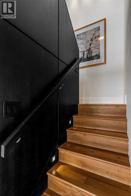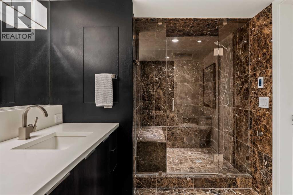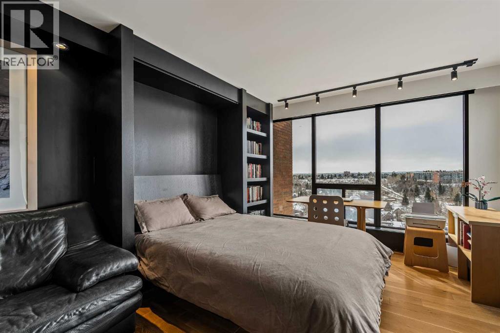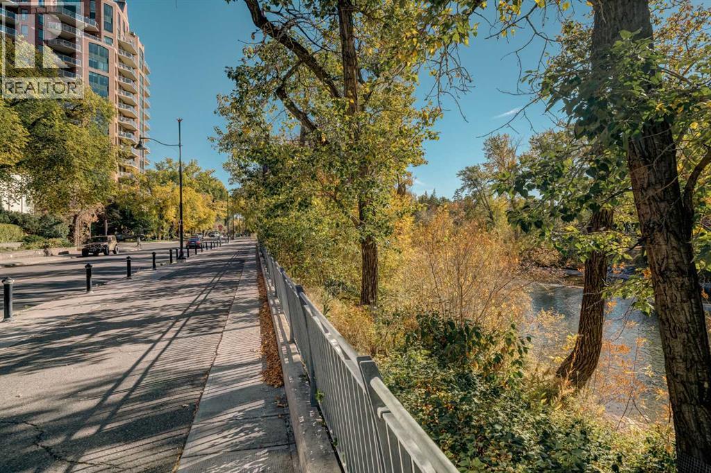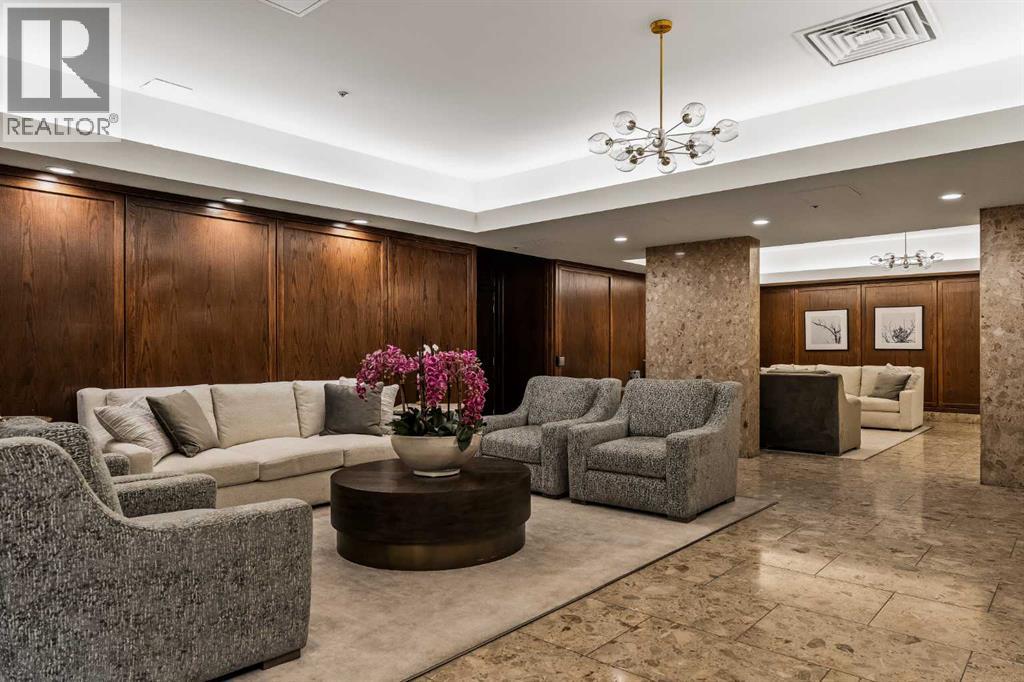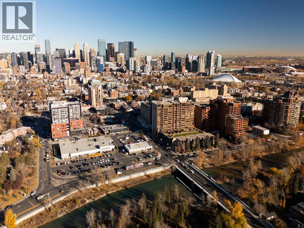 Architecturally renovated, this remarkable 2 storey penthouse delivers over 2,300 sq ft of refined living space with sweeping river valley and mountain views in the heart of Mission. Positioned within Roxboro House, one of Calgary’s most established concrete buildings, the home places river pathways, restaurants, cafés and downtown access within an easy walk while maintaining a quiet elevated setting above the city. Dramatic double height ceilings define the main living space where floor to ceiling windows frame expansive views and fill the interior with natural light throughout the day. Custom millwork and built-in library shelving introduce architectural character while a striking Bocci designer light installation creates a sculptural focal point above the living area. Marble fireplace surrounds add warmth and elegance while hardwood flooring extends throughout the home to create a cohesive and timeless finish. Entertaining flows easily between the living and dining areas where open sightlines toward the river valley form an impressive backdrop for gatherings. Quartz countertops and a full height quartz backsplash highlight the beautifully renovated kitchen where extensive custom cabinetry and a large central island support both daily routines and larger entertaining. Walk-in pantry storage keeps the space organized while built-in speaker wiring enhances the atmosphere for hosting. Adjacent bar cabinetry incorporates three wine fridges with capacity for approximately 750 bottles, creating a dedicated entertaining feature rarely found in condominium living. Upper level design introduces a flexible den retreat with its own fireplace and access to a second balcony, offering an ideal setting for a home office, lounge or private reading space overlooking the city skyline while an included Murphy bed allows the space to easily accommodate overnight guests when needed. Primary bedroom accommodations prioritize comfort and privacy through large windows, blackout blinds an d extensive custom storage solutions. Heated floors in the lavish ensuite provide everyday comfort while modern fixtures enhance the spa-inspired atmosphere. Air conditioning supports year-round comfort and upper level laundry adds everyday convenience. Two private balconies extend the living space outdoors while showcasing panoramic mountain and river views. Tandem underground parking accommodates 2 vehicles and an assigned storage unit adds valuable extra space. Roxboro House residents enjoy secure entry with front desk service along with exceptional amenities including an indoor pool, hot tub, sauna, fitness room, woodworking shop, library and billiards lounge, party room and a beautifully landscaped sky terrace with BBQ areas and outdoor gathering spaces. Mission remains one of Calgary’s most vibrant inner-city neighbourhoods where river pathways, parks, restaurants and boutique shopping create an exceptional walkable lifestyle just minutes from downtown. (id:49203)