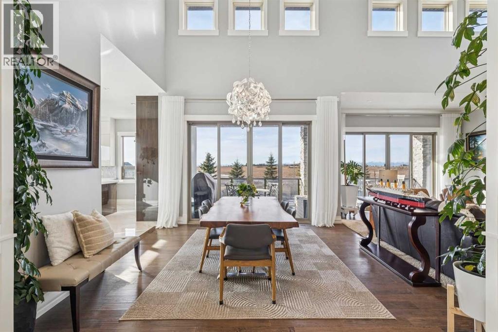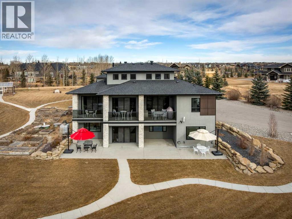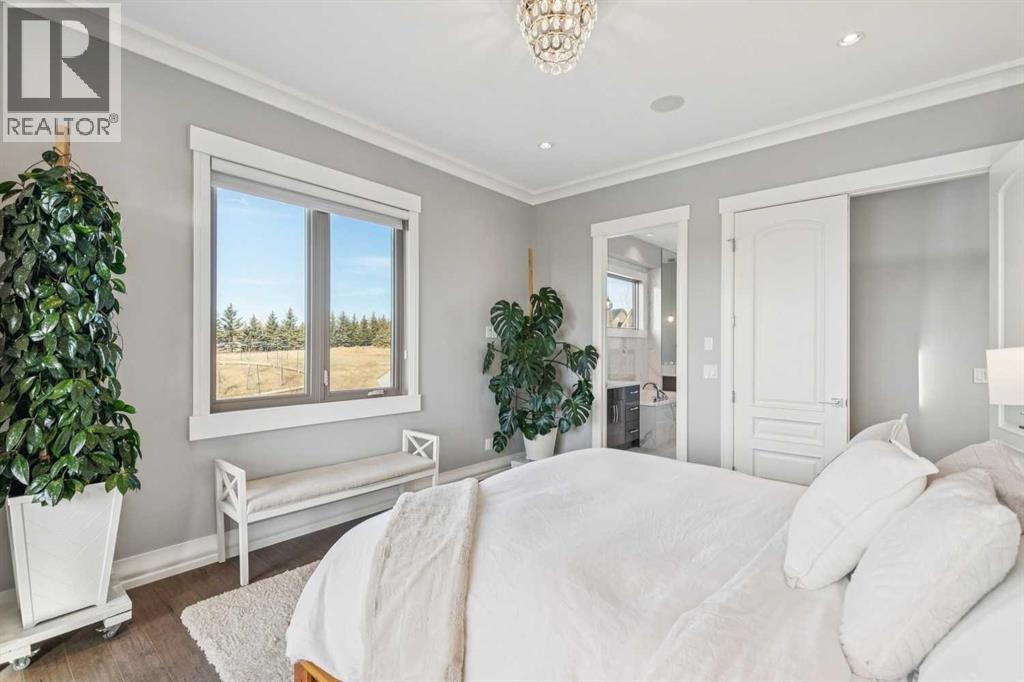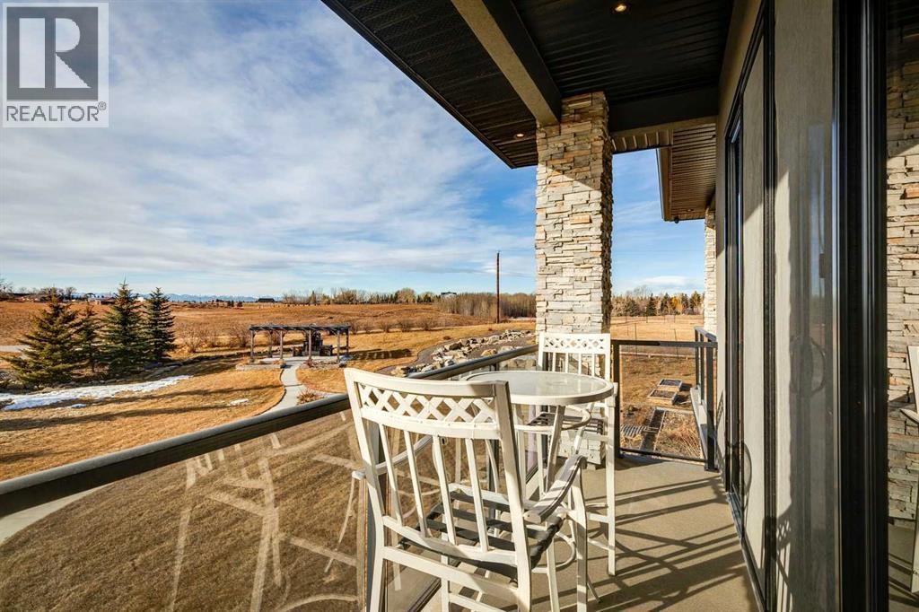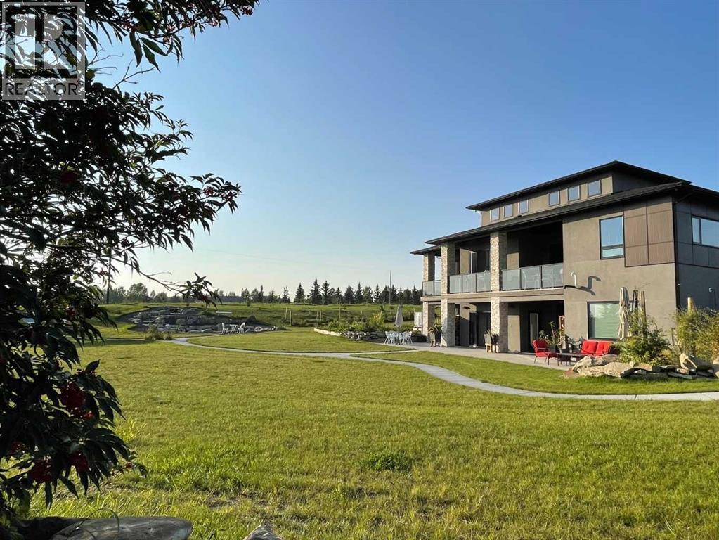 Set on 2 beautifully landscaped acres, this exceptional country residential estate offers a rare blend of luxury construction, high-end mechanical systems, & thoughtfully designed outdoor living, all just 20 minutes from downtown Calgary w/ quick access west to the mountains & positioned to capture breathtaking mountain views, including views enjoyed directly from your kitchen & dining table. The professionally landscaped grounds (completed 4 yrs ago for $110,000) showcase a stunning waterfall feature, rock garden, expansive garden beds, mature fruit orchard w/ apple, cherry, plum, & pear trees, plus saskatoons & raspberries, along w/ a greenhouse & an exterior wood-burning fireplace seating area under a pergola w/ sunshade, all connected by concrete pathways for enhanced accessibility. The property also offers room to park 6 vehicles inside plus an exceptional amount of additional exterior parking, ideal for guests, recreational vehicles, & equipment. The home itself is flooded w/ natural light through extensive windows & features 10-foot ceilings w/ vaulted ceilings in the main living area, solid core interior doors throughout, oak hardwood flooring, in-floor heat, air conditioning (new in 2024 for $10,000), a 2-zone furnace, boiler, & new windows and insulation added in 2025 ($50,000) for improved energy efficiency, w/ the entire home professionally repainted in 2024. The main level offers 2 bedrooms & 2 full bathrooms w/ quartz countertops throughout, including a luxurious primary retreat w/ mountain views, a large walk-in closet w/ built-in shelving, & an elegant ensuite w/ dual sinks, custom tiled shower, & jetted tub, while the living room is anchored by a gas fireplace w/ an oversized tiled feature wall. The chef-inspired kitchen is finished w/ quartz countertops, ceiling-height soft-close cabinetry, under-cabinet lighting, a 5-burner gas stove, in-wall oven, Bosch dishwasher, prep sink, large island, & a spacious walk-in pantry, complemented by a functional mudroom w/ sink & secondary laundry hook-up. The fully developed walk-out basement features a 2nd primary suite w/ covered patio access, dual sinks, quartz counters, tile flooring, oversized tiled shower, jetted tub, & a large custom walk-in closet, plus 2 additional bedrooms (3 total in the basement), a full bathroom w/ steam shower, bench seating, & quartz counters, a wine room, basement laundry w/ shelving, cupboards, & a 2024 dryer, & an expansive recreation space complete w/ surround sound, gas fireplace, & a wet bar w/ quartz counters & light that changes colour. Multiple covered balconies include 2 gas BBQ hook-ups & exterior Bluetooth speakers. The attached quad garage is insulated, drywalled, features 12-foot ceilings, & includes an EV charging panel (charger excluded), while the detached RV shop ($110,000) offers 24x36 dimensions, 14-foot ceilings, a 12-foot RV door, loft, 100-amp service, & 220V power, making this property an exceptional offering in a prestigious price category. (id:49203)