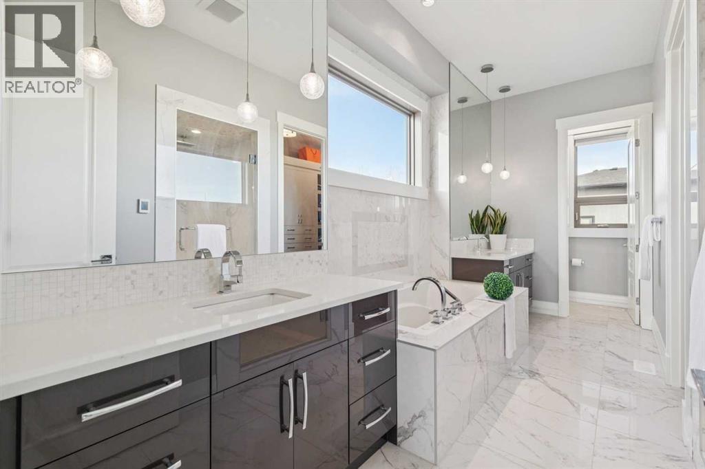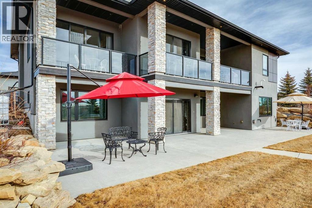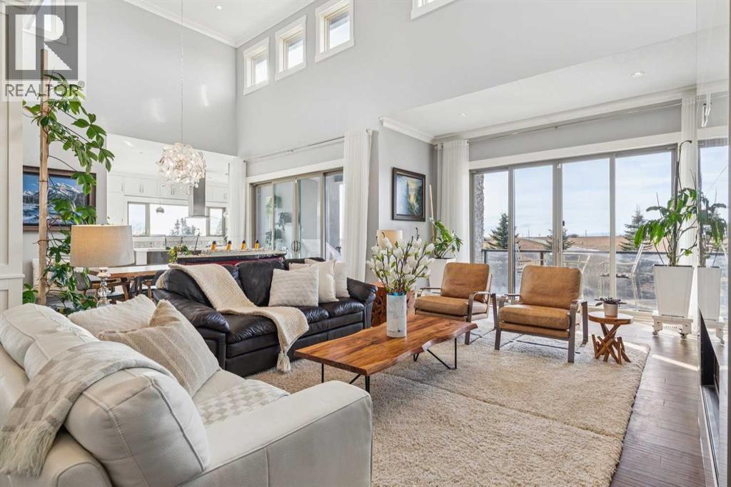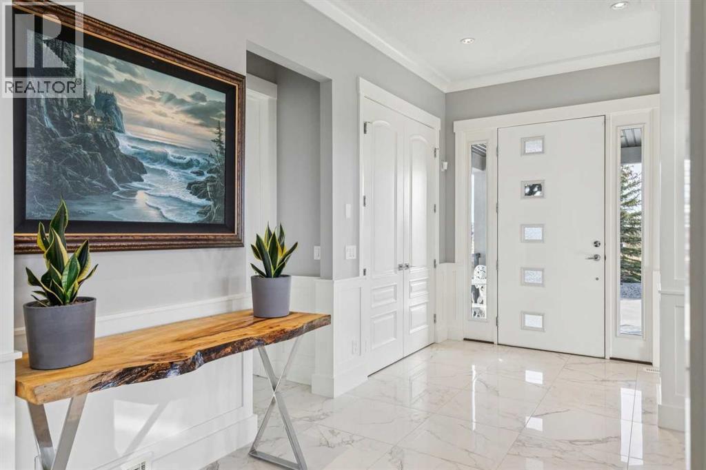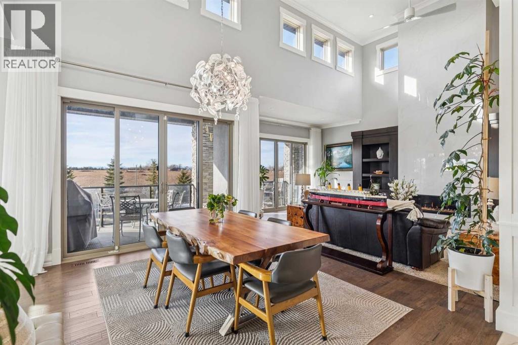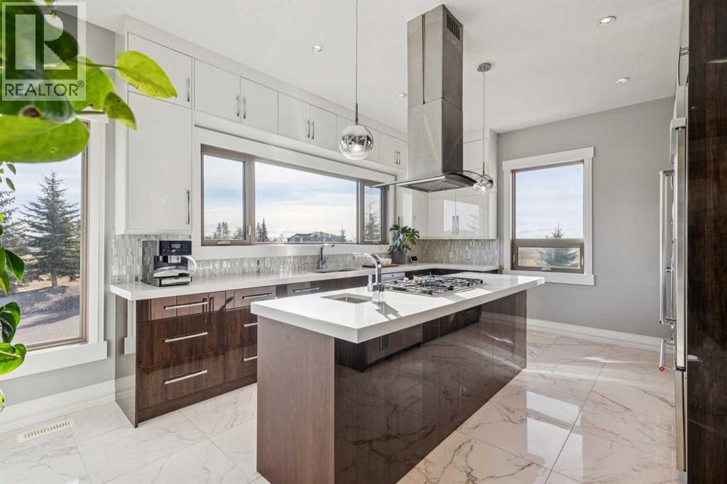 Set on 2 beautifully landscaped acres, this exceptional country residential estate offers a rare blend of luxury construction, high-end mechanical systems, & thoughtfully designed outdoor living, all just 20 minutes from downtown Calgary w/ quick access west to the mountains & positioned to capture breathtaking mountain views, including views enjoyed directly from your kitchen & dining table. The professionally landscaped grounds (completed 4 yrs ago for $110,000) showcase a stunning waterfall feature, rock garden, expansive garden beds, mature fruit orchard w/ apple, cherry, plum, & pear trees, plus saskatoons & raspberries, along w/ a greenhouse & an exterior wood-burning fireplace seating area under a pergola w/ sunshade, all connected by concrete pathways for enhanced accessibility. The property also offers room to park 6 vehicles inside plus an exceptional amount of additional exterior parking, ideal for guests, recreational vehicles, & equipment. The home itself is flooded w/ natural light through extensive windows & features 10-foot ceilings w/ vaulted ceilings in the main living area, solid core interior doors throughout, oak hardwood flooring, in-floor heat, air conditioning (new in 2024 for $10,000), a 2-zone furnace, boiler, & new windows and insulation added in 2025 ($50,000) for improved energy efficiency, w/ the entire home professionally repainted in 2024. The main level offers 2 bedrooms & 2 full bathrooms w/ quartz countertops throughout, including a luxurious primary retreat w/ mountain views, a large walk-in closet w/ built-in shelving, & an elegant ensuite w/ dual sinks, custom tiled shower, & jetted tub, while the living room is anchored by a gas fireplace w/ an oversized tiled feature wall. The chef-inspired kitchen is finished w/ quartz countertops, ceiling-height soft-close cabinetry, under-cabinet lighting, a 5-burner gas stove, in-wall oven, Bosch dishwasher, prep sink, large island, & a spacious walk-in pantry, complemented by a functional mudroom w/ sink & secondary laundry hook-up. The fully developed walk-out basement features a 2nd primary suite w/ covered patio access, dual sinks, quartz counters, tile flooring, oversized tiled shower, jetted tub, & a large custom walk-in closet, plus 2 additional bedrooms (3 total in the basement), a full bathroom w/ steam shower, bench seating, & quartz counters, a wine room, basement laundry w/ shelving, cupboards, & a 2024 dryer, & an expansive recreation space complete w/ surround sound, gas fireplace, & a wet bar w/ quartz counters & light that changes colour. Multiple covered balconies include 2 gas BBQ hook-ups & exterior Bluetooth speakers. The attached quad garage is insulated, drywalled, features 12-foot ceilings, & includes an EV charging panel (charger excluded), while the detached RV shop ($110,000) offers 24x36 dimensions, 14-foot ceilings, a 12-foot RV door, loft, 100-amp service, & 220V power, making this property an exceptional offering in a prestigious price category. (id:49203)