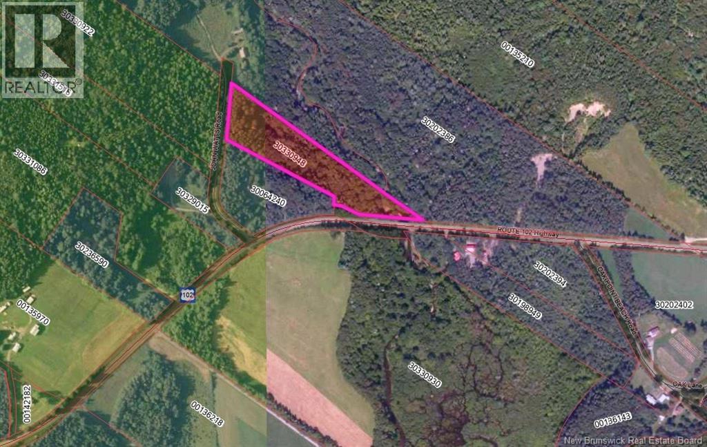 This beautiful 5.6 acre parcel of treed land offers the perfect blend of privacy, location, and opportunity. With frontage along Route 102 and an impressive 99 meters of road frontage on John Watts Road, this property provides flexibility for access and design, whether you're envisioning your dream family home or exploring the potential for a small development. Just minutes from the St. John River and Oak Point Beach & Campground, you'll find recreation while still being within easy reach of town amenities. Let your imagination run wild - this is where your next chapter begins. (id:49203)