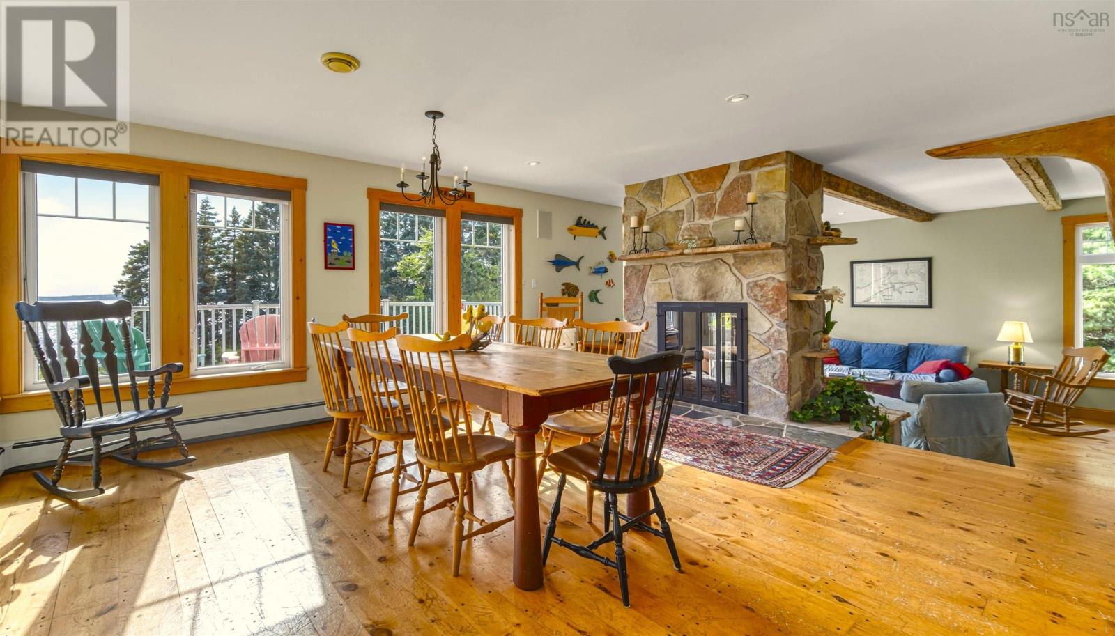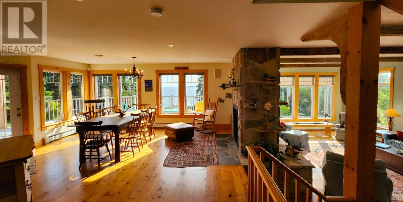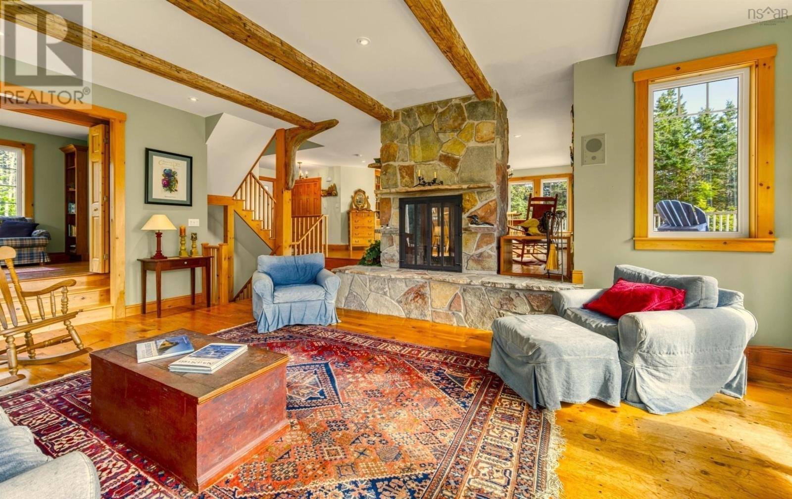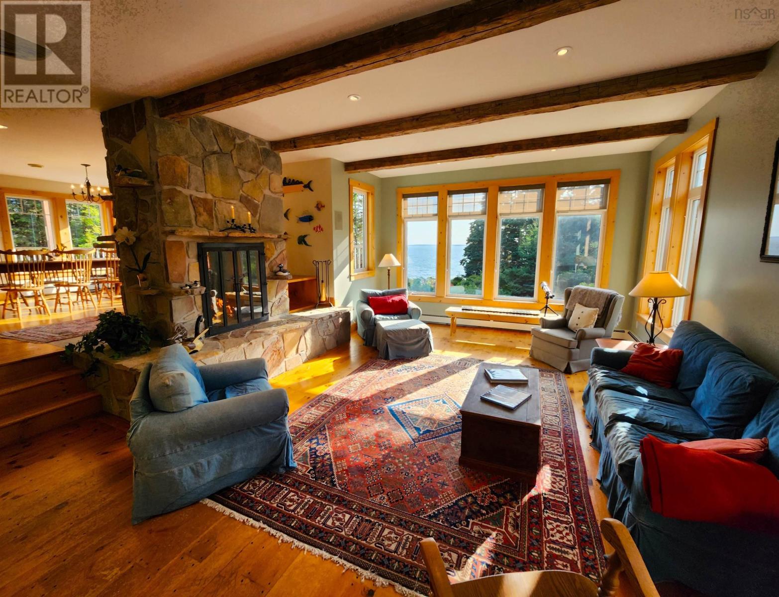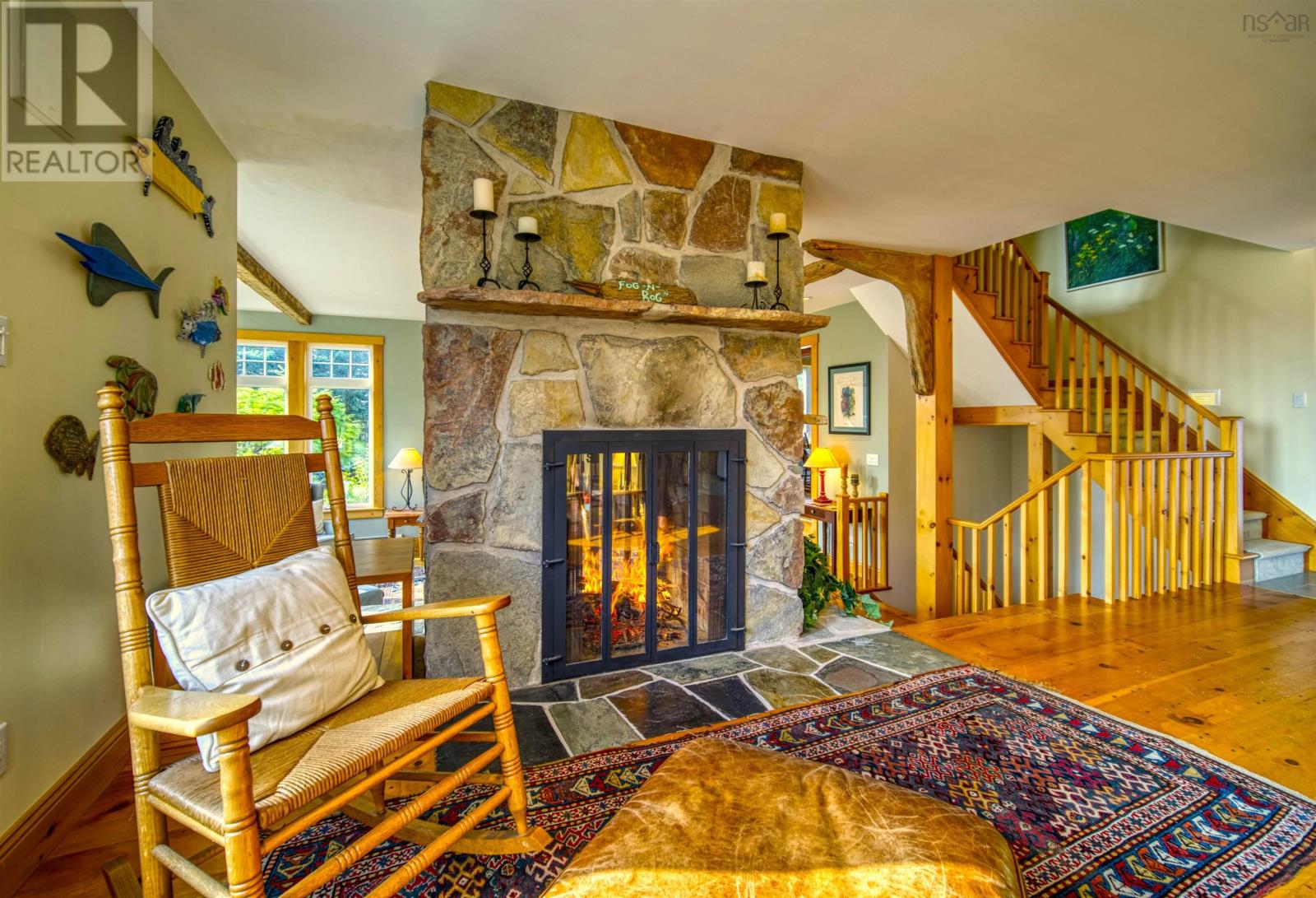 This timeless custom designed retreat , sequestered within a matured natural landscape, offers south-west views to the bold, open Atlantic. This enclave has been a cherished property with its tree-lined paths that gently enraptures your heart as it has its sole owners since its creation. Entering the main foyer one's eyes are drawn to the garden and sea views through an expanse of windows. A generous dining-room and kitchen space are grounded by a natural-stone, double fireplace lending warmth at this home's heart. The sunken living-room has an elevated sitting area to one side and in conjunction with the open kitchen-dining make this property ideal for family receptions. A mudroom laundry space and pantry off the kitchen reach to an attached double garage. A broad, open staircase provides access to the primary bedroom suite - encompassing an entire floor. This suite has large panoramic windows framed beneath a window seat and also features a gas fireplace. The tower loft, with an abundance of natural light, serves as an inviting studio or library. The large principle ensuite contains a walk in closet, soaker tub and separate tile shower and from the principle suite, a private deck would surely call for morning coffee. At the lower level, a large family room with wood stove offers full walkout to a custom-designed, brick patio. At this same level, two large bedrooms are complimented by two full baths. A utility room that completes this level. A charming, large, three bedroom guest house, tucked away off the main driveway is framed by forest. An open-concept living-dining space off the kitchen with a gas fireplace makes for the ideal retreat for visiting family. The primary bedroom with ensuite and laundry room complete this main floor. Two additional bedrooms with baths perfectly compliment this guest retreat. Though constructed in our century, this property and its stunning setting conveys the sentiments of another time. A rare opportunity. (id:49203)