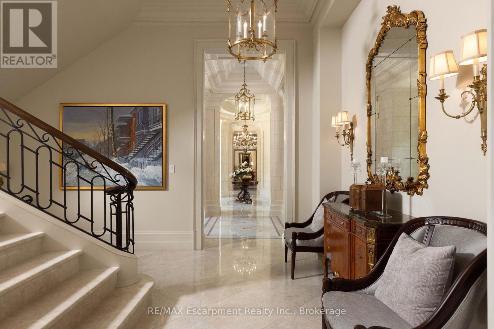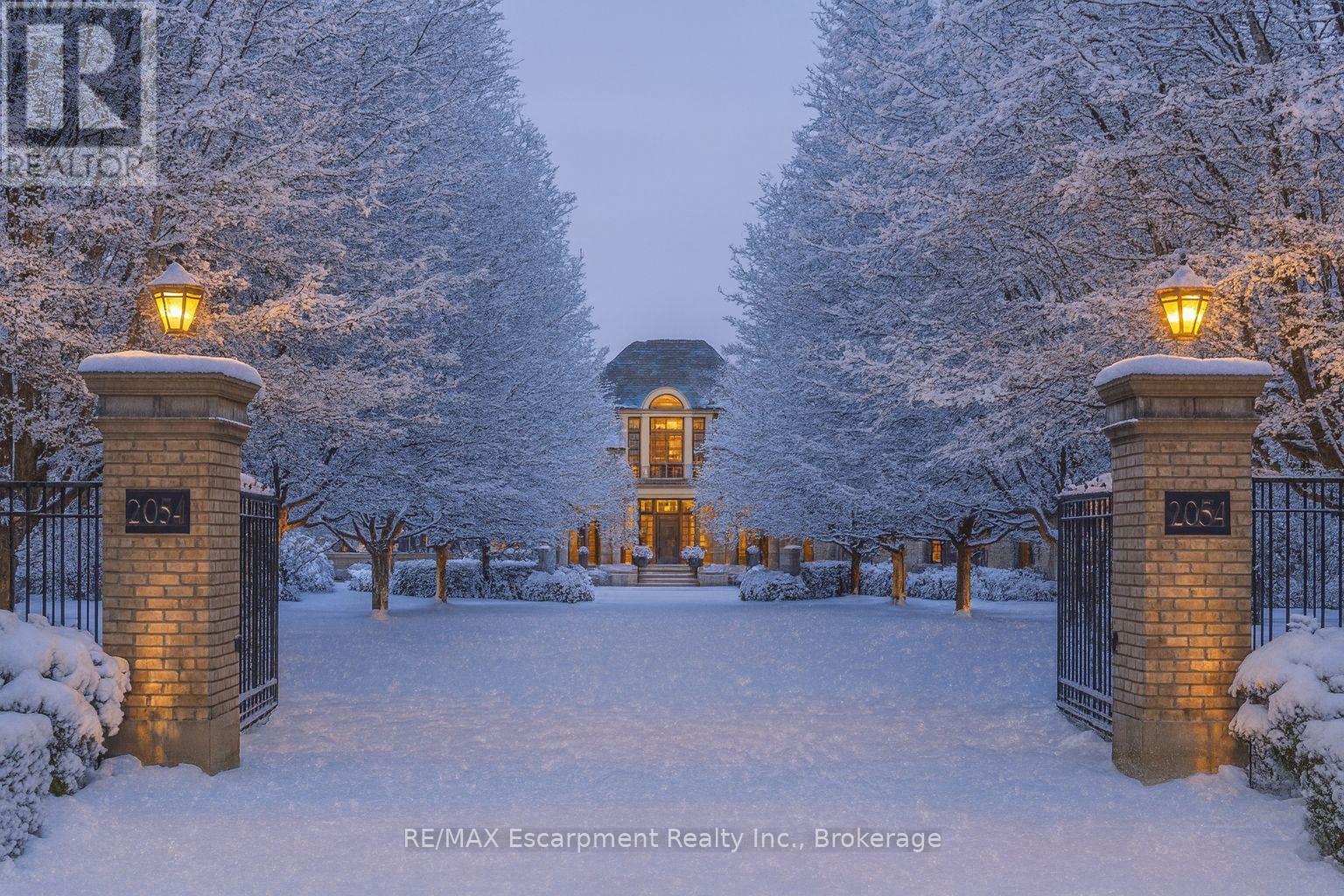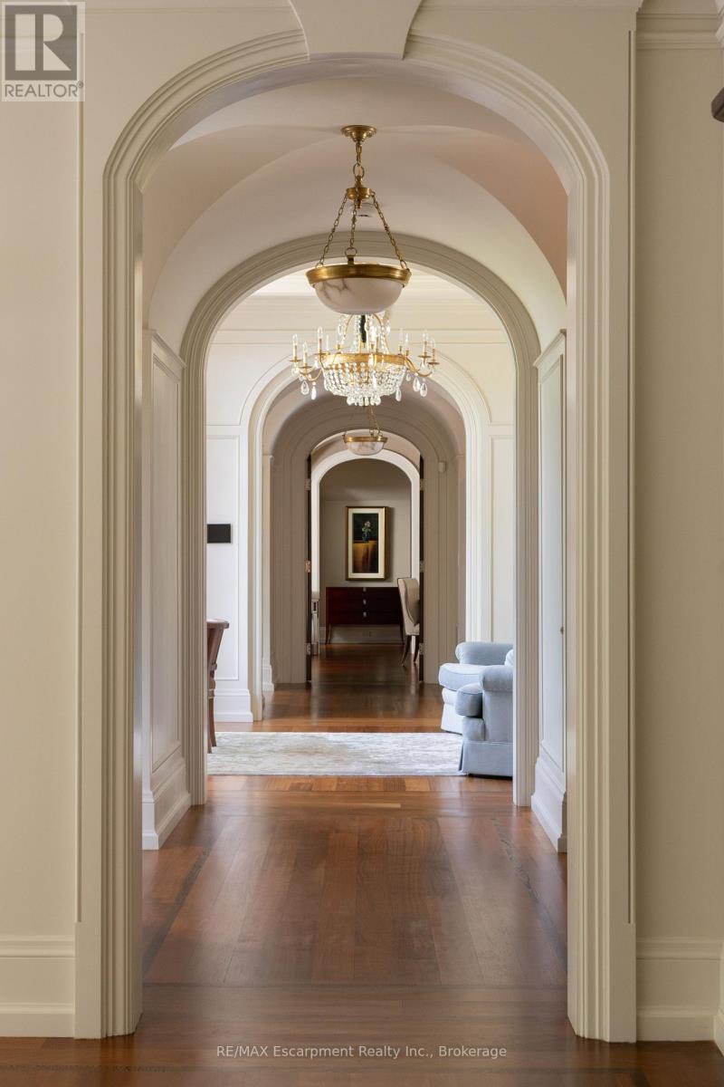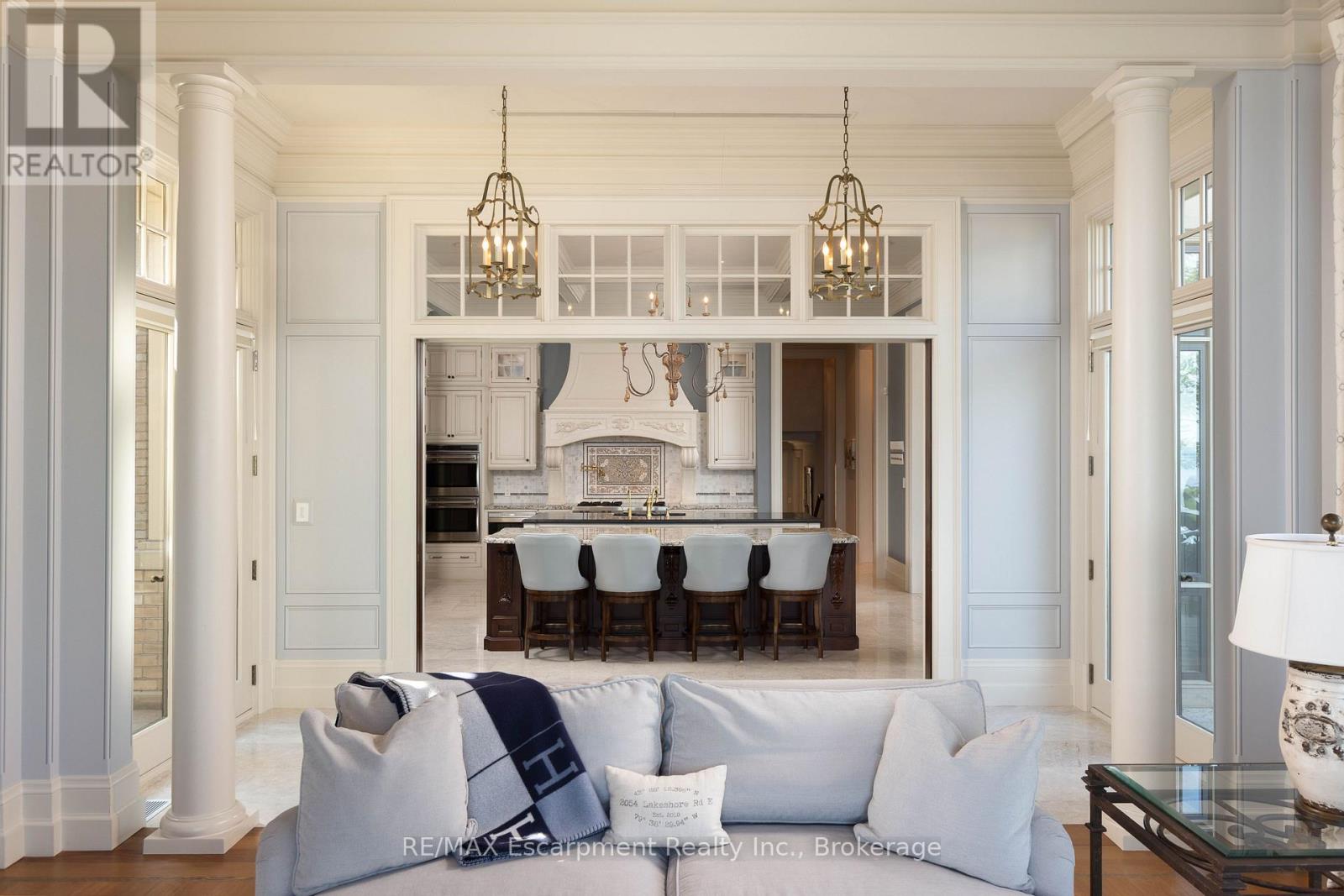 2054 Lakeshore Rd. East is one of Oakville's finest lakefront estates.Situated on 1.6 acres & 166 ft of pristine shoreline, complete with deck & stairway access to the water. Designed by renowned architect Gren Weis & brought to life by the exceptional craftsmanship of Coulson Fine Homes.This magnificent 7-bdrm, 13-bath home spans an impressive 19,210 sq ft living space.Step into the grand formal entrance where limestone cast walls create a dramatic first impression serving as a prelude to the extraordinary spaces beyond.The residence showcases 12 ft ceilings on the main level, Brazilian walnut flooring thru-out & custom cabinetry adorns this remarkable home.The estate features an expansive living & dining rm w/breathtaking water views, perfect for intimate gatherings or grand celebrations.Step outside to the covered terrace where you can relax to the sounds of the "Bellagio" inspired fountains & waterfall.The gourmet open-concept kit.flows effortlessly into the fam.rm where water views & fp create a relaxed & comfortable space.The lower-level transforms into an entertainer's paradise, w/a state-of-the-art home theater, gym w/direct access to the infinity edge pool,steam room,golf simulator, wine cellar, billiards area w/rec room & catering kit.A private 2-bdrm nanny suite w/sep. entrance provides additional flexibility.An elevator gives you convenient access to all 5 levels of this thoughtfully designed home.The outdoors offers multiple entertaining areas nestled within the manicured landscaped grounds, the lakefront deck & poolside.The power screened sunroom offers 3 season enjoyment.His & Hers double car garages to accommodate 4 vehicles w/additional parking for 20 more on the circular driveway & auxiliary prkng areas-perfect for hosting memorable events.This waterfront estate represents more than just a home it's a lifestyle statement and every detail is curated to create an environment of uncompromising luxury and comfort. LUXURY CERTIFIED. (id:49203)