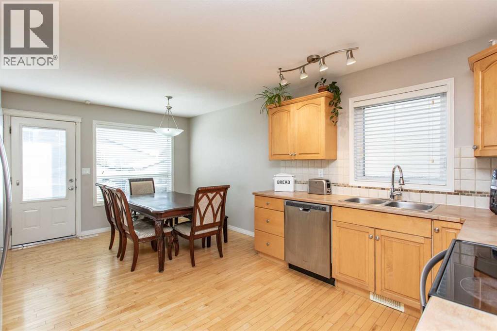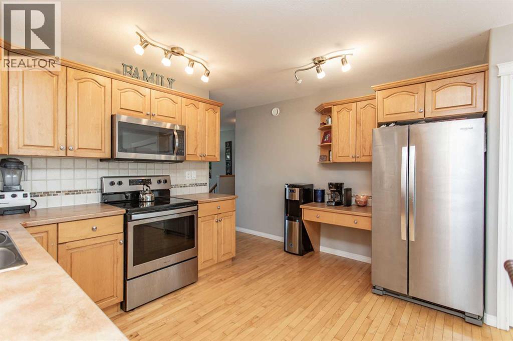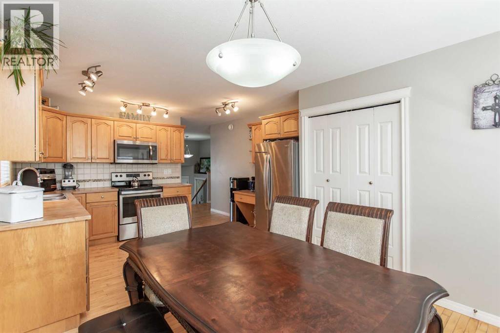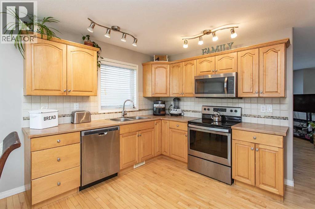 Nicely appointed bi level ideally suited for a family looking for the perfect fit in a home. Situated just steps away from a huge green space with a park area, playground and skating rink for the kids to enjoy. Fully developed with 5 bedrooms and an open, spacious plan for everyone to move around in. Maple hardwood floors enhance the main floor design with a large front sitting room with picture window. The large kitchen and dining area offers an abundance of maple cabinetry which is accented by the stainless steel appliances, coffee bar area ideal for the grab and go mornings plus a family size eating area perfect for the home time gatherings. The generous Primary bedroom is large enough for a King size bed plus additional furniture, full walk in closet plus a private three piece en suite. The finished basement is excellent for entertaining. Massive family room with games area is ideal for media space and socializing. Two larger guest bedrooms plus an additional four piece bath makes things easy for extended family or the stay at home students. Finished laundry space even offers room for extra storage and shelf space. Cozy underfloor heat for the winter plus cooling AC for the summer are two comfort features you will love during the seasons. Venture outside and enjoy the fully fenced and landscaped yard. Large deck offers a gas line for bbq or patio heater. Room for RV parking if needed with swing gate already in place. The oversize attached garage is finished with plenty of room for vehicle protection and extra storage space. Home is also situated in an ideal location for neighborhood amenities plus a number of schools are right in the immediate area. (id:49203)