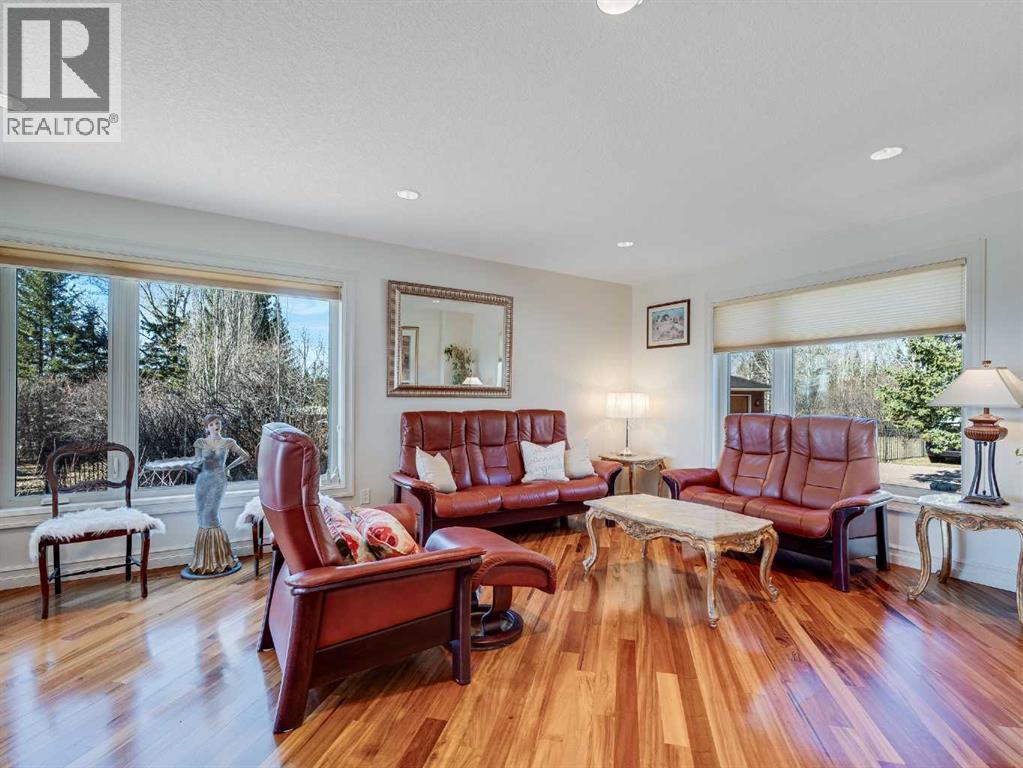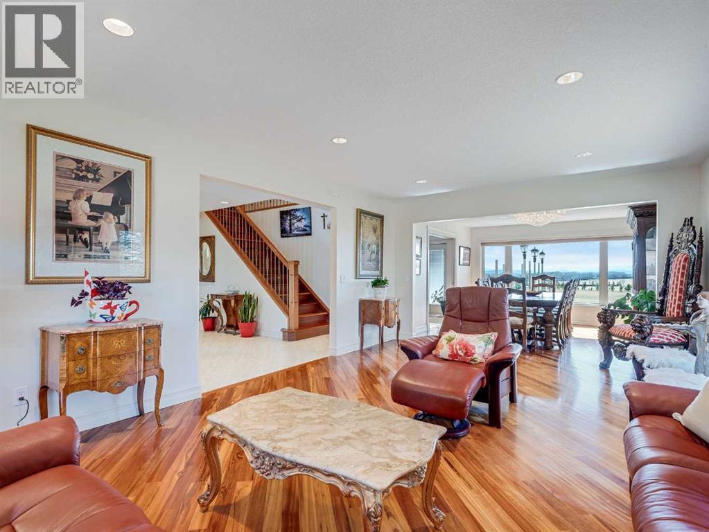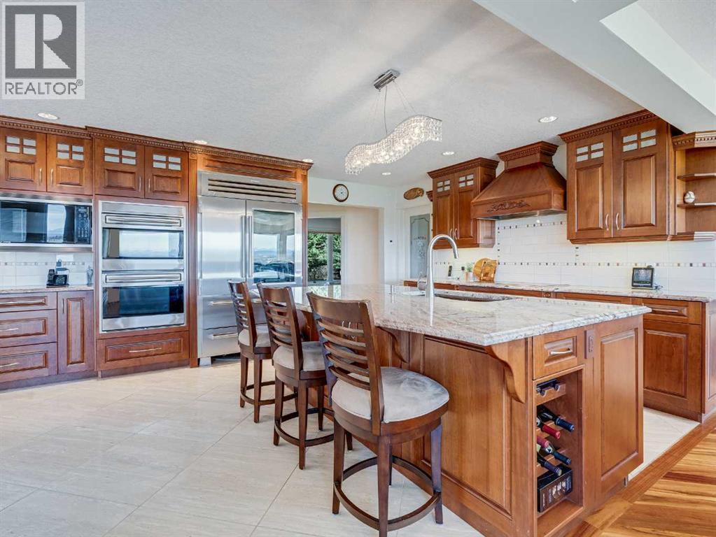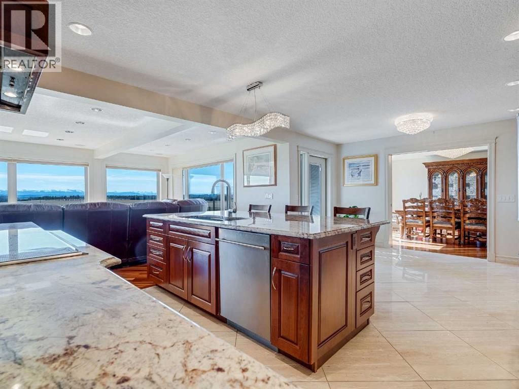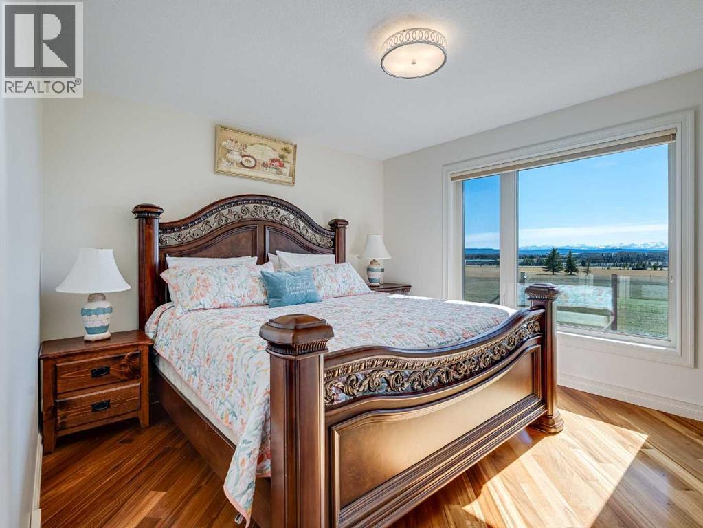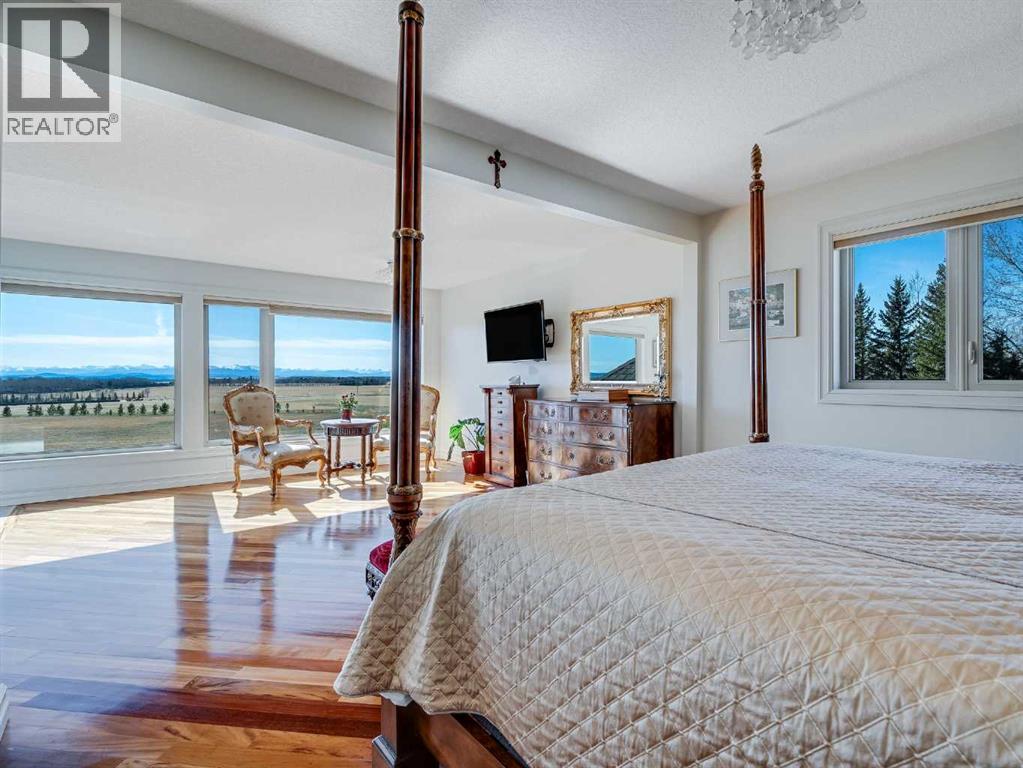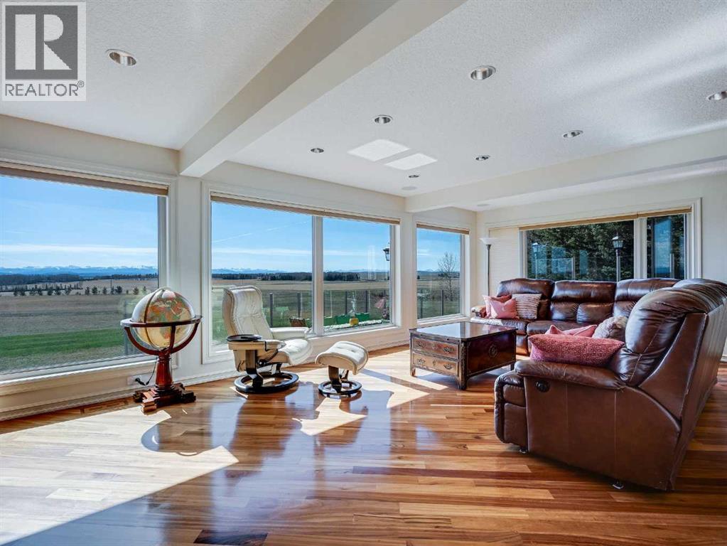 Rare luxury estate on 4.72 acres in one of Springbank’s most coveted locations. Enjoy unobstructed Rocky Mountain views while being minutes to Calgary and steps to Springbank School, the Edge School, arenas, daycare, church, and the community centre.A gated entrance opens to a circular driveway, quad detached garage, generous guest parking, manicured grounds, a walking garden, and mature trees. Built for longevity and low maintenance, the home features a full brick exterior, slate-style rubber roof (2011, transferable 50-yr warranty), triple-pane windows, 2x6 plywood sheathing, and all copper wiring. Country living is worry-free with a high-producing well, cistern, whole-home reverse osmosis system, UV purification, multi-stage filtration, and backup power systems.Inside, a grand foyer leads into elegant living and dining areas finished with site-finished Brazilian hardwood. The chef’s kitchen offers custom cabinetry, Sub-Zero/Wolf appliances, exotic granite, induction cooktop, dual wall ovens, porcelain sink, large working/eating island, and a walk-in pantry, with direct access to a spacious view deck ideal for outdoor dining.The main floor also includes a private suite with bedroom, bathroom, kitchenette, living area, and separate entrance—perfect for guests, extended family, or a nanny. Upstairs are three bedrooms including a stunning primary suite with panoramic horizon views, spa ensuite, and custom dressing room.The fully finished walkout level features expansive recreation areas, new laminate flooring, and flexible layout options. The lower level is protected with a Doug Lacey/Groundworks waterproofing system, two sump pumps, and a transferable dry-basement warranty. Additional mechanical upgrades include all new plumbing and fixtures (2011–2012), upgraded lighting, two high-efficiency furnaces, and a well-maintained septic system.A timeless, meticulously upgraded estate in an exceptional setting—book your private viewing today. (id:49203)