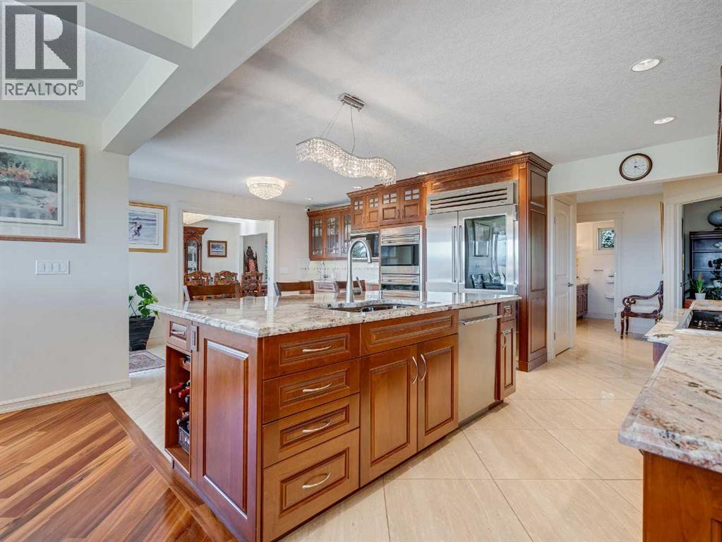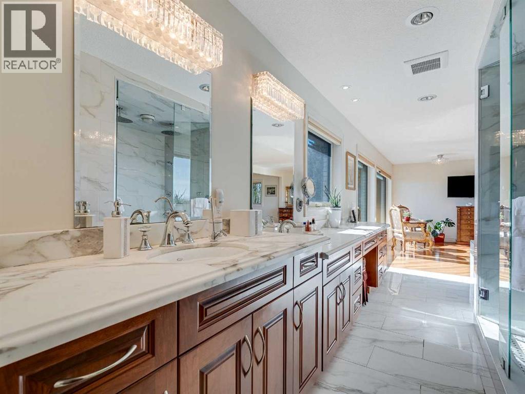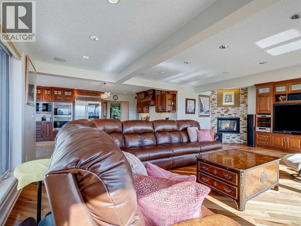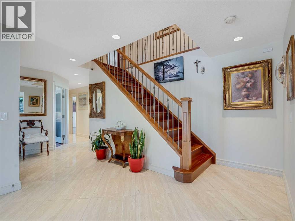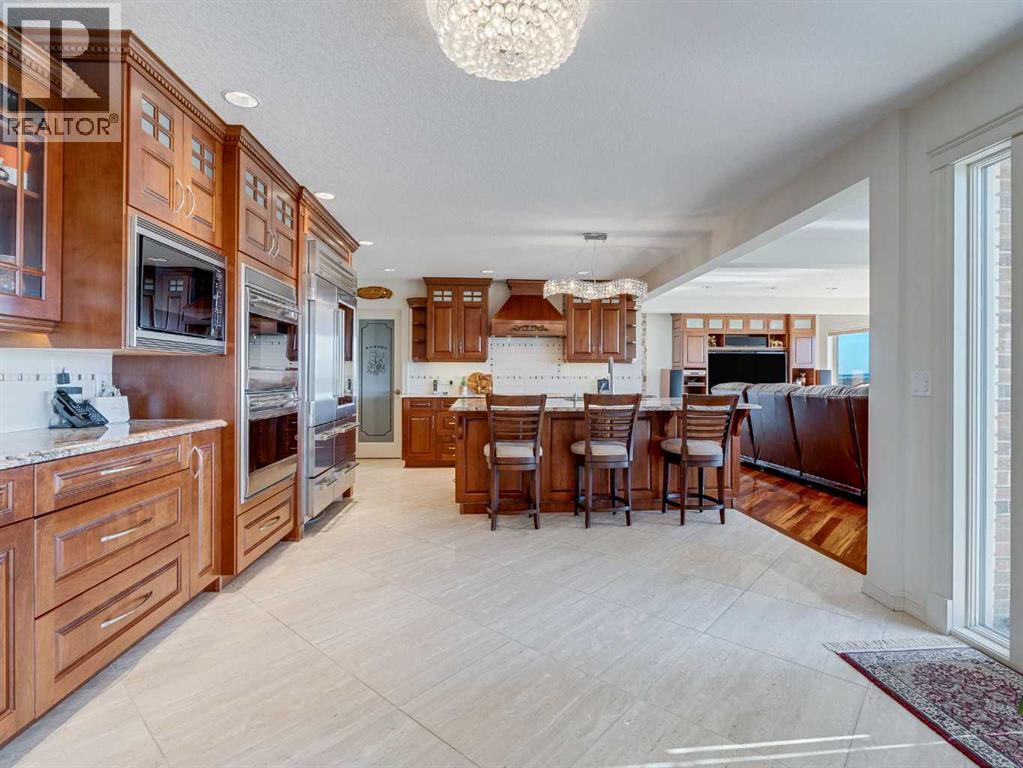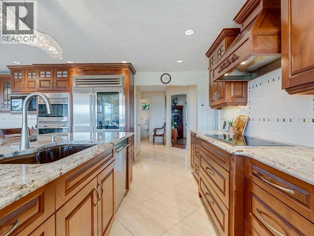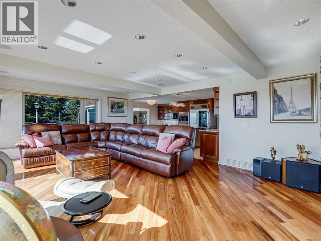 Rare luxury estate on 4.72 acres in one of Springbank’s most coveted locations. Enjoy unobstructed Rocky Mountain views while being minutes to Calgary and steps to Springbank School, the Edge School, arenas, daycare, church, and the community centre.A gated entrance opens to a circular driveway, quad detached garage, generous guest parking, manicured grounds, a walking garden, and mature trees. Built for longevity and low maintenance, the home features a full brick exterior, slate-style rubber roof (2011, transferable 50-yr warranty), triple-pane windows, 2x6 plywood sheathing, and all copper wiring. Country living is worry-free with a high-producing well, cistern, whole-home reverse osmosis system, UV purification, multi-stage filtration, and backup power systems.Inside, a grand foyer leads into elegant living and dining areas finished with site-finished Brazilian hardwood. The chef’s kitchen offers custom cabinetry, Sub-Zero/Wolf appliances, exotic granite, induction cooktop, dual wall ovens, porcelain sink, large working/eating island, and a walk-in pantry, with direct access to a spacious view deck ideal for outdoor dining.The main floor also includes a private suite with bedroom, bathroom, kitchenette, living area, and separate entrance—perfect for guests, extended family, or a nanny. Upstairs are three bedrooms including a stunning primary suite with panoramic horizon views, spa ensuite, and custom dressing room.The fully finished walkout level features expansive recreation areas, new laminate flooring, and flexible layout options. The lower level is protected with a Doug Lacey/Groundworks waterproofing system, two sump pumps, and a transferable dry-basement warranty. Additional mechanical upgrades include all new plumbing and fixtures (2011–2012), upgraded lighting, two high-efficiency furnaces, and a well-maintained septic system.A timeless, meticulously upgraded estate in an exceptional setting—book your private viewing today. (id:49203)