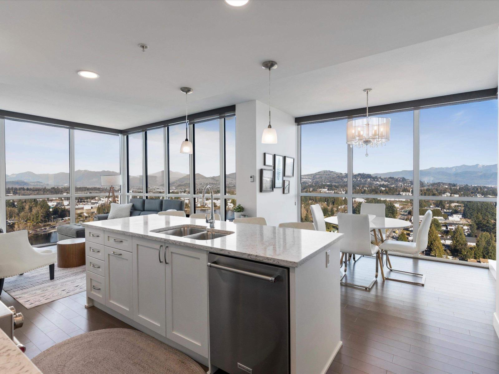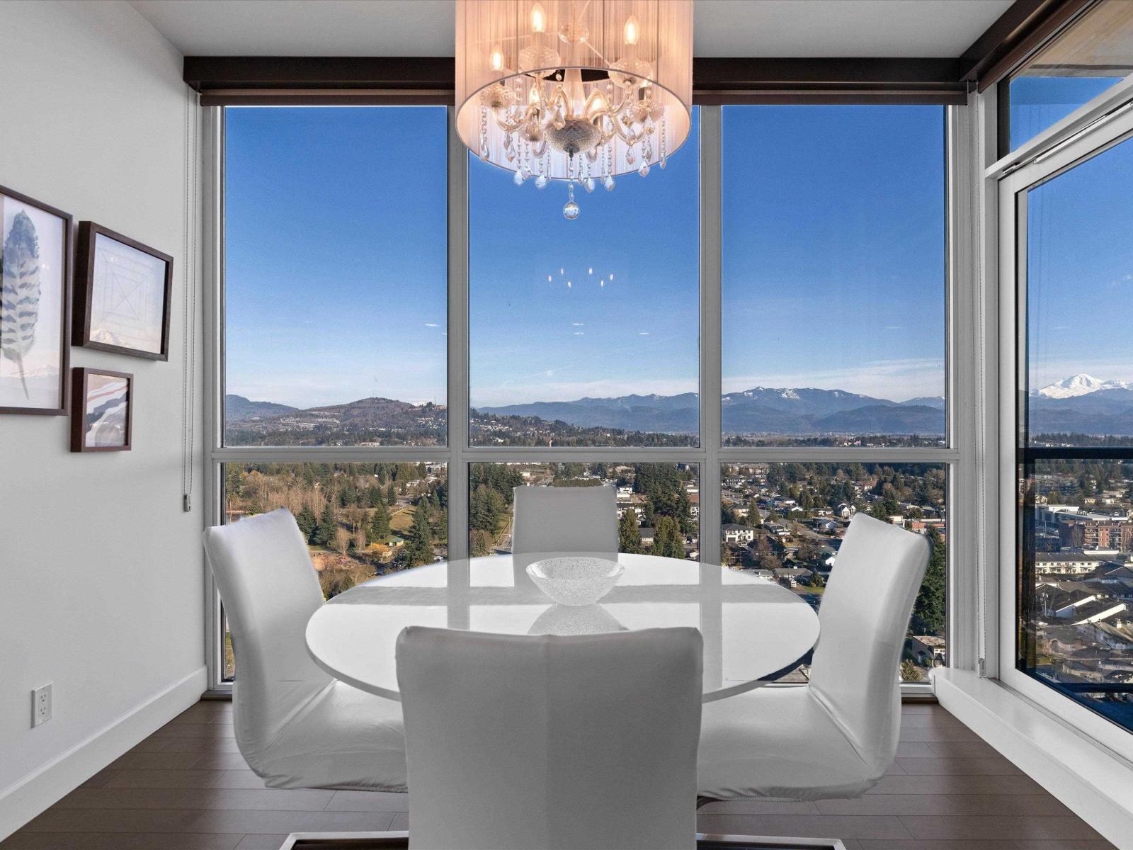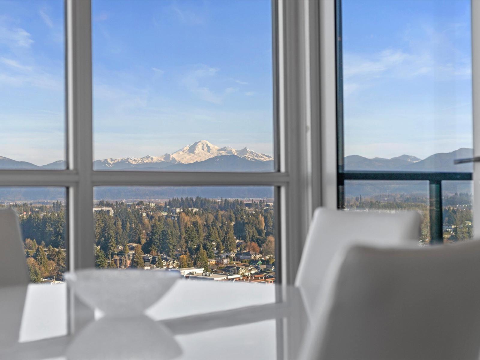 Perched high on the 23rd floor of The Mahogany, this exceptional 2 bedroom, 2 full bathroom residence offers breathtaking panoramic views rarely found anywhere in the Fraser Valley. From the white snow-capped peak of Mount Baker to the shimmering reflections off Mill Lake and the valley stretching beyond, the scenery is truly remarkable. Step onto your private balcony to take in the ever-changing landscape that is perfect for morning coffee or evening sunsets. Inside features stainless steel appliances and efficient geo heating and cooling for year-round comfort. Enjoy resort-style amenities including an indoor pool, hot tub, fitness centre, resident lounge, 2 guest suites, and secure parking, all steps from Mill Lake Park, the hospital, shopping, restaurants, and quick highway access. (id:49203)