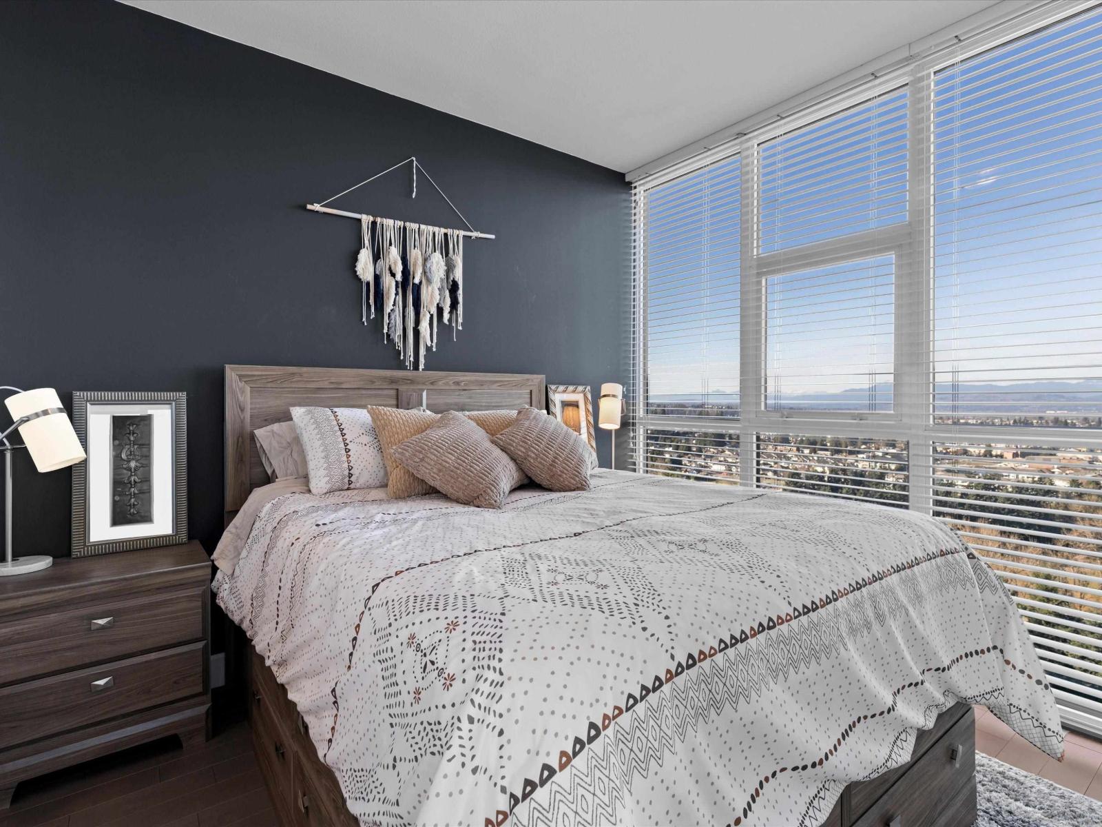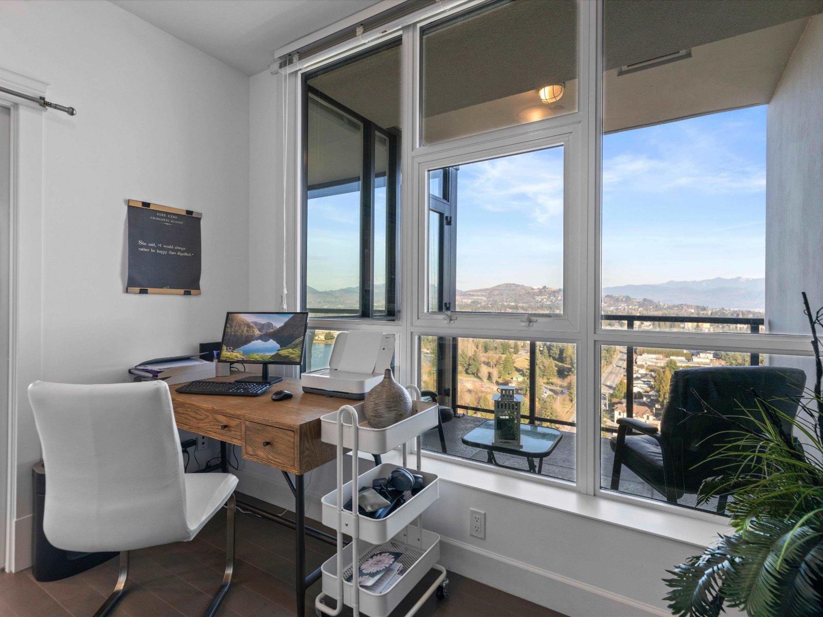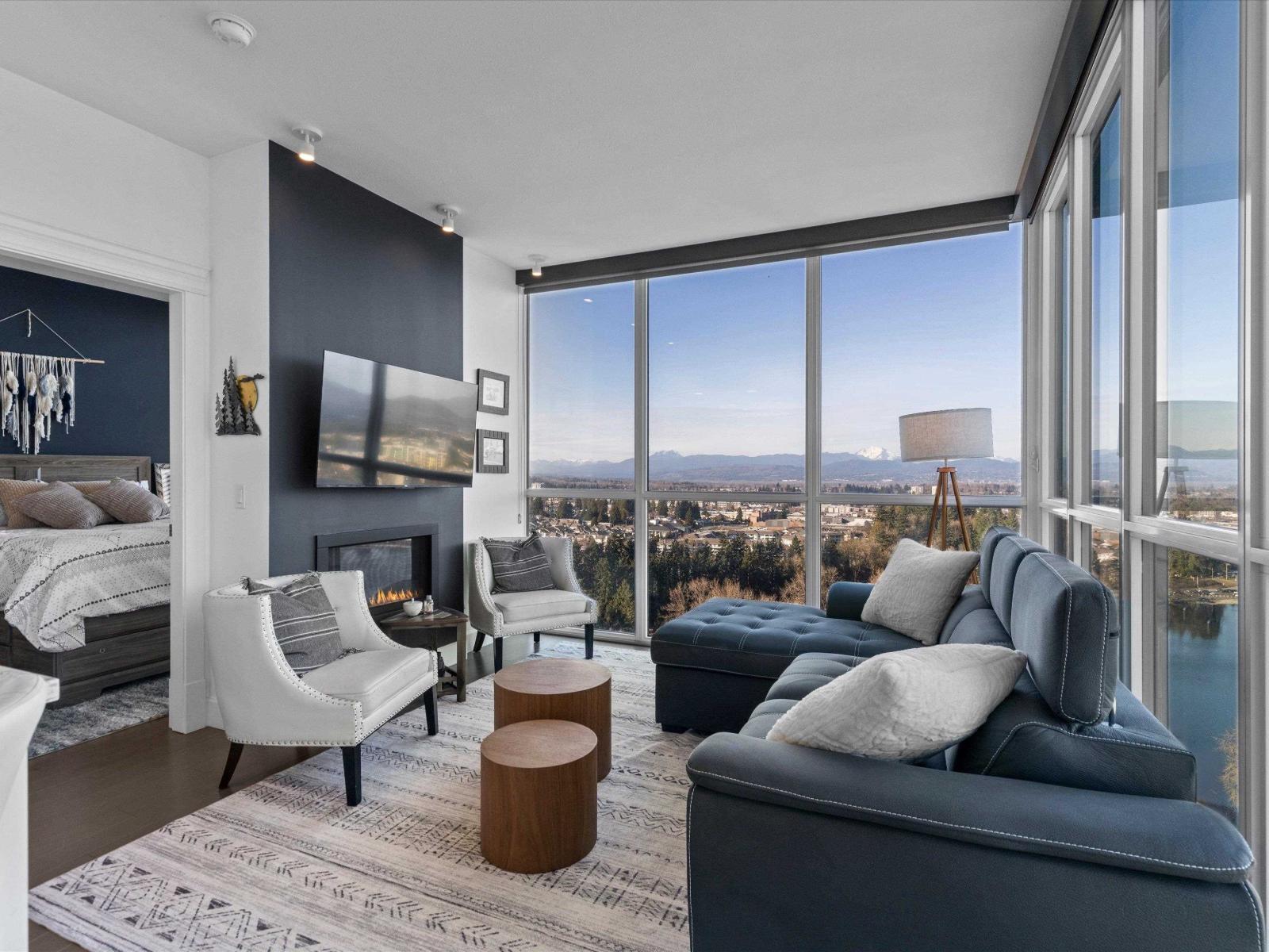 Perched high on the 23rd floor of The Mahogany, this exceptional 2 bedroom, 2 full bathroom residence offers breathtaking panoramic views rarely found anywhere in the Fraser Valley. From the white snow-capped peak of Mount Baker to the shimmering reflections off Mill Lake and the valley stretching beyond, the scenery is truly remarkable. Step onto your private balcony to take in the ever-changing landscape that is perfect for morning coffee or evening sunsets. Inside features stainless steel appliances and efficient geo heating and cooling for year-round comfort. Enjoy resort-style amenities including an indoor pool, hot tub, fitness centre, resident lounge, 2 guest suites, and secure parking, all steps from Mill Lake Park, the hospital, shopping, restaurants, and quick highway access. (id:49203)