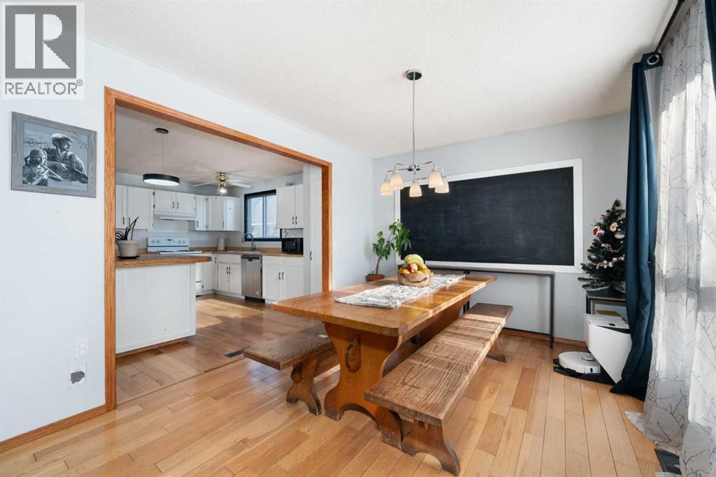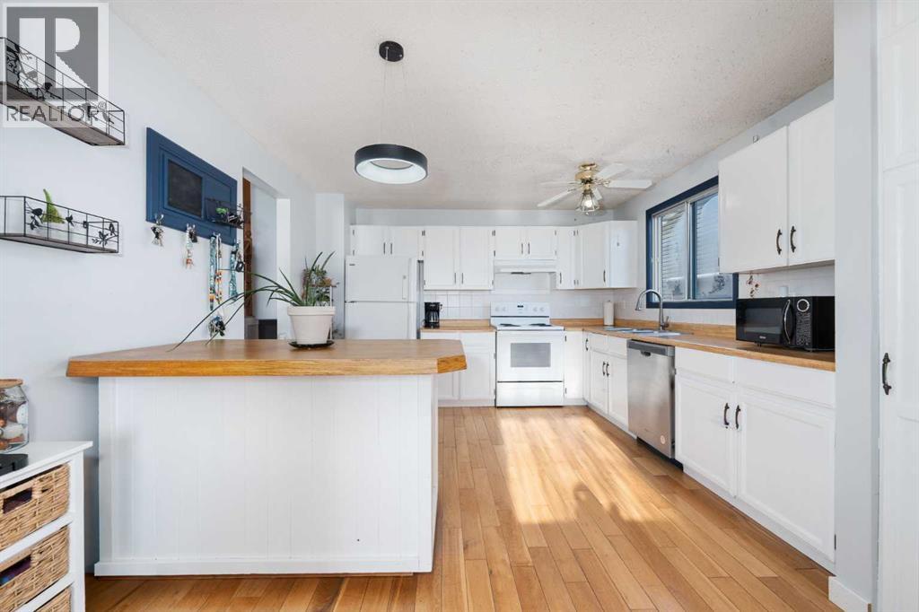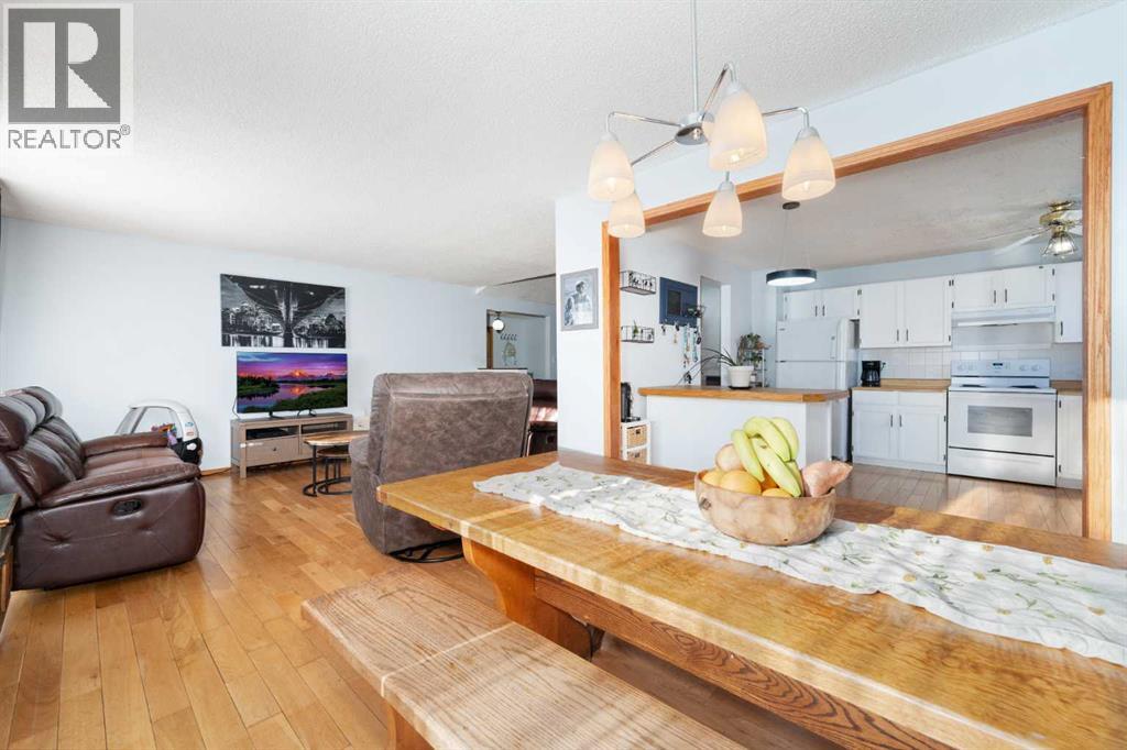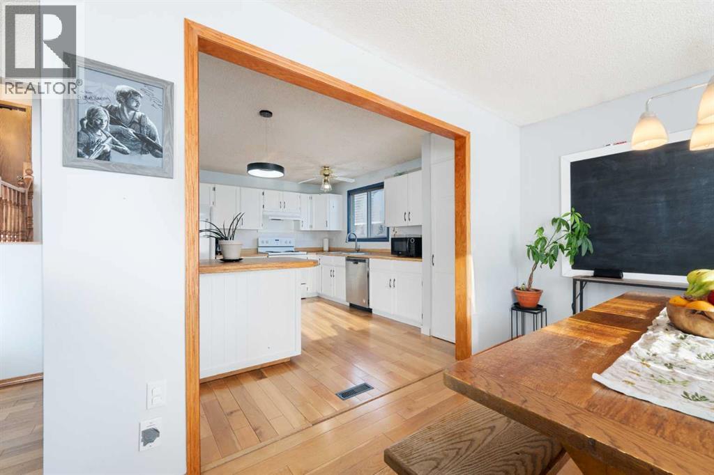 Welcome home to this charming and welcoming updated four-level split, perfectly situated on a quiet street in the desirable community of Maplewood, Strathmore. Offering spacious living, smart design, and fantastic outdoor amenities, this property is truly move-in ready and ideal for a growing family. As you enter, you'll be greeted by the bright and open concept main level, featuring a seamless flow between the living and dining areas, perfect for entertaining. The heart of the home is the large, functional kitchen featuring butcher block countertops and an abundance of cabinet and counter space for easy organization and meal prep. The upper floor provides a tranquil retreat with two generously spacious bedrooms and a shared, well-appointed 4-piece main bathroom, ensuring comfort for the whole family. The first lower level is dedicated to relaxation, featuring a sun-filled family room with patio doors offering direct, walk-out access to the beautifully landscaped backyard, blending indoor and outdoor living. This level also includes a bright third bedroom and a convenient 3-piece bathroom, ideal for guests or a home office. The lowest level—the fully finished basement—adds incredible value and versatility. It boasts a fourth distinct living space, a large recreation room perfect for games, and plenty of utility/storage space with dedicated laundry facilities. Recent updates include a brand new roof and shingles that were installed in July 2025 on both the house and the oversized garage. Furthermore, three new rear windows in the bedrooms feature triple-pane glass, significantly enhancing energy efficiency and comfort. The exterior is equally appealing. The property features an oversized single detached garage that is nearly tandem in depth, offering excellent storage potential. The extra-long driveway is a huge asset, providing parking for an additional three vehicles. Location is key, and this home delivers. Situated on a quiet street, you're literally around the c orner from a neighbourhood park and local schools, plus a fantastic sledding hill for winter fun. For year-round enjoyment, the Strathmore Aquatic Centre is just a couple of minutes away. This Maplewood gem perfectly balances comfortable family living with an ideal location and crucial modern updates. Don't miss your chance to call this exceptional property home! (id:49203)