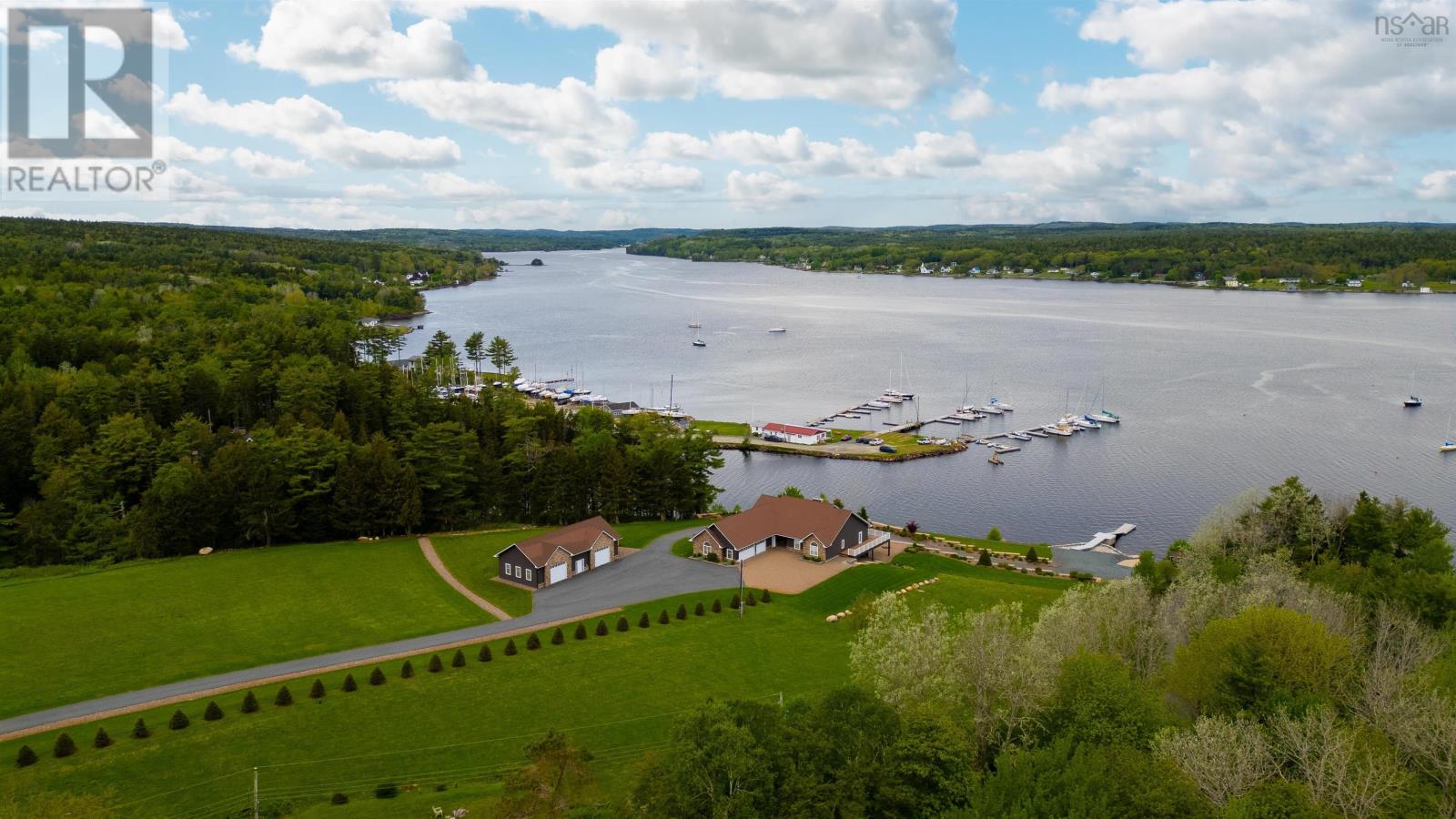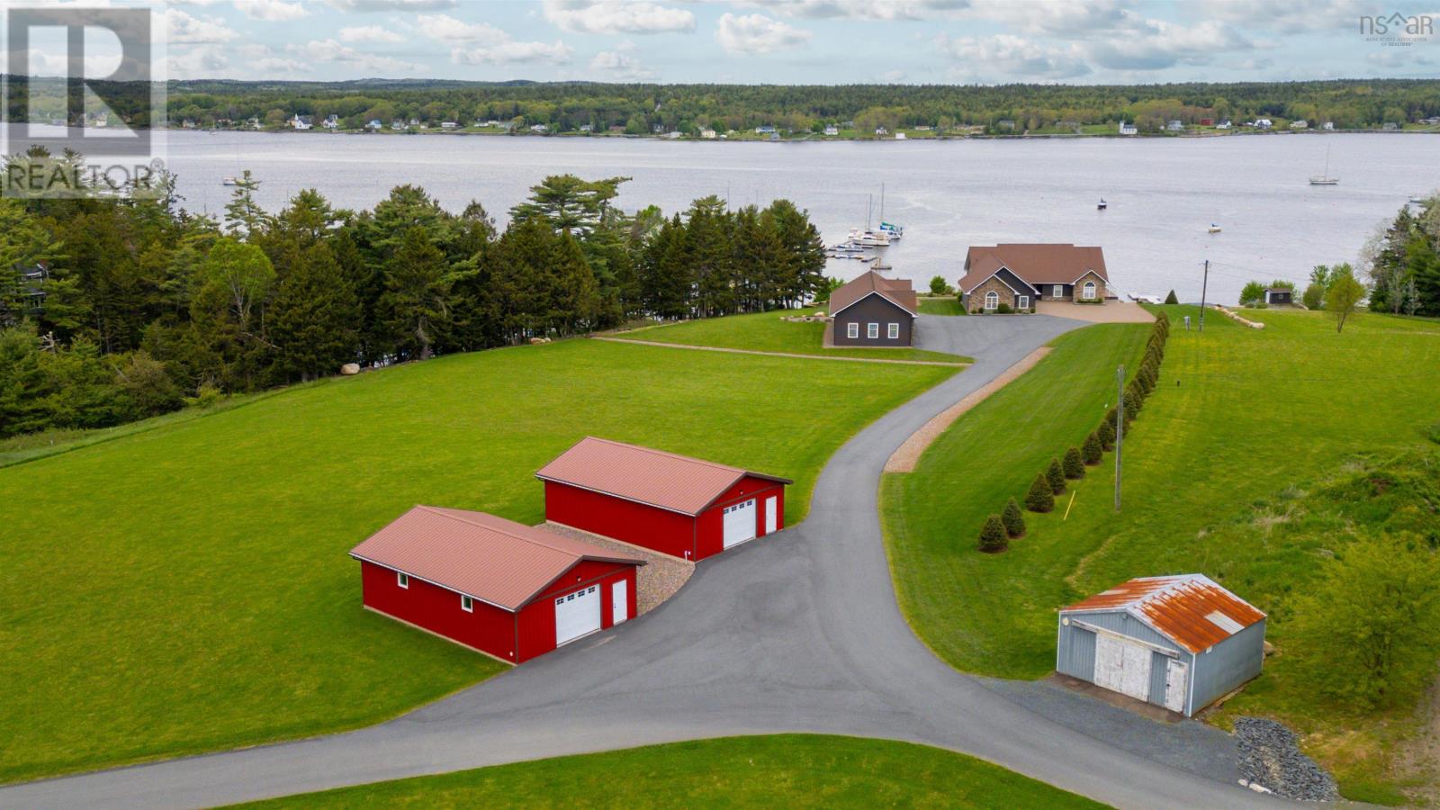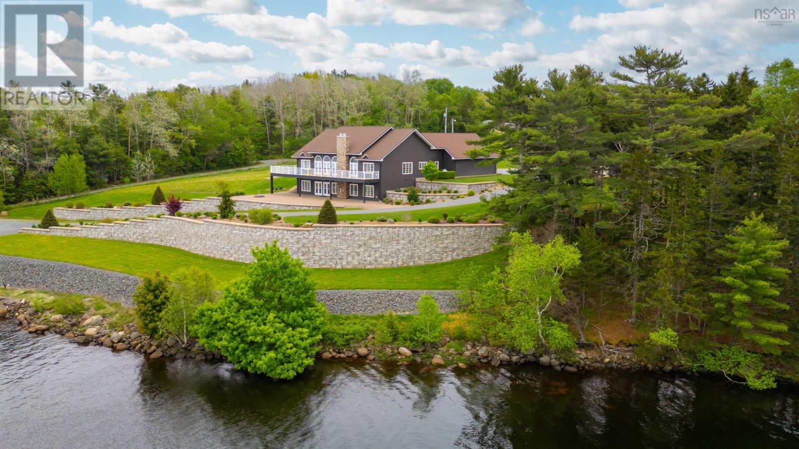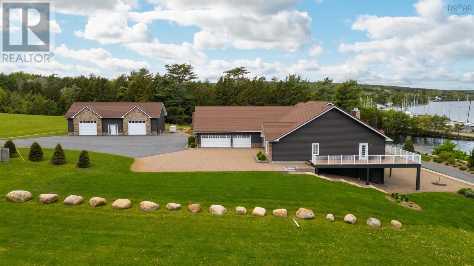 Thoughtfully designed, with timeless finishes & landscaping. A distinguished home that encompasses 8.8 acres & 350' of water frontage on the LaHave River leading into the Atlantic Ocean with deep water anchorage. The gated paved driveway extends to the water allowing for access to the boat launch. An innovative concrete retaining wall creates a terraced front yard with carefully selected flowers & shrubs that give extended beauty all season long and easily maintained with a sprinkler system. The exterior is complete with professional landscaping around the home's entrances and lower-level deck. Once inside the living room offers 4 spacious bedrooms and 5 baths that have oversized windows to capture the spectacular water views featuring remote blinds in all principal rooms. Striking views are carried throughout the home's main living areas with symmetrical floor to ceiling windows balanced by a propane fireplace in the living room. A custom kitchen is anchored by a large island and a perfectly placed window seat overlooking the LaHave Yacht Club. Three bedrooms are located on the main level including the primary with a large ensuite, walk-in closets, an entrance to the wrap-around deck offering panoramic water views. The layout affords accessibility, main floor laundry, a hydraulic elevator and access to an attached 30' x 38' garage. Home and garage are efficiently heated & cooled by a geothermal system. The lower level offers a guest suite, family room with a propane fireplace, gym area with an aqua massage machine, office and utility room. Rounding out this spectacular property is a detached heated 30' x 60' garage with inside steel cladding, 2~26' x 40' wired metal clad storage buildings for all the toys, a propane backup generator that powers the complete home and garage in a power outage. A short scenic drive to the best beaches the South Shore of NS has to offer, minutes to amenities in Bridgewater, Lunenburg & Mahone Bay and 1.5 hours to The Halifax Airport. (id:49203)