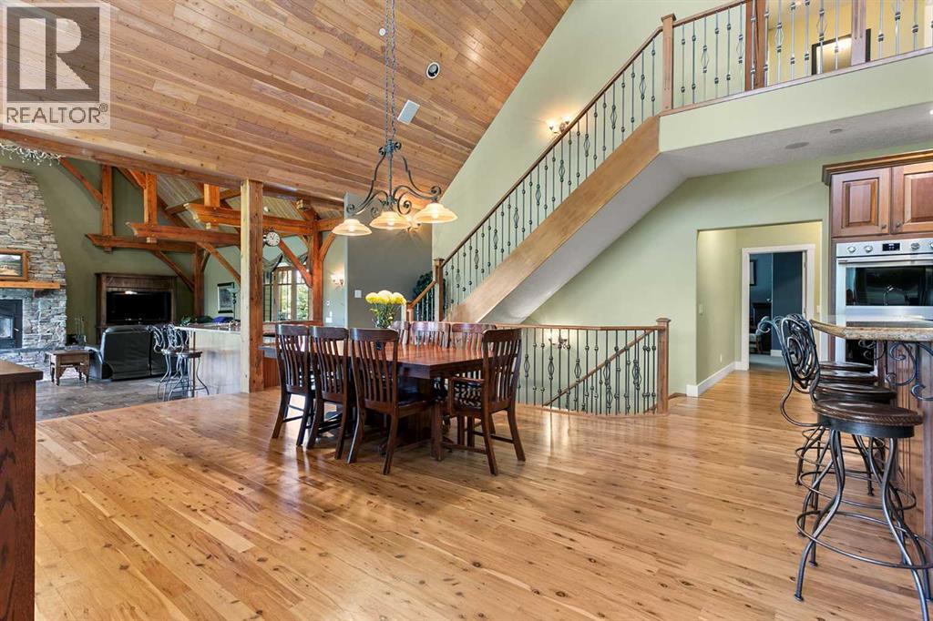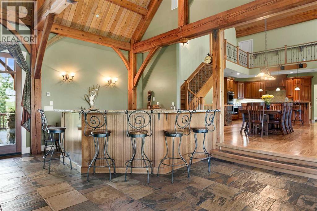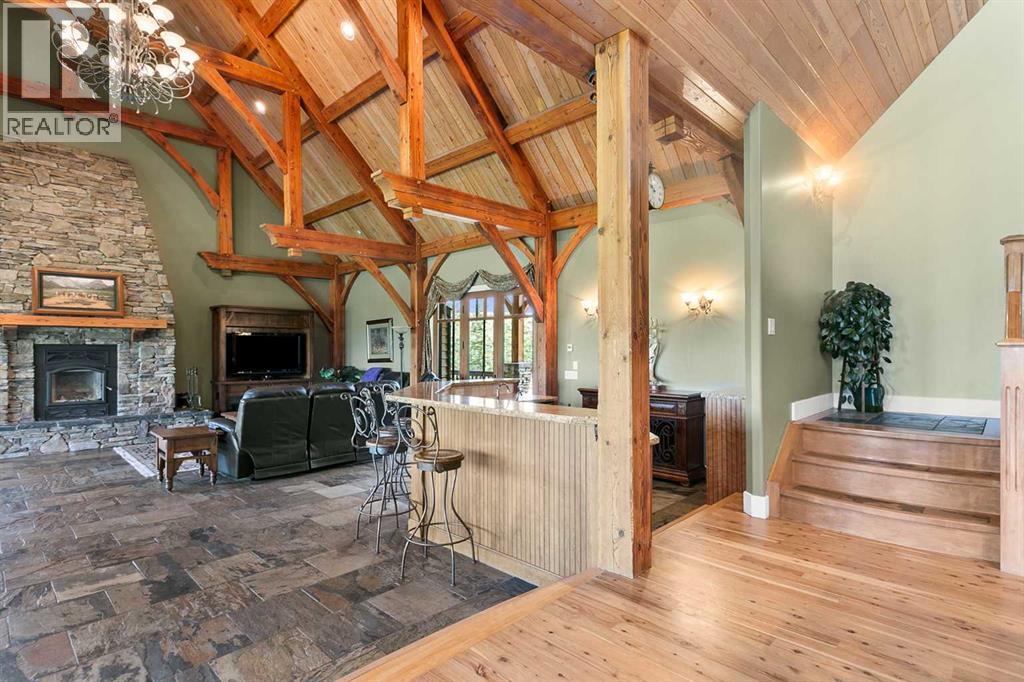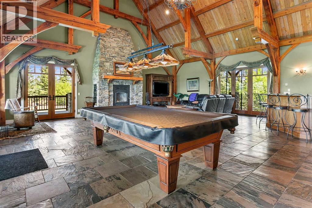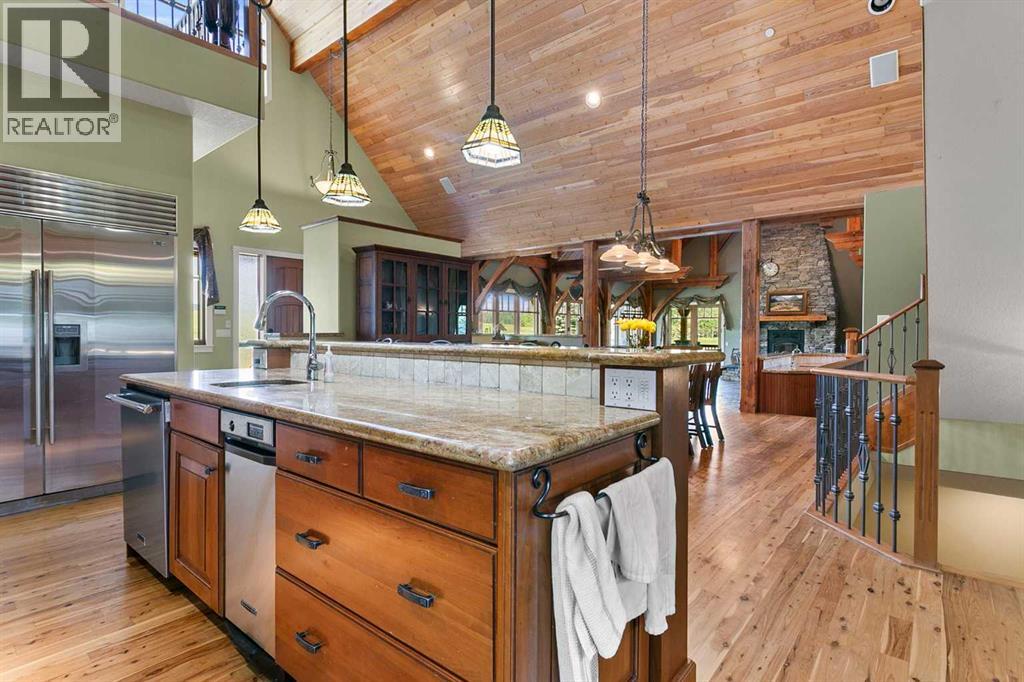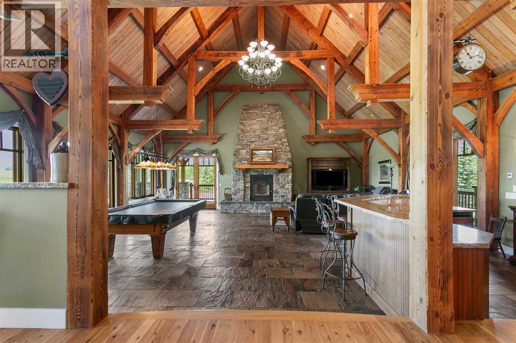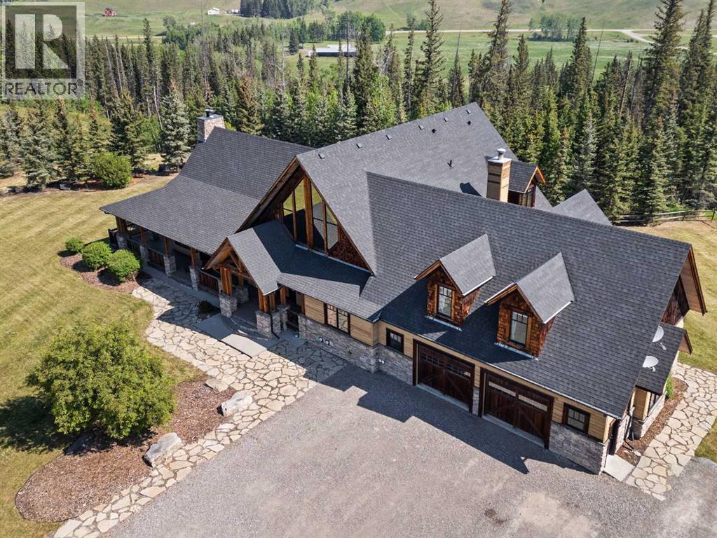 Discover the epitome of country living in this stunning residence, boasting nearly 9,000 square feet of luxurious space, nestled among serene trees on 160 acres near Millarville. This exceptional property offers breathtaking views of the rolling foothills and the majestic Rocky Mountains, creating a tranquil haven that feels truly magical. Perched at the highest point of the land, the main home is designed to maximize these spectacular vistas and includes a second kitchen and a giant 62x40 foot shop. A second home is conveniently located near Highway 549, ensuring easy access while maintaining privacy. As you step inside, the awe-inspiring 30-foot high ceilings of the "A" frame design will immediately captivate you. Massive timber beams, expansive windows, and exquisite finishes are sure to leave your guests speechless. The expansive great room features a dramatic river rock fireplace, leading seamlessly into a gourmet kitchen equipped with granite countertops, a spacious island with an eating bar, top-of-the-line appliances, and a large walk-in butler’s pantry. The dining room flows into a vaulted living area, perfect for entertaining. This magnificent home includes 7 bedrooms and a fully developed basement. The main level features a luxurious master retreat with an oversized walk-in closet and a beautifully appointed ensuite. Upstairs, you’ll find 2 additional bedrooms with a convenient Jack and Jill bathroom, while the loft above the garage includes a full legal suite with its own kitchen. The fully finished basement boasts a massive theater room, a games room, 2 additional spacious bedrooms, and 3 storage rooms. Enjoy outdoor living at its finest with a large deck, a cozy firepit, and a custom-built BBQ area, all surrounded by stunning views perfect for horse and cattle enthusiasts. As you approach from the west end, take note of the second home and shop, and be sure to leave time to explore the expansive heated workshop. Crafted with love and expertise by the c urrent owners, this property is the culmination of years of country living experience, ensuring every detail is perfect. Don’t miss the opportunity to make this hidden gem your own! (id:49203)