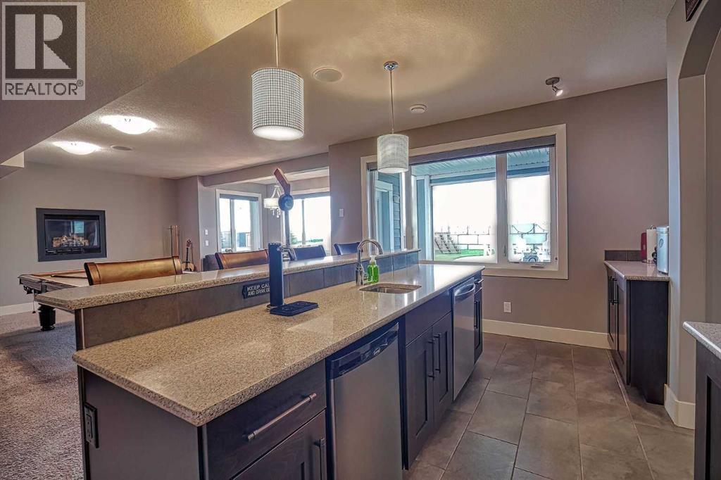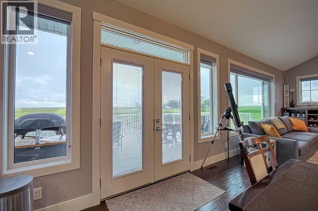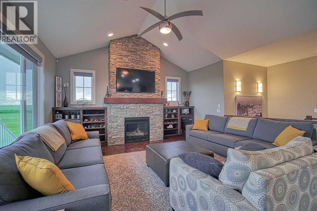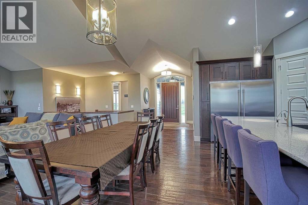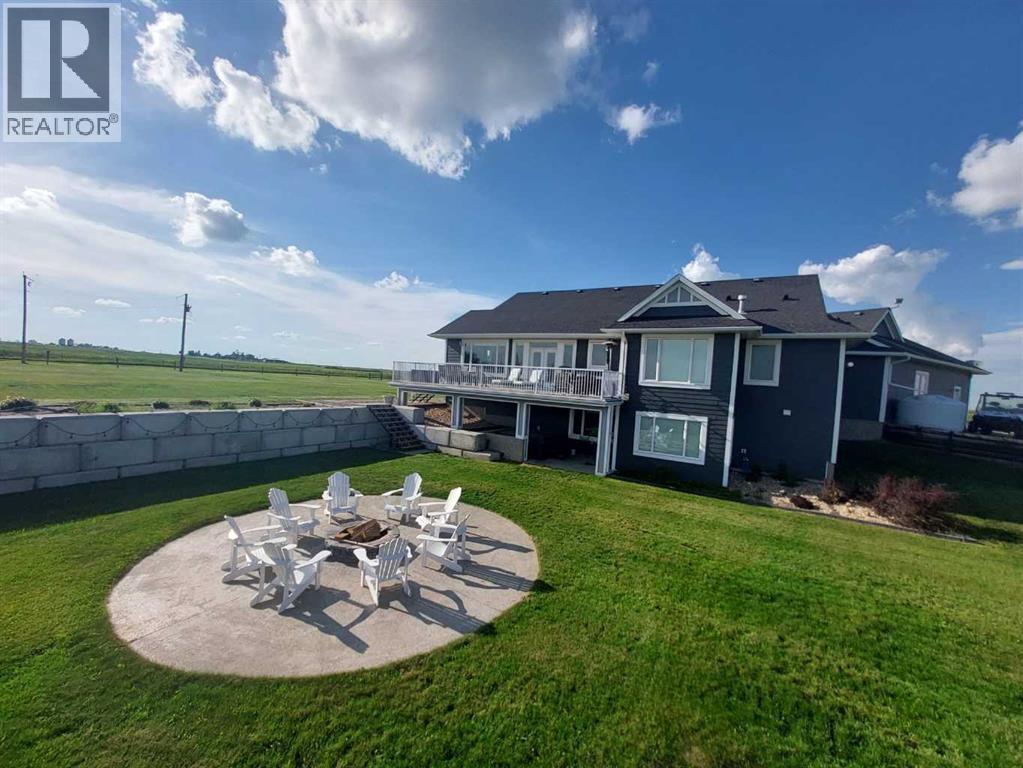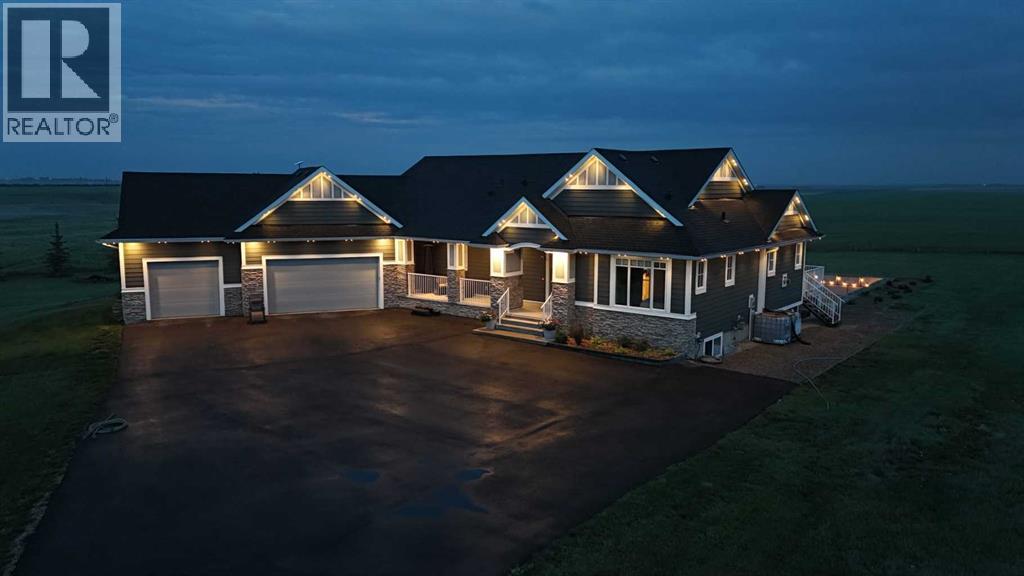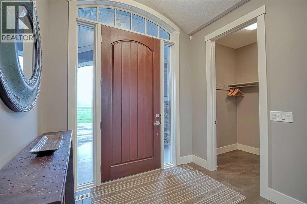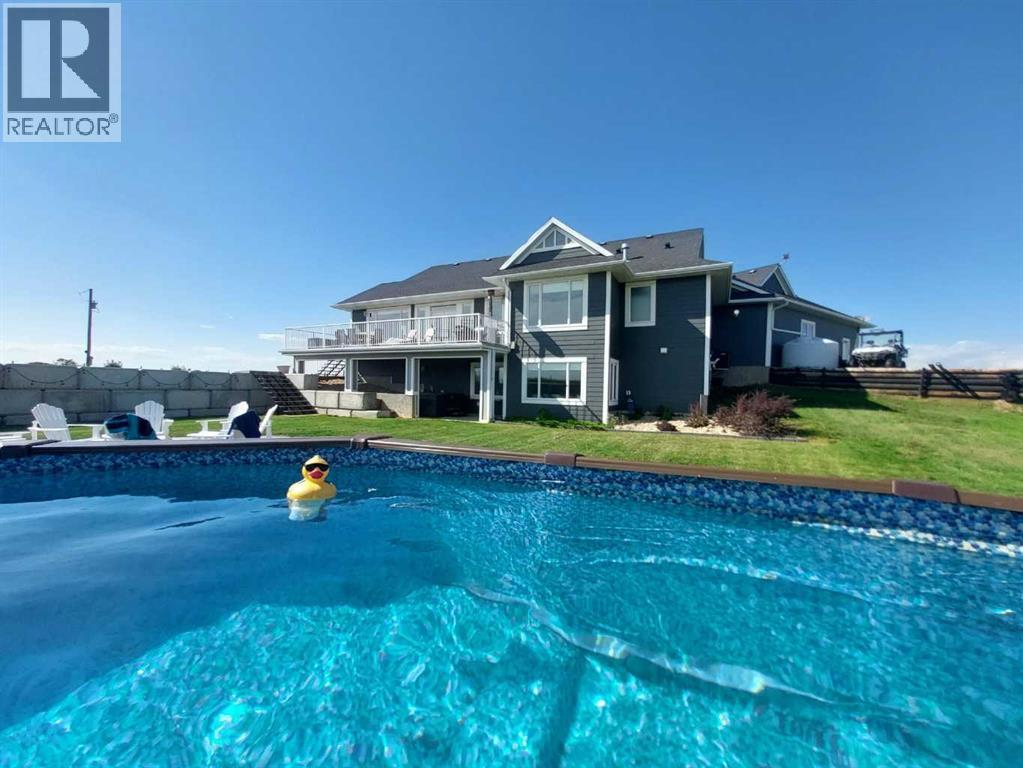 LOCATION! LOCATION! 5.86 ACRES just 18 mins to Airdrie, under 30 minutes to Calgary International Airport and an EASY commute to just about anywhere. This EXCEPTIONAL custom-built home showcases premium craftsmanship and thoughtful design throughout its over 4000 sq ft. of living space. From the automated gates and paved driveway to the Hardy Board siding, triple garage, Gemstone lighting and inviting front porch - every detail reflects quality and care. Inside, a spacious foyer with a walk-in closet opens into a bright, open-concept living space with expansive windows and sweeping views. The kitchen, dining area and living room flow seamlessly, creating an ideal setting for everyday living and entertaining. A floor-to-ceiling brick fireplace with built-ins, anchors the living room beneath 10’ ceilings, while hand-scraped hardwood flooring adds warmth and character. The well-appointed kitchen features quartz countertops, a large breakfast bar, built-in fridge/freezer, dual ovens including a built-in microwave, a gourmet gas range with additional oven and a convenient pasta faucet.A walk-through butler’s pantry provides ample storage and preparation space.Double doors lead to a large deck, ideal for seamless indoor-outdoor entertaining and outdoor cooking.The primary suite offers panoramic window views, a cozy gas fireplace, direct patio access, and a spa-inspired 5-piece ensuite with a deep soaker tub beside the fireplace, double sinks, a walk-in shower with built-in seating, a private water closet and a spacious walk-in closet. The main floor also includes a second bedroom with walk-in closet and 4-piece ensuite, along with a 2-piece powder room, laundry room and mudroom. The fully developed lower level features a ONE OF A KIND MEDIA ROOM with a 135” screen and 4K projector, space for games and entertaining, and a FULL WET BAR with quartz counters, sink, dishwasher, beer keg with tap, wine storage, and a commercial beverage fridge. There are two additional bedroom s with walk-in closets, a 4-piece bath, and walkout access to a covered patio. Outdoors, enjoy a hot tub, heated above-ground pool, fire pit, privacy retaining wall, garden shed, covered patio and underground sprinklers. Included are 22 built-in speakers with Control4 automation, five TVs with mounts, projector and screen, and security cameras. The 1,100 sq. ft. TRIPLE garage is heated and thoughtfully designed, with plenty of parking, large windows for natural light, built in shelving and built-in benches for a functional workspace. Over the years, trees have been planted to create privacy and beauty, and the low-maintenance landscaping with an irrigation system keeps the grounds looking impeccable with minimal effort. Experience refined country living with executive-level finishes and exceptional amenities on this private 5.86 acre property. (id:49203)