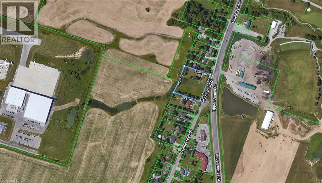 Great exposure on Upper James, close to Hamilton airport, Amazon warehouse and directly backing on to proposed development business centre including Warehouses, offices, and commercial uses, designed as an airport-related industrial-commercial subdivision. Lot 300' x 280' with 1.5 story house and double detached garage/shop with heat and hydro, previously used as used car sales. Zoned for many uses, buyer to veryfy intended use. (id:49203)