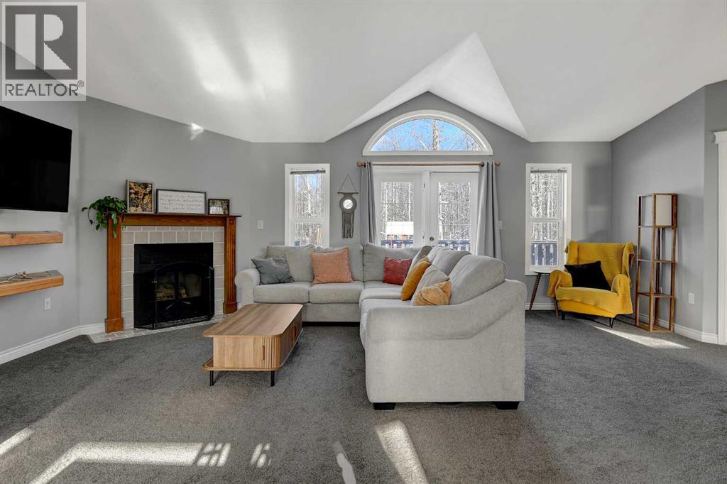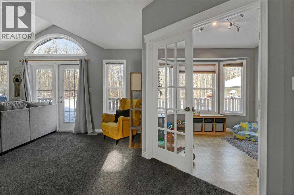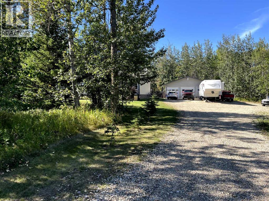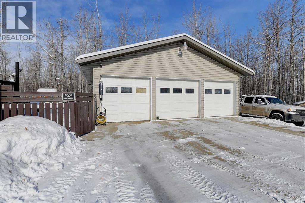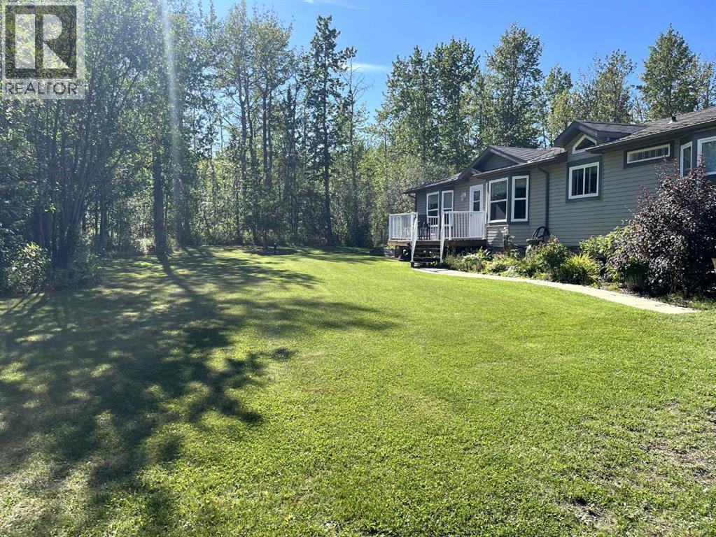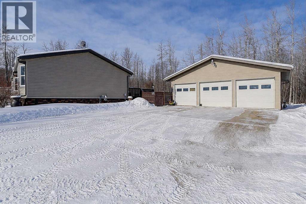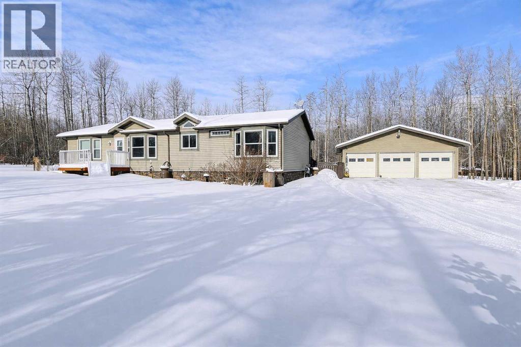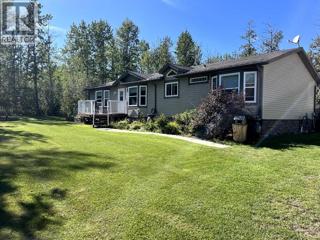 This exceptionally well-maintained 1736 sqft custom built modular home is situated on a gorgeous, private 4.27-acre treed setting in Saskatoon Mountain Acreages about 20 minutes west of Grande Prairie. This fine property offers nice curb appeal, 32 x 28 triple garage, concrete apron and abundant room and parking for all your toys. You can enjoy the peaceful country living surrounded by trees and take in the sunshine anytime of day from either the front deck with aluminum railing or the expansive 15 x 60 rear deck. The fully fenced backyard is the perfect setting for kids and pets, complete with a play center, shed and chicken coop. Yard also offers 5 raised garden beds. Inside, the freshly painted, open concept layout is bright and welcoming, highlighting vaulted ceilings, large windows, and a cozy wood fireplace. The spacious kitchen boasts plenty of cabinets, eating bar, and modern stainless-steel appliances. You will love the impressive primary bedroom, which offers a huge walk-in closet and a luxurious ensuite featuring a two-person jetted tub, separate shower, and his-and-her sinks. The layout features 2 large bedrooms and a 3rd room which could be an office, playroom, nursery, or potential 3rd bedroom. The 32 x 28 heated garage features 3 overhead doors, floor drain, shelving and workbench and a lean-to off the back perfect for extra storage. Other great features include custom blinds, reverse osmosis to fridge and kitchen tap, new hot water tank and new washer and dryer. This scenic property offers a rare combination of modern open concept floor plan, private treed setting and a massive garage all at an attractive price so book your showing soon. (id:49203)