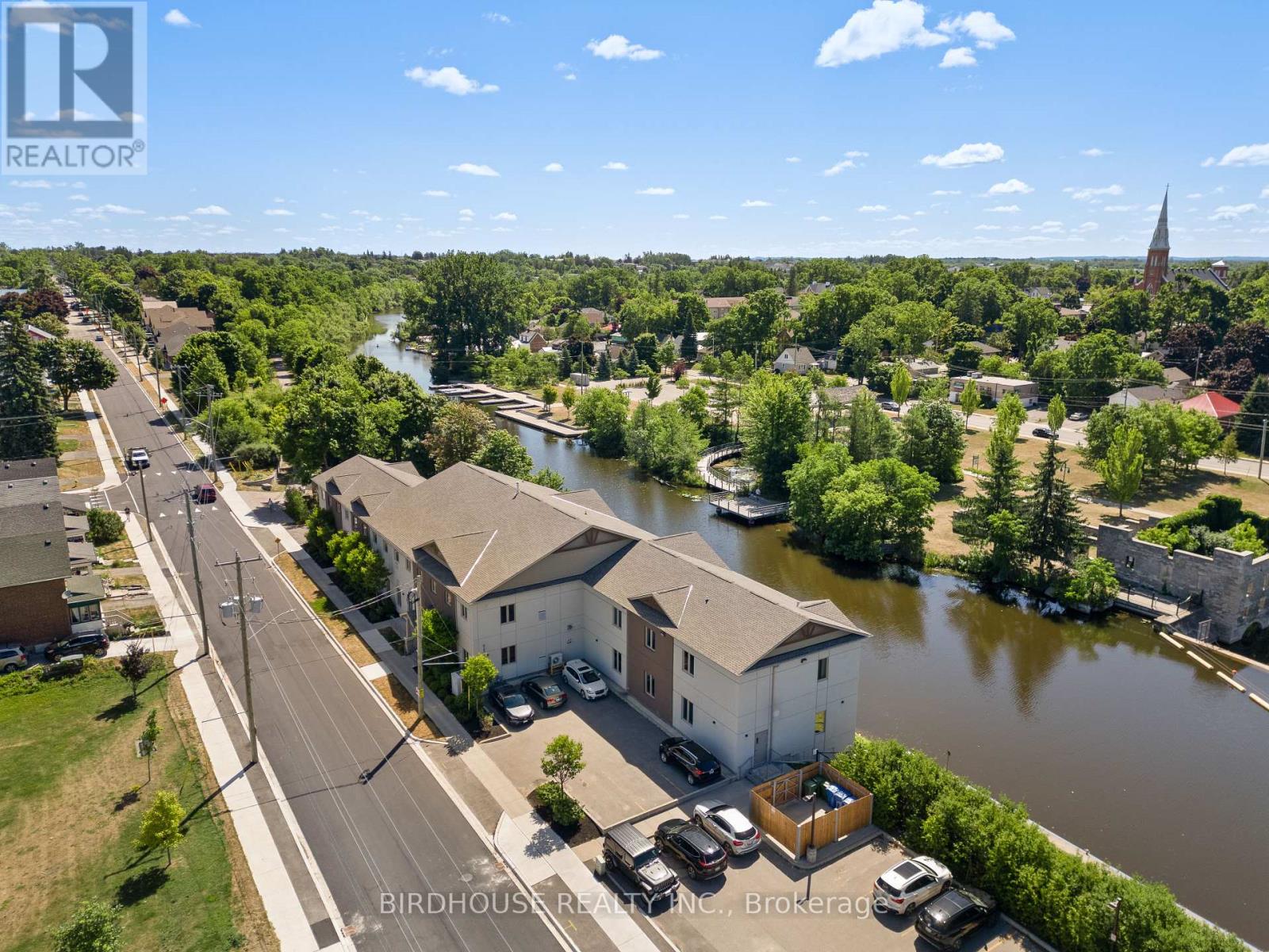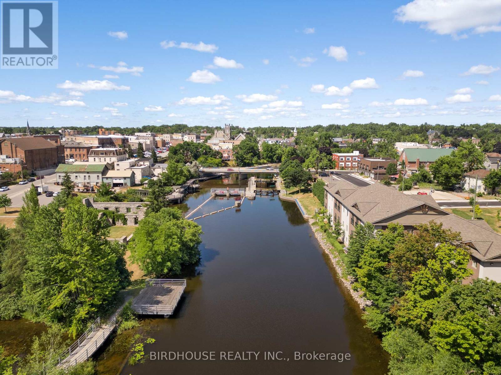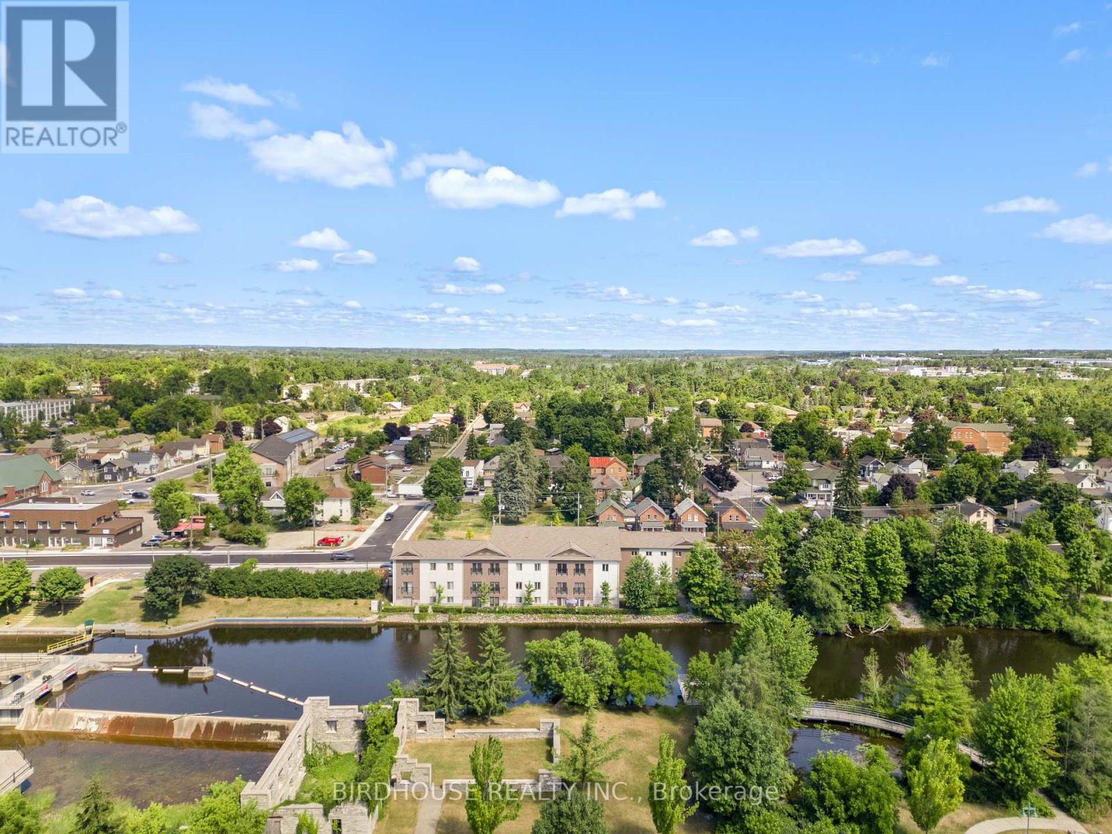 STUNNING 2 bedroom 2 bath end unit on the top floor! Situated along the Scugog River, with beautiful views of the falls & Lock 33. Enter through the secured front foyer & skip the stairs by taking the elevator. The condo unit features an open concept living room & gorgeous kitchen with stainless steel appliances, large island and quartz countertops. Spacious primary bedroom features an ensuite with walk-in tiled shower. This unit includes in suite laundry, air conditioning, dedicated parking, guest parking, a storage locker plus access to common exercise room (same floor), party room & outdoor BBQ terrace area. Located beside the Victoria Trail, this condo is perfect for those who enjoy walking and biking, plus is just a short stroll to downtown shops, restaurants, and shows! (id:49203)