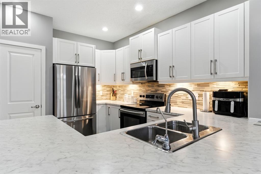 4BED • 3.5BATH • Fully Finished • A/C • Fenced • Three-tier patio! This stunner Home brings style, comfort, and “wow, we live here now” vibes from the moment you walk in. The main floor features a floating white-stone gas fireplace that looks like it belongs in a magazine, upgraded flooring, and ceiling speakers so you can set the perfect soundtrack for everything from family dinners to spontaneous dance parties.The kitchen is armed with stainless steel appliances, under-cabinet lighting, and a designer backsplash that practically begs to be Instagrammed.Upstairs, you’ll find soaring 10-ft ceilings, oversized windows flooding the space with natural light, and a primary suite designed for maximum relaxation. Unwind with sunset views, a deep soaker tub, a walk-in shower, and a custom closet that finally solves the “where does all this go?” problem.The fully finished basement includes a full bathroom and flexible space perfect for movie nights, gaming, hobbies, or that home gym you might use at least twice.Stay cool with A/C, enjoy the finished garage, and appreciate the brand-new 2024 concrete along the side of the home—hello low-maintenance living! The private backyard is your personal retreat, complete with a three-tier patio, built-in sandbox, and swing set. Kids love it. Adults love that kids love it.Located just steps from ponds, pathways, playgrounds, schools, and shops—with quick access to Highway 2 for smooth commuting—you’re truly in the heart of convenience.Don’t wait—book your showing today before someone else calls this “home”!Nearby Schools:Heloise Lorimer School (K–5) – right in Kings Heights.Bert Church High School (9–12) – a solid high school option nearby.École Francophone d’Airdrie (K–12) – French-language schooling in the community. (id:49203)