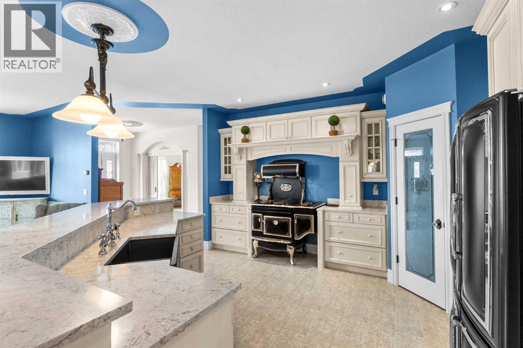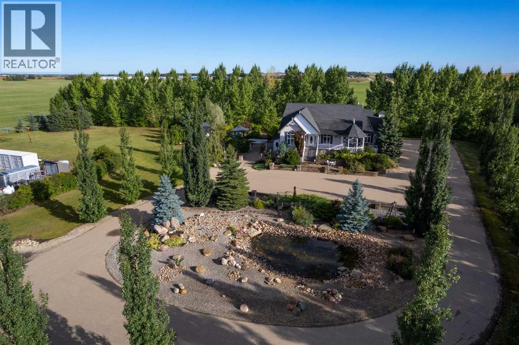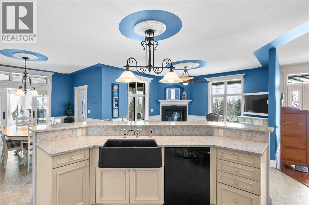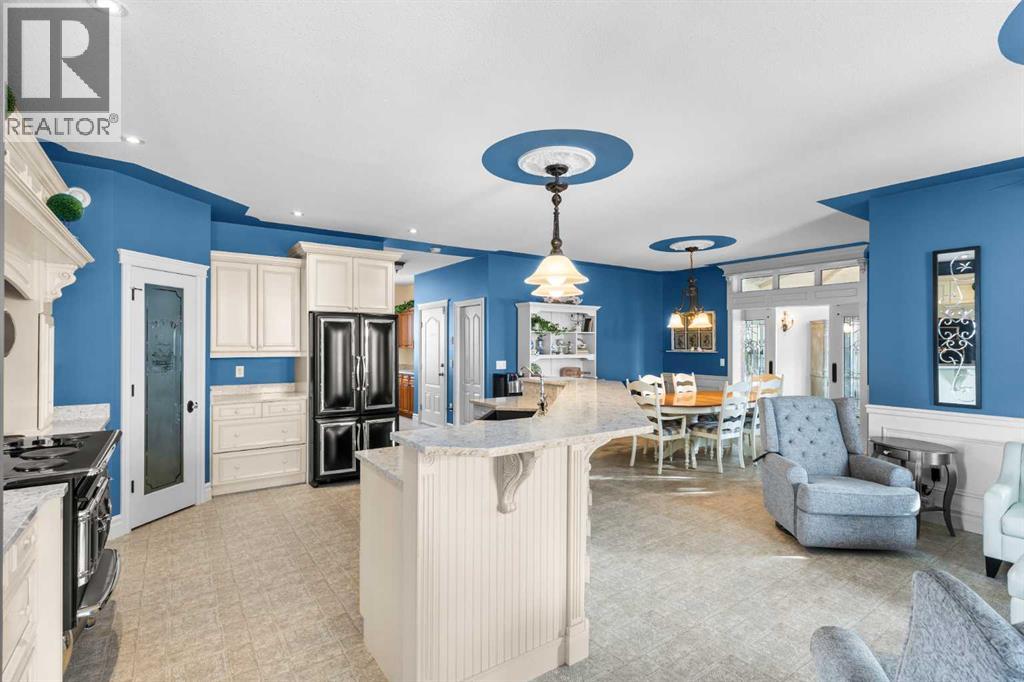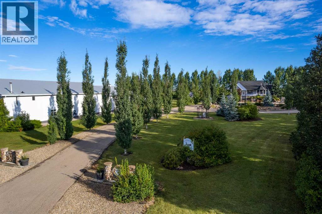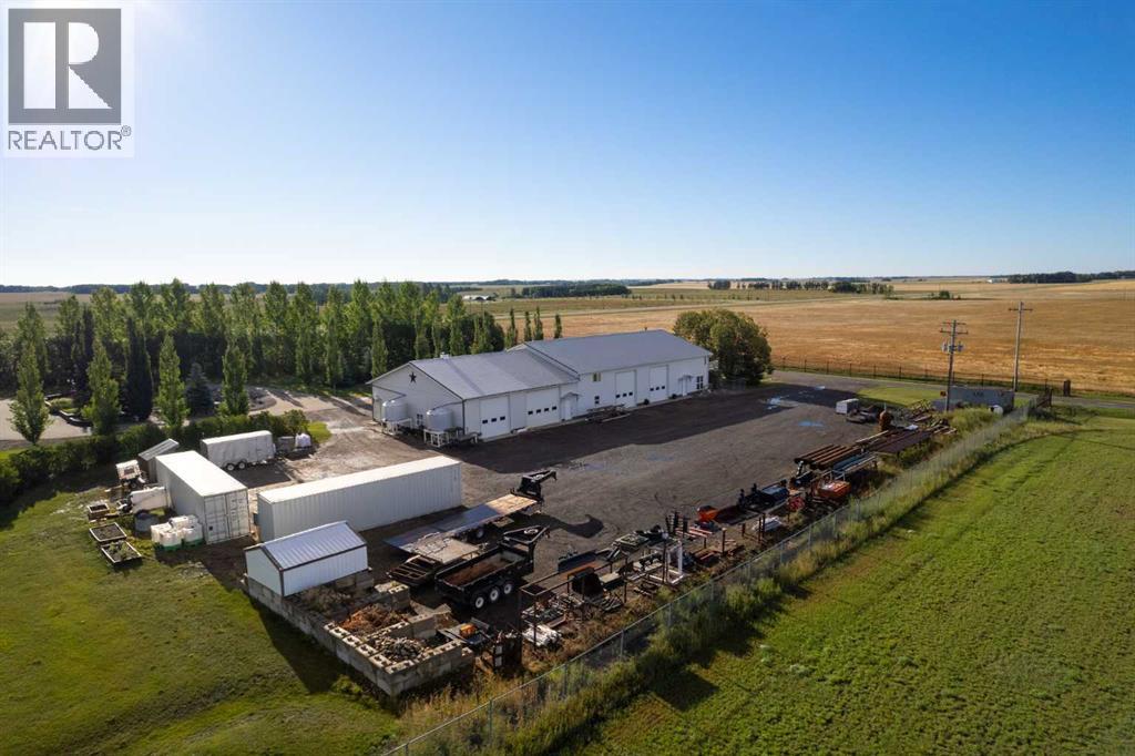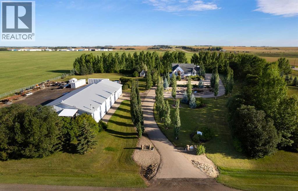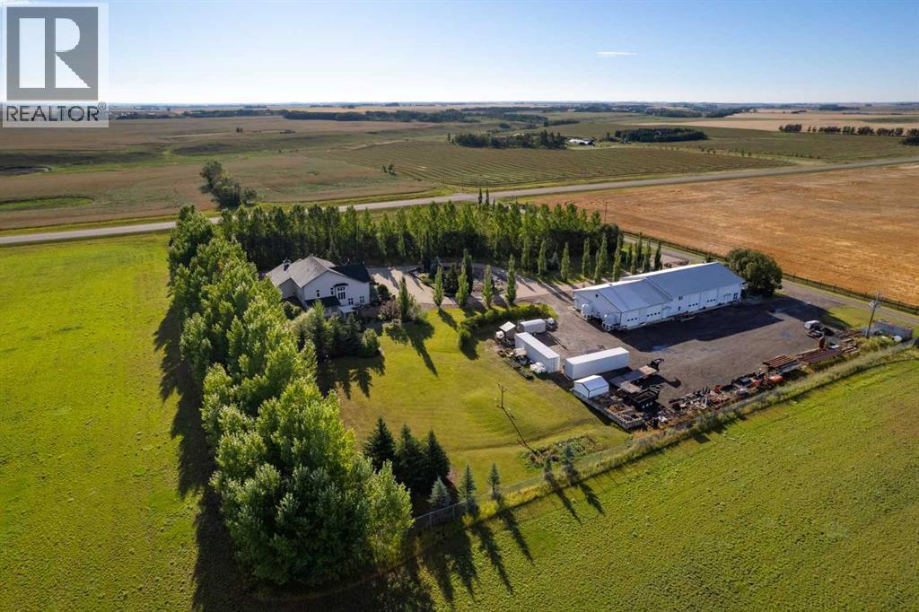 This beautifully landscaped 5.49-acre acreage offers exceptional potential for a small/medium-sized business and additional housing for extended or blended families. Located 5 minutes north of Didsbury, AB, and 10 minutes south of Olds, AB, just off Highway 2A, it boasts gorgeous mountain views. The main house, with 2,017 sq ft of French country charm, features crown moldings, barn and French doors, and hardwood floors. The spacious kitchen, updated in 2023, has a two-tiered island, quartz countertops, a farmhouse sink, hard wood floors and ample cabinet space. The main floor also includes a dining room, living room, covered maintenance-free veranda with an outdoor kitchen. Master bedroom with a 4-piece ensuite, fireplace, soaker tub, and walk-in closet. Additional spaces include a 2-piece bath, second bedroom, laundry room, mudroom, and garage entrance. The fully finished walk-out basement provides 1,735 sq ft, featuring 2 bedrooms, a media room, a 4-piece bath, a playroom, and storage. ICF construction, crown moldings, fresh paint (2023), and in-floor heating throughout enhance the home's appeal. The oversized, heated double garage has a paved driveway. The property includes a 6,400 sq ft shop (128' x 50') with three-phase power. Features include a 50’x24’ drive-through wash bay with 12’ overhead doors, a 50’x24’ welding bay with a 16’ overhead bay door and crane. 50’x80’ main shop area with two 14’ bay doors and 16’ clearance. The shop also has a wood workshop, paint storage, front office space, and a 3-piece bathroom. A new boiler (2024) ensures in-floor heating. Above the woodworking shop, a spacious living area includes a kitchen, laundry, 4-piece bathroom, 3 bedrooms, a master bedroom with a walk-in closet, and a storage room. The mezzanine adds additional living space, perfect for additional family members. This exceptional property has been meticulously maintained and offers an unparalleled combination of country residential comfort and business potential. Whether you are seeking a spacious family home, a live-work opportunity, or a combination of both, this acreage provides a rare and sophisticated setting with limitless possibilities. (id:49203)