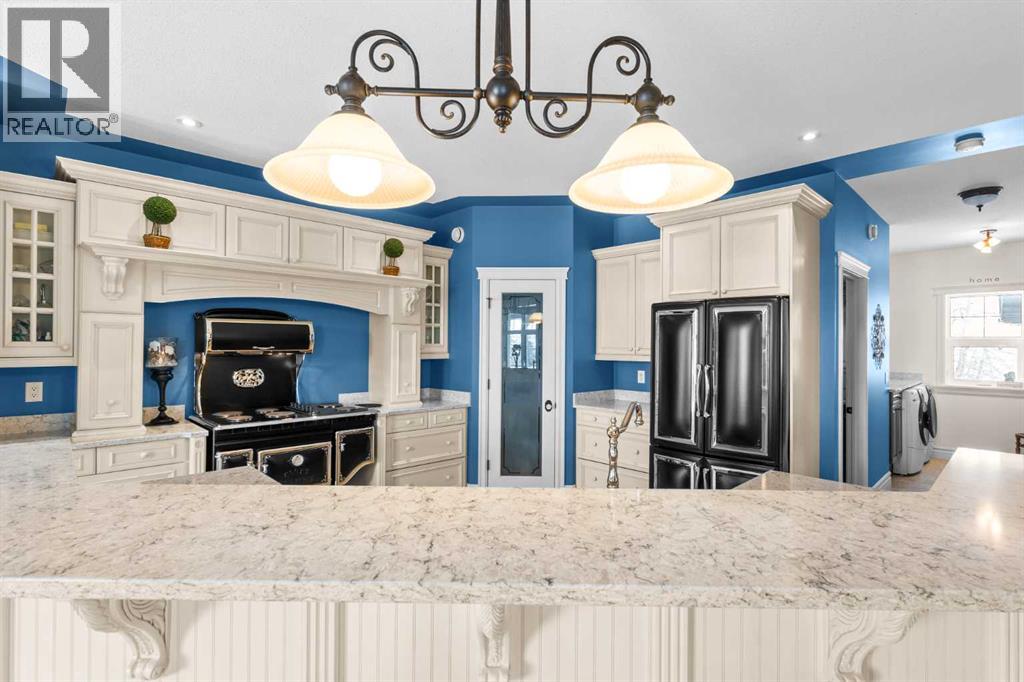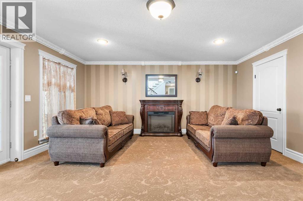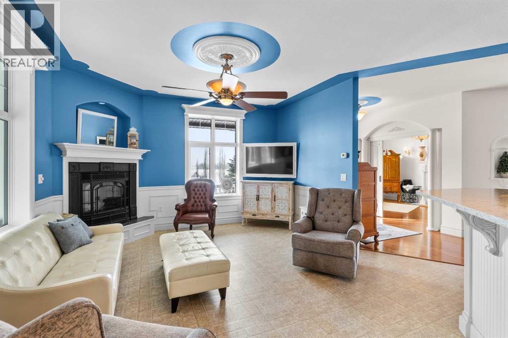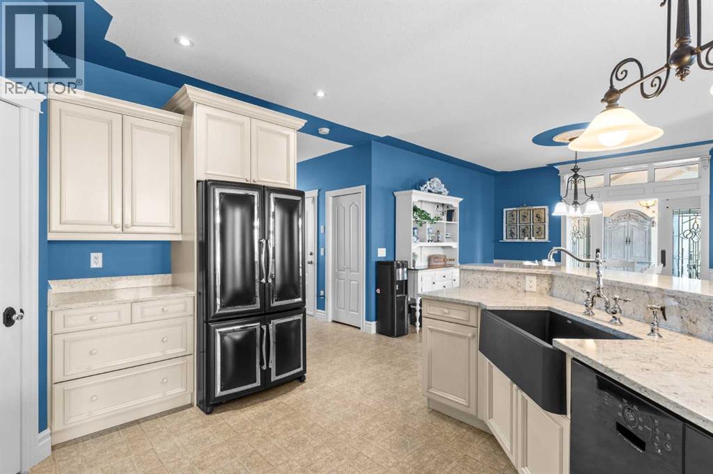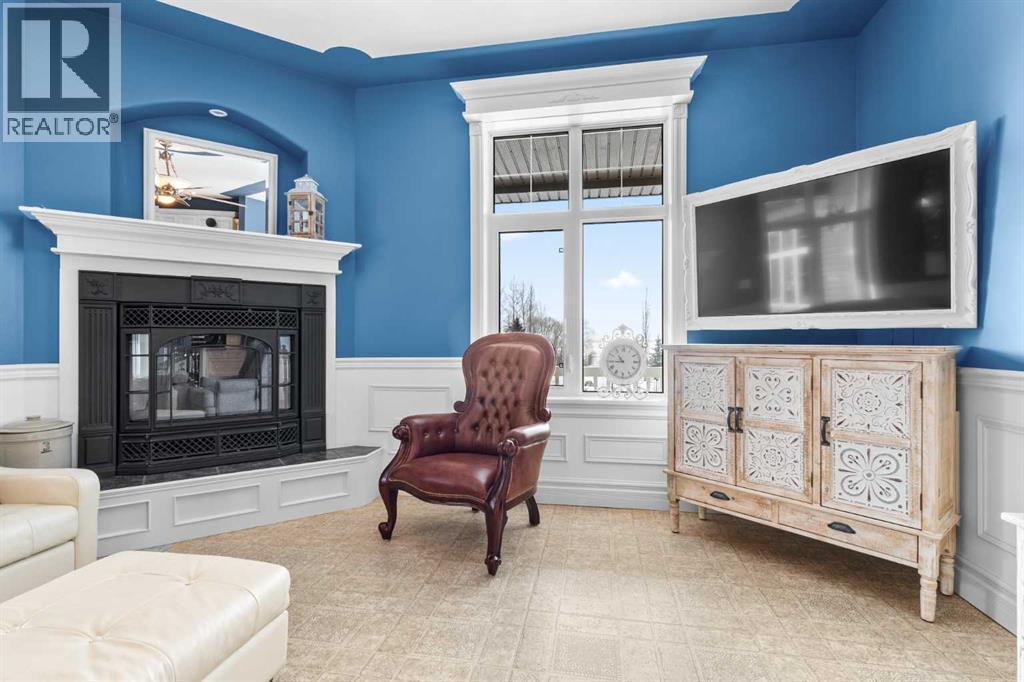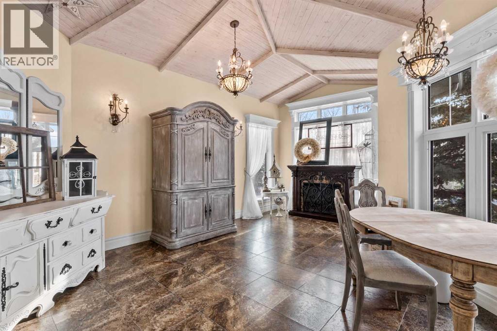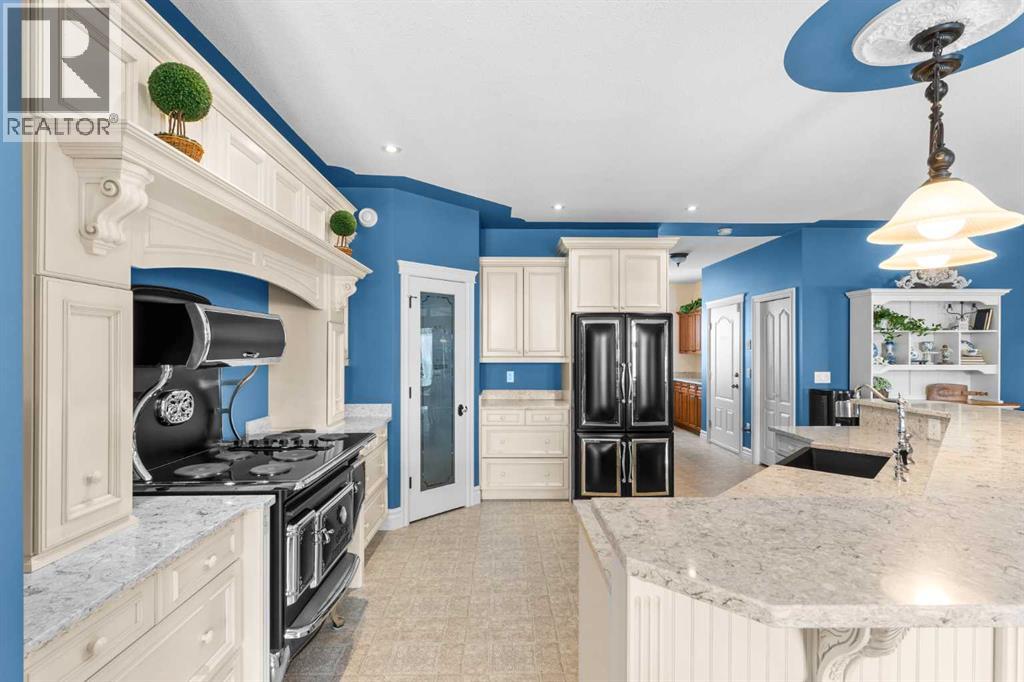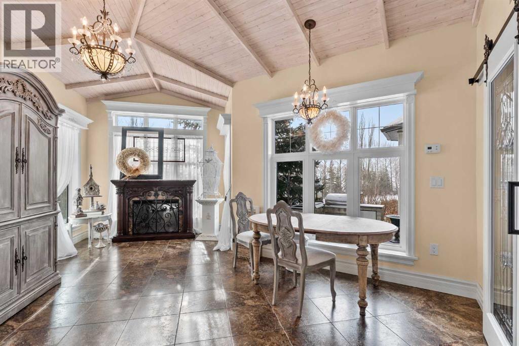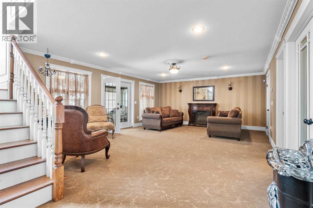 This beautifully landscaped 5.49-acre acreage offers exceptional potential for a small/medium-sized business and additional housing for extended or blended families. Located 5 minutes north of Didsbury, AB, and 10 minutes south of Olds, AB, just off Highway 2A, it boasts gorgeous mountain views. The main house, with 2,017 sq ft of French country charm, features crown moldings, barn and French doors, and hardwood floors. The spacious kitchen, updated in 2023, has a two-tiered island, quartz countertops, a farmhouse sink, hard wood floors and ample cabinet space. The main floor also includes a dining room, living room, covered maintenance-free veranda with an outdoor kitchen. Master bedroom with a 4-piece ensuite, fireplace, soaker tub, and walk-in closet. Additional spaces include a 2-piece bath, second bedroom, laundry room, mudroom, and garage entrance. The fully finished walk-out basement provides 1,735 sq ft, featuring 2 bedrooms, a media room, a 4-piece bath, a playroom, and storage. ICF construction, crown moldings, fresh paint (2023), and in-floor heating throughout enhance the home's appeal. The oversized, heated double garage has a paved driveway. The property includes a 6,400 sq ft shop (128' x 50') with three-phase power. Features include a 50’x24’ drive-through wash bay with 12’ overhead doors, a 50’x24’ welding bay with a 16’ overhead bay door and crane. 50’x80’ main shop area with two 14’ bay doors and 16’ clearance. The shop also has a wood workshop, paint storage, front office space, and a 3-piece bathroom. A new boiler (2024) ensures in-floor heating. Above the woodworking shop, a spacious living area includes a kitchen, laundry, 4-piece bathroom, 3 bedrooms, a master bedroom with a walk-in closet, and a storage room. The mezzanine adds additional living space, perfect for additional family members. This exceptional property has been meticulously maintained and offers an unparalleled combination of country residential comfort and business potential. Whether you are seeking a spacious family home, a live-work opportunity, or a combination of both, this acreage provides a rare and sophisticated setting with limitless possibilities. (id:49203)