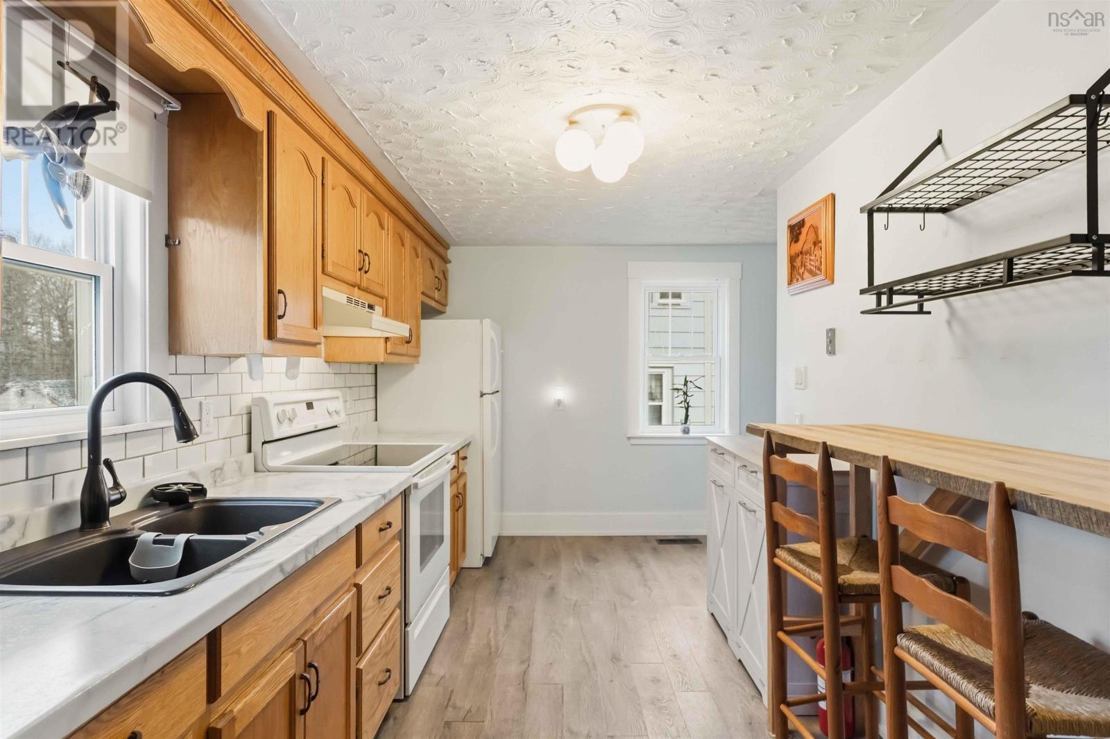 Welcome to this impeccably maintained, move-in-ready gemperfect for first-time buyers or those looking to downsize without compromise. The main floor features a bright, sun-filled kitchen with beautiful oak cabinetry and abundant storage, alongside a spacious living room designed for relaxation. Enjoy the convenience of main-level living with a primary bedroom and a stunningly renovated 4-piece bath featuring all-new fixtures. Fresh paint and brand-new flooring run throughout the main level, leading upstairs to two additional cozy bedrooms. Stay comfortable year-round with a ducted heat pump providing efficient heat and summer AC. Major updates offer total peace of mind: a 200-amp electrical panel, a newly renovated basement laundry room, and a 2018 hot water tank. Outside, the paved driveway leads to a 12x23 garageperfect for a workshop or storing your outdoor gear. Dont miss out on this Kentville beauty. Call today for your private viewing! (id:49203)