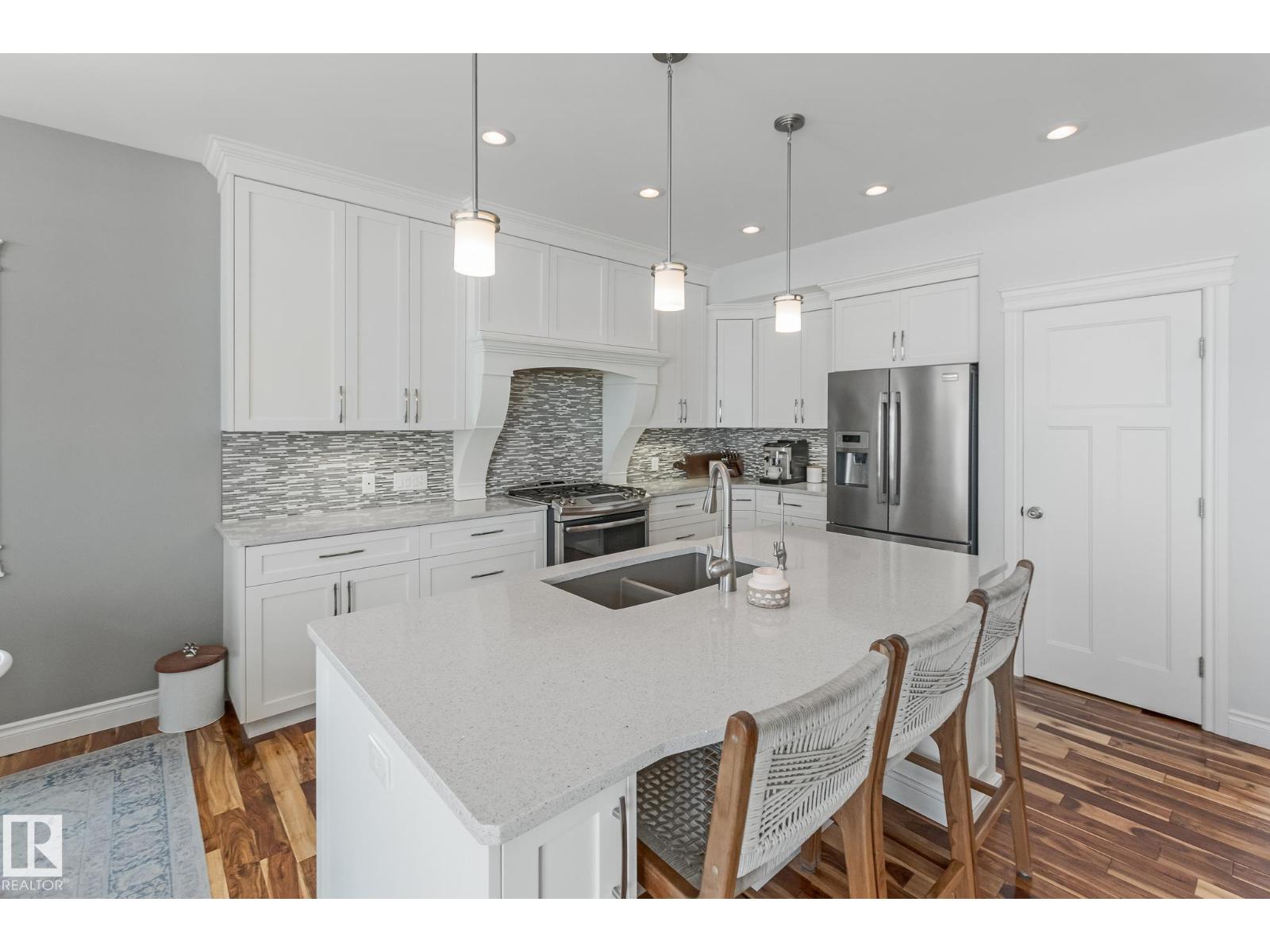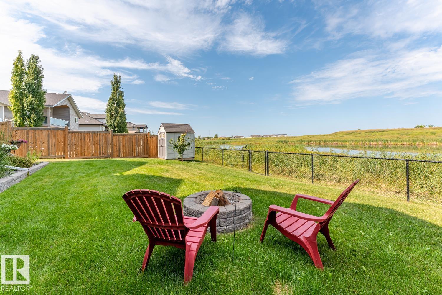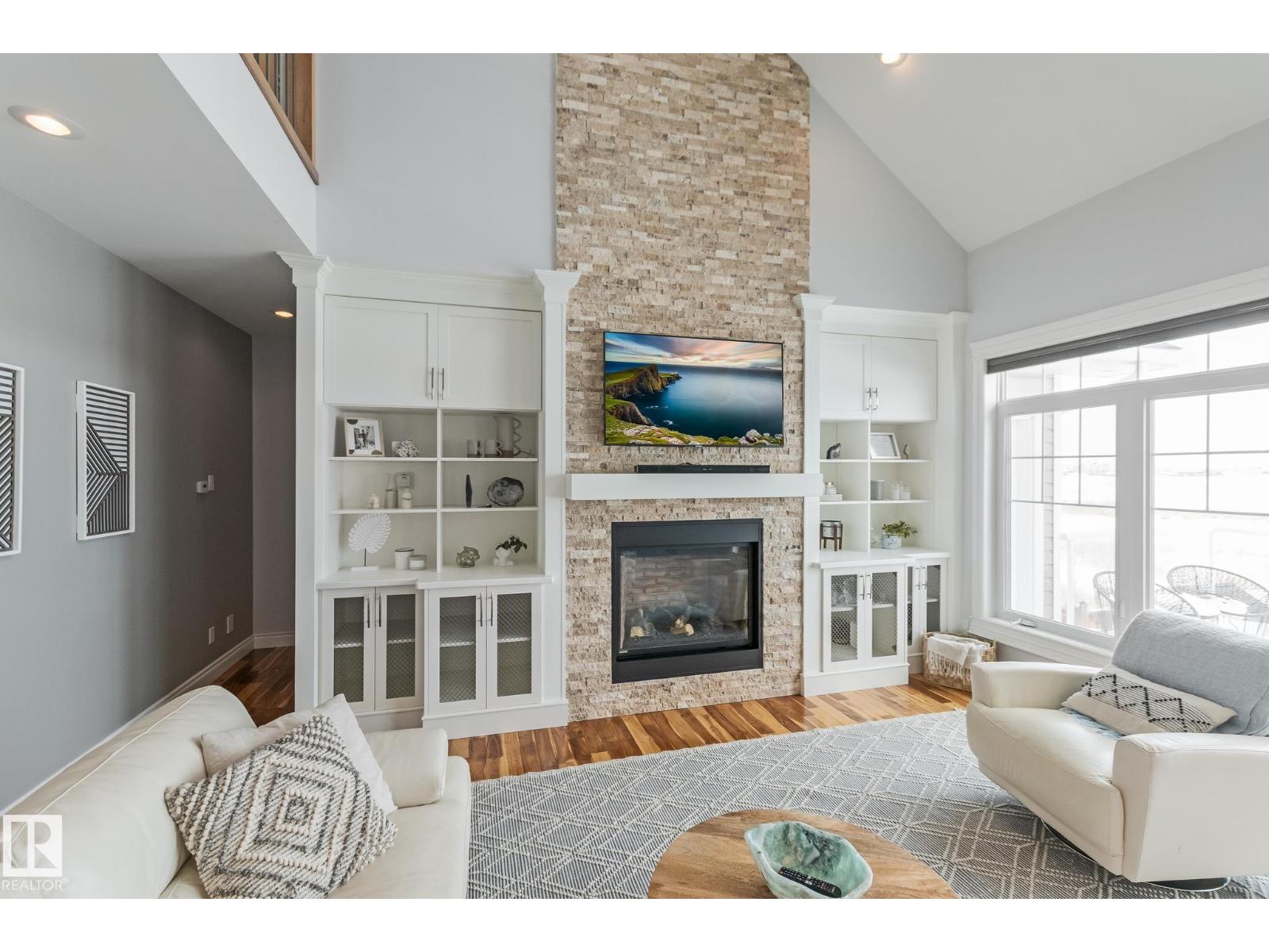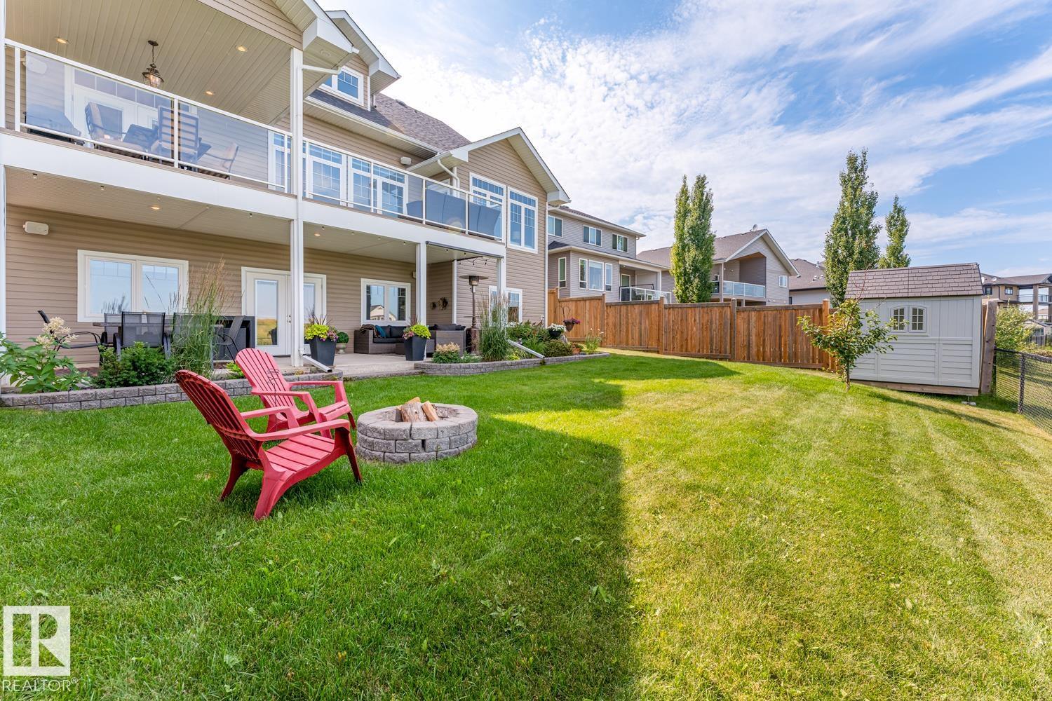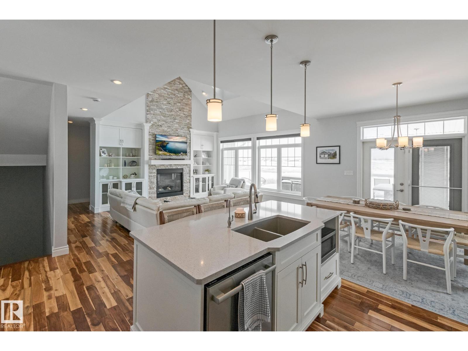 Custom crafted 2750 sqft. 1-1/2 Story with double attached heated garage located in Beau Vista. Welcoming covered veranda opens up to a spacious foyer, Kitchen has custom white cabinetry, w/under cabinet lighting, gas stove, Stainless steel appliances, pantry, quartz tops. Island w/sink & seating. Living room ceiling is open to the second floor with dormer and has built in cabinetry on either side of a gas fireplace. Big bright triple pane windows & luxurious hardwood floors throughout. 7 bdrms & 4 bath, Master suite w/ coffered ceilings walk-in closet, huge ensuite w/ tiled shower, heated floor, huge soaker tub & 2 sinks. Main floor laundry, Upper floor with open office/reading area, Fully developed walk out basement incl. large Rec room w/ wet bar, BI speakers in/out door, underslab heating & A/C, Central Vac and R/O, H/W on demand. Enjoy the views from the covered deck or lower walk out patio w/ RI for Hot tub, overlooking the ponds and beautifully landscaped fenced yard w/ firepit. Home of a LIFETIME! (id:49203)