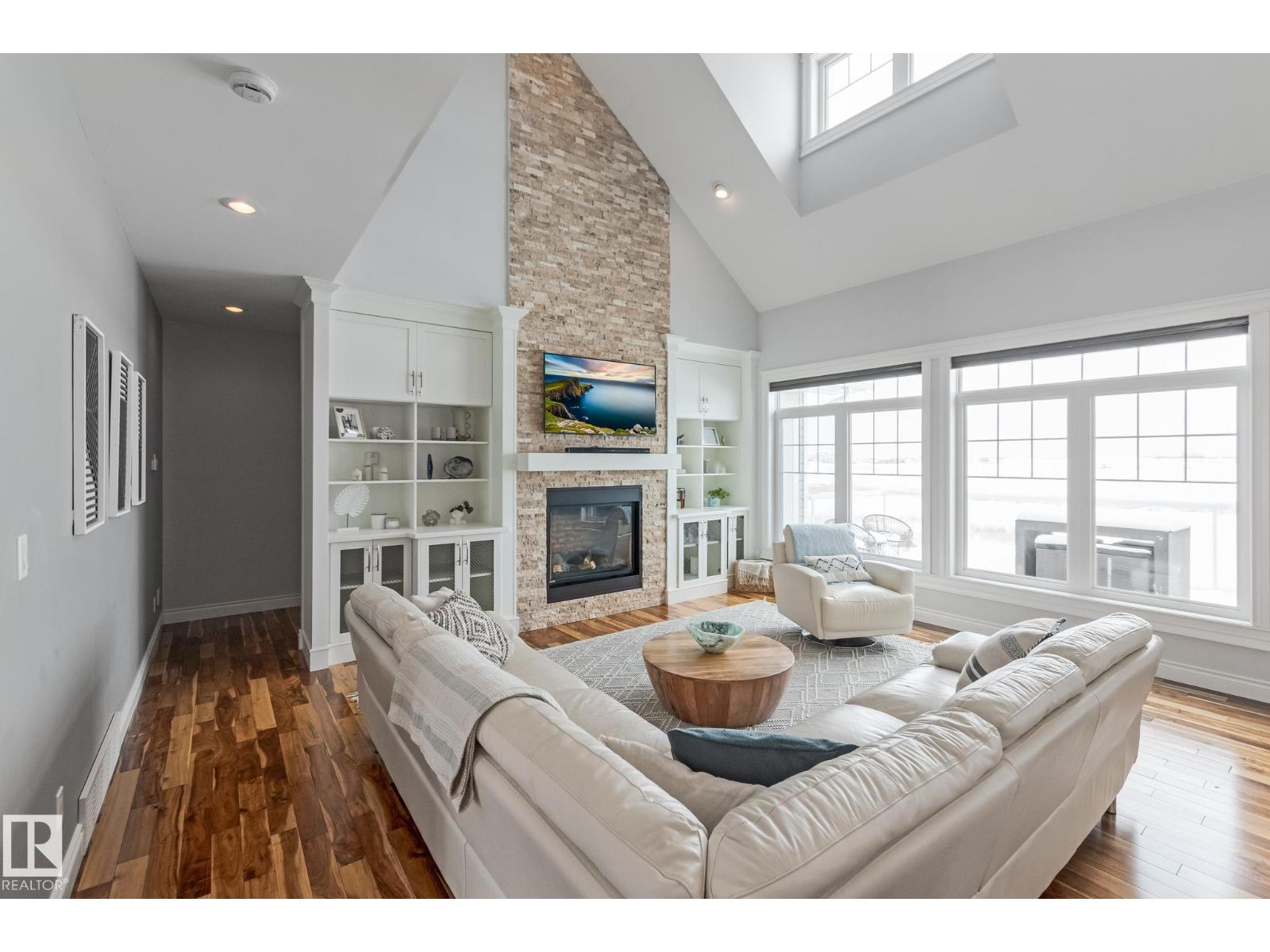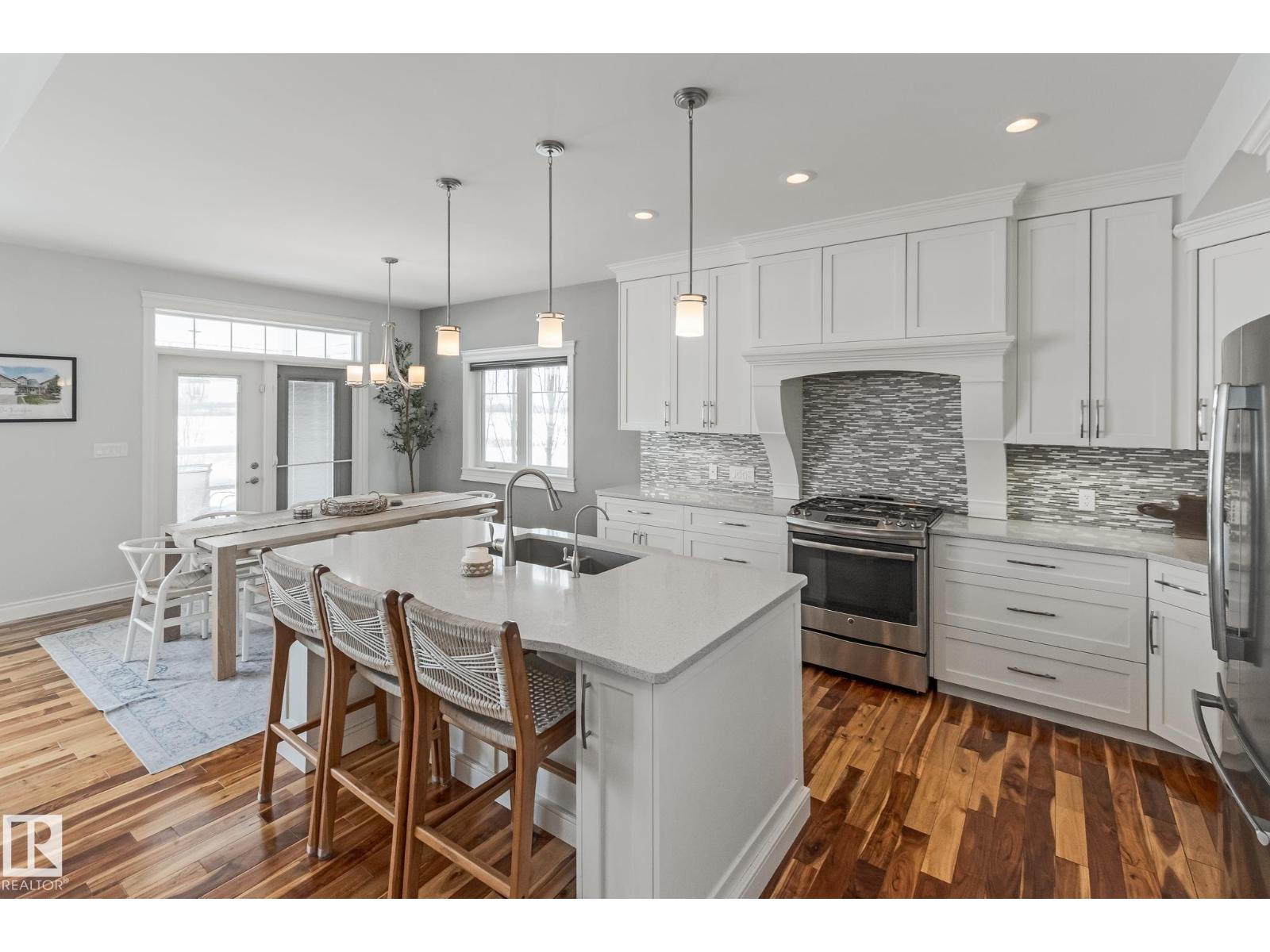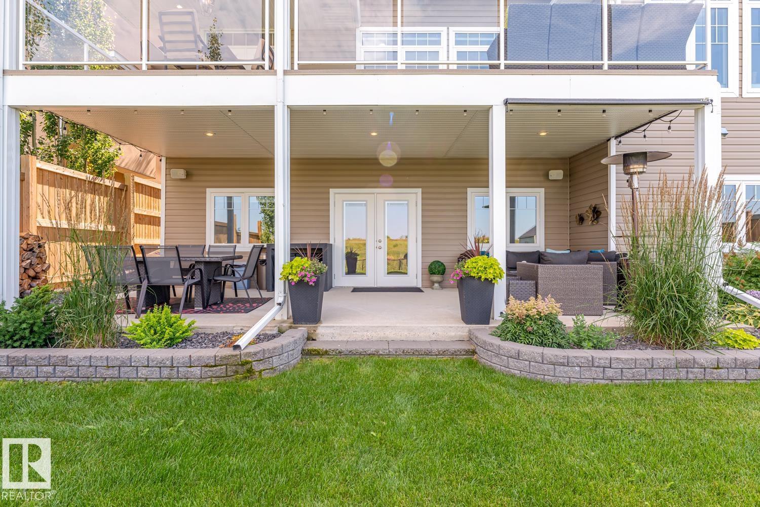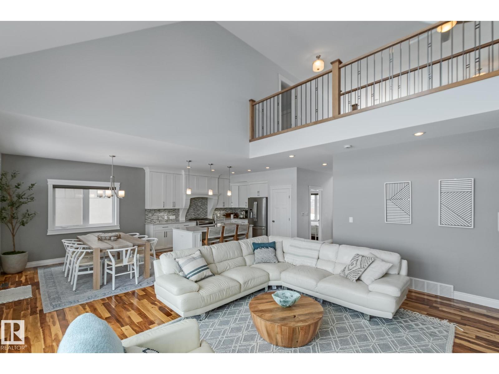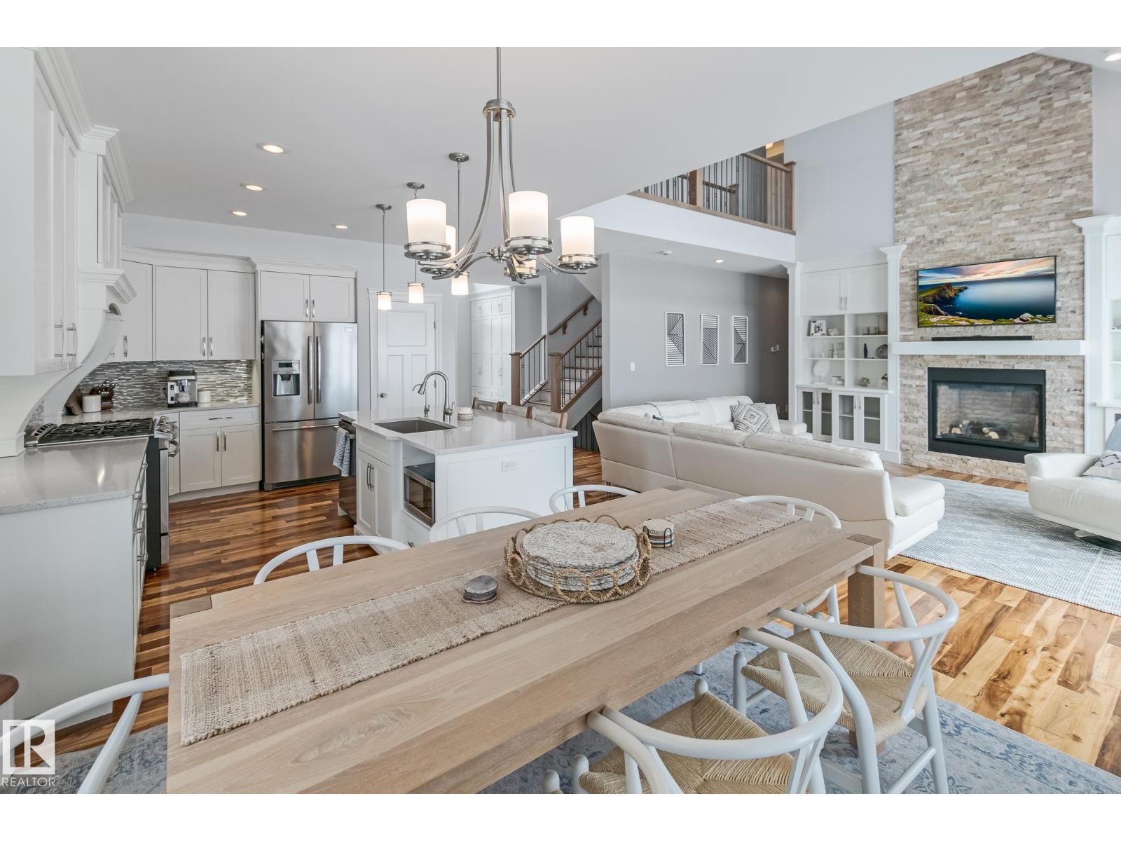 Custom crafted 2750 sqft. 1-1/2 Story with double attached heated garage located in Beau Vista. Welcoming covered veranda opens up to a spacious foyer, Kitchen has custom white cabinetry, w/under cabinet lighting, gas stove, Stainless steel appliances, pantry, quartz tops. Island w/sink & seating. Living room ceiling is open to the second floor with dormer and has built in cabinetry on either side of a gas fireplace. Big bright triple pane windows & luxurious hardwood floors throughout. 7 bdrms & 4 bath, Master suite w/ coffered ceilings walk-in closet, huge ensuite w/ tiled shower, heated floor, huge soaker tub & 2 sinks. Main floor laundry, Upper floor with open office/reading area, Fully developed walk out basement incl. large Rec room w/ wet bar, BI speakers in/out door, underslab heating & A/C, Central Vac and R/O, H/W on demand. Enjoy the views from the covered deck or lower walk out patio w/ RI for Hot tub, overlooking the ponds and beautifully landscaped fenced yard w/ firepit. Home of a LIFETIME! (id:49203)