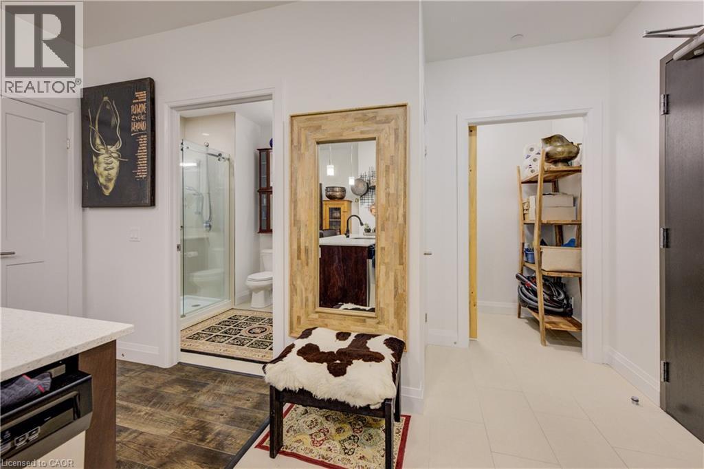 Welcome to urban living at its finest in this stylish 1-bedroom, 1-bath condo on the 4th floor of Kitchener’s sought-after Barra on Queen Condos! From the moment you step inside, the custom design and thoughtful upgrades set this unit apart. The modern kitchen boasts an extended island with seating, perfect for entertaining or enjoying your morning coffee. The open-concept layout flows seamlessly to a spacious living area and out to your private balcony with plenty of room for seating, an ideal spot to relax and soak in the view. The bathroom has been beautifully updated with a sleek walk-in shower, offering a modern and functional touch. Just off the entryway, a stylish barn door leads to the in-unit laundry, full-size machines and smart design that maximize space without sacrificing convenience. With your own parking spot and thoughtful layout throughout, this condo is designed for easy, everyday living. Enjoy amenities galore right at your doorstep: a fully equipped gym, bookable party room, outdoor BBQ space, and even a pet run for your four-legged friends. And the location? Absolutely dynamite, steps to Victoria Park, the LRT, trendy restaurants, nightlife, shops, public transit, and all of Downtown Kitchener’s best festivals and events. Whether you’re a first-time buyer, investor, or downsizer, this condo checks all the boxes for modern city living. Don’t miss your chance to call this stylish space home! (id:49203)