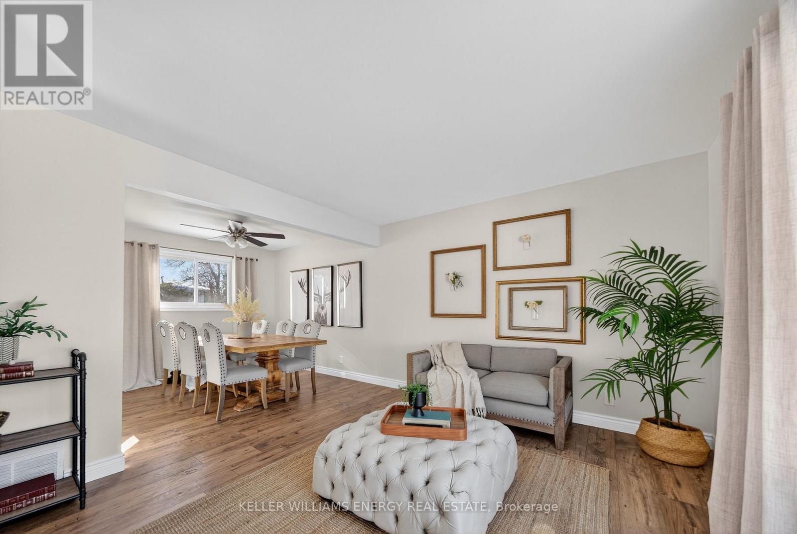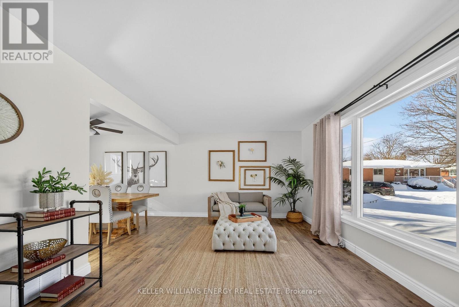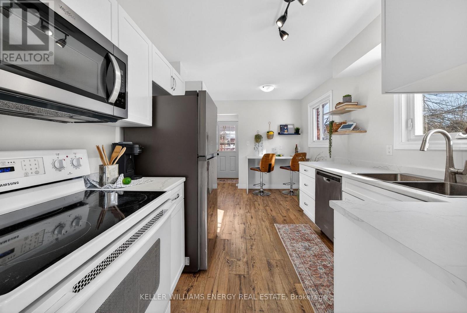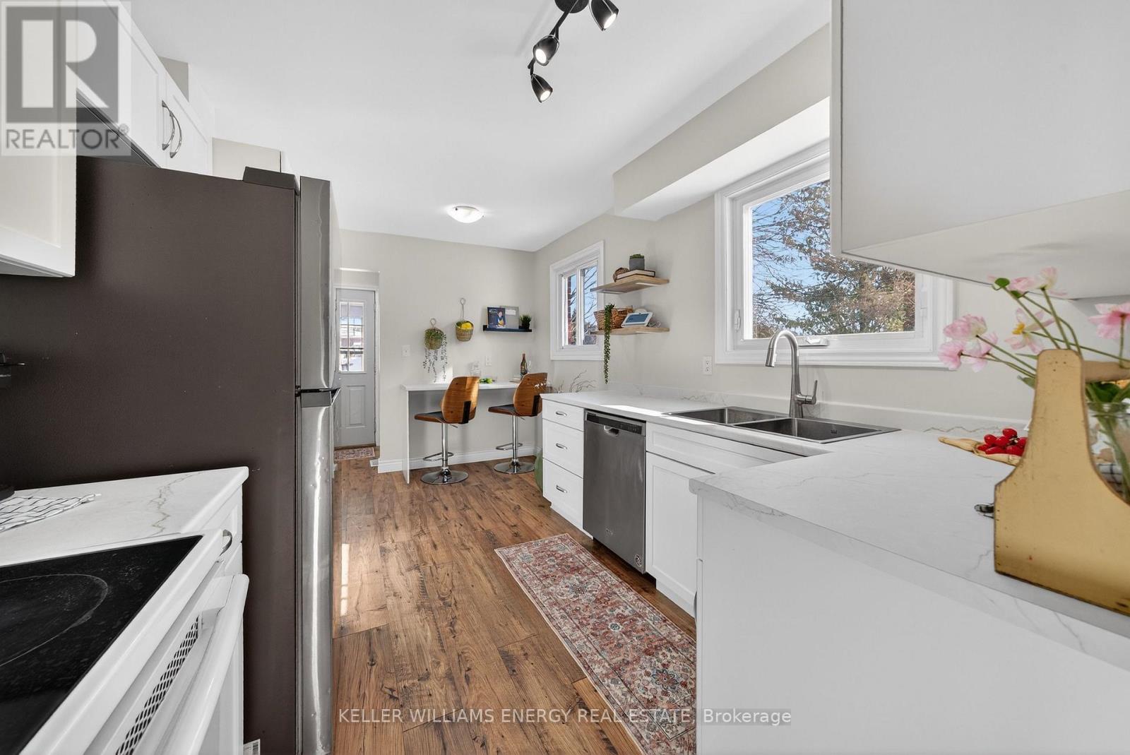 See Video & Virtual Tour links. Welcome to this beautifully updated 4-bedroom, 1.5-bath home, located on a quiet, family-friendly street in a desirable West-end Belleville neighbourhood. This move-in-ready property offers thoughtful upgrades throughout. The fully updated kitchen (2025) is the heart of the home, showcasing new stylish cabinetry, modern countertops, a deep sink with updated faucet, built-in microwave, and a breakfast bar-perfect for everyday living and entertaining. The spacious living room features ample seating space and a large bay window that fills the home with natural light. The dining room flows into both the living room and kitchen, ideal for family meals and gatherings. A convenient main-floor 2-piece bathroom, located near the carport entrance, has been updated with a new vanity and fixtures. Upstairs, you'll find four generously sized bedrooms and a refreshed 4-piece bathroom with a new vanity, vinyl flooring, and fixtures (2025), a newer bathtub and surround. Throughout the freshly painted home, all-new water-resistant laminate flooring (2025) provides a bright, cohesive finish. Additional updates include multiple newer windows (2020 & 2025). The hot water tank is owned and there is central air conditioning. Fibre optic internet is available-ideal for video conferencing, home security systems, and gaming. Enjoy a fantastic lifestyle location with walkable access to the Belleville waterfront trail, Zwick's Waterfront Park, great schools, convenience stores, box stores, quick dining options, and more. Simply unpack and enjoy-this is a well-maintained, thoughtfully upgraded home in an excellent Belleville location. (id:49203)