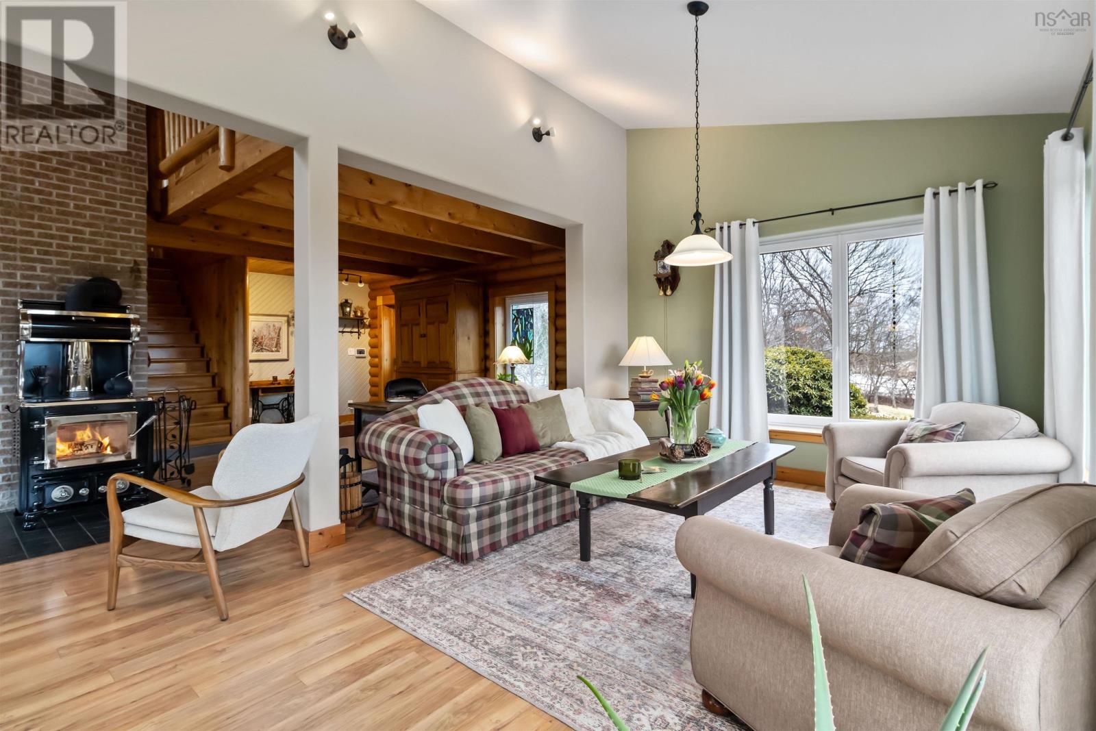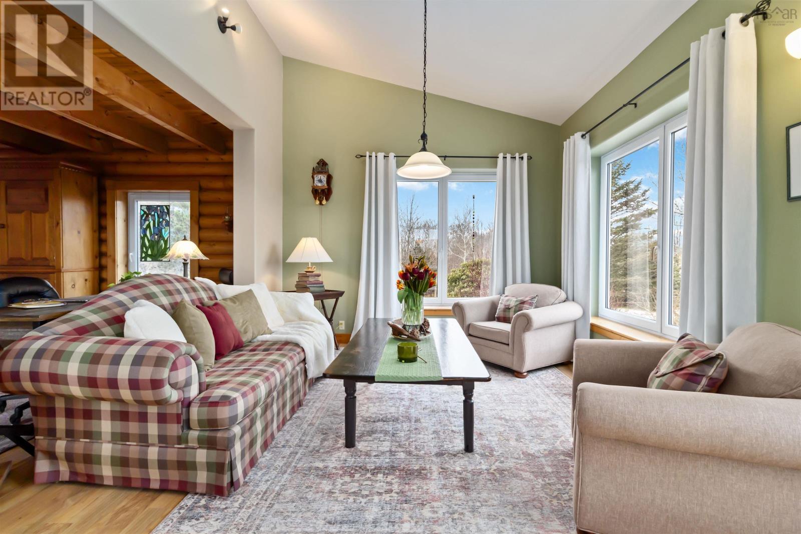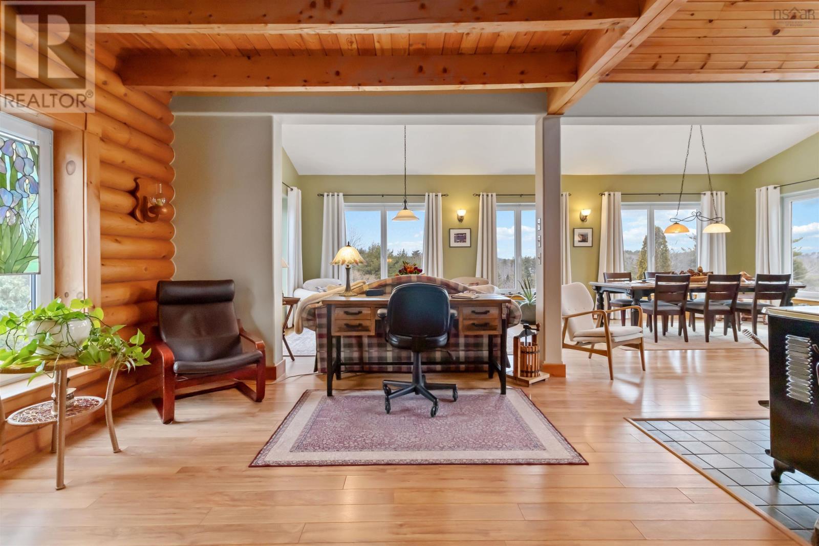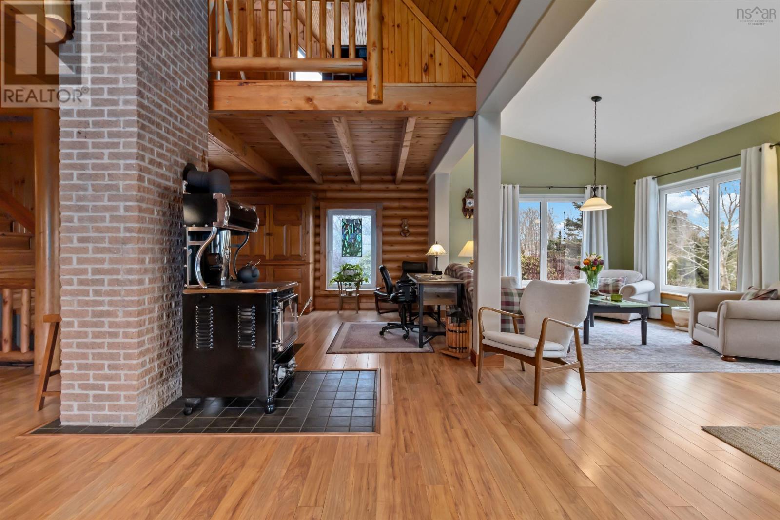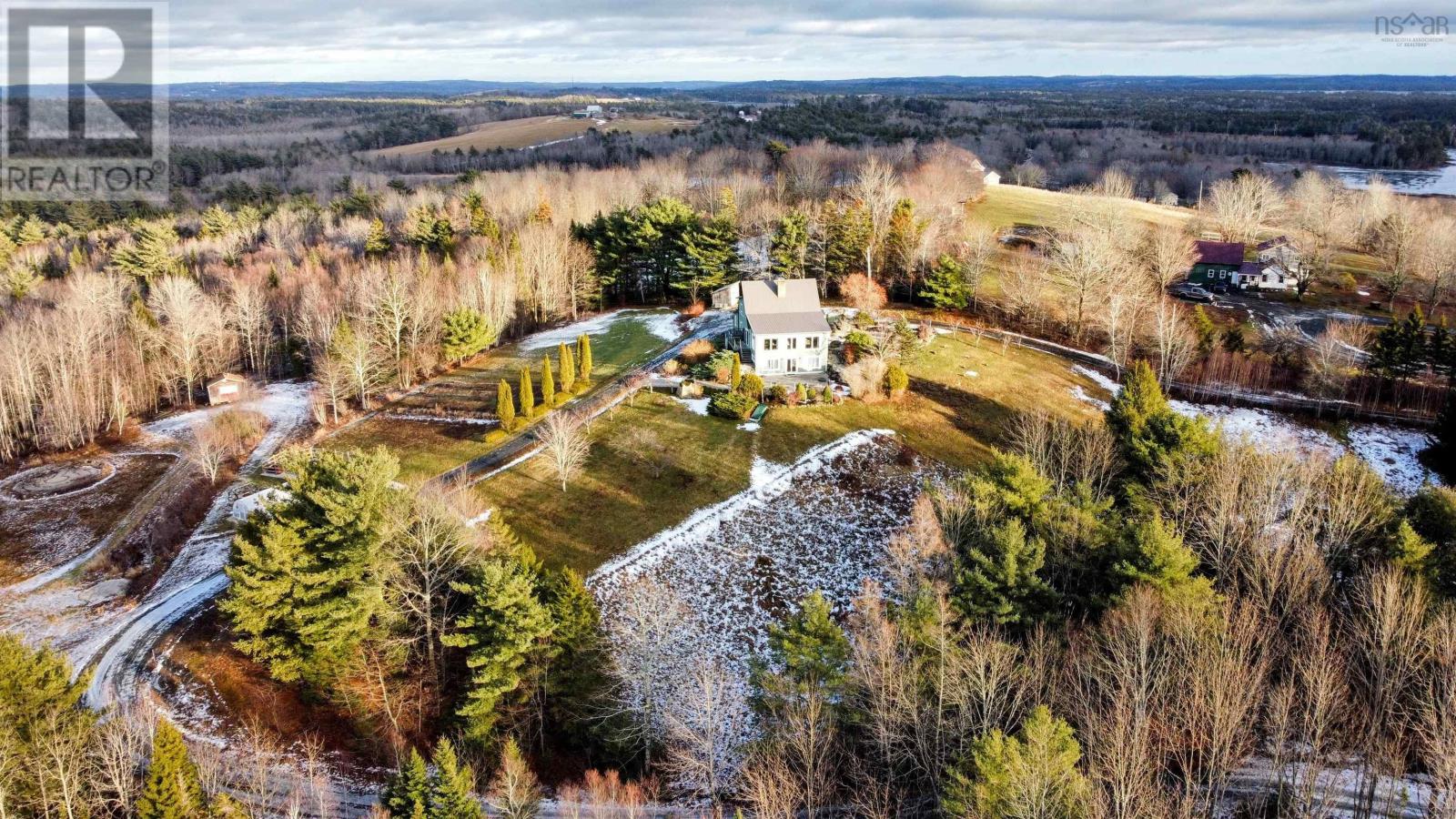The perfect combination of nature and convenience. Welcome to 4058 Highway 325! Nestled on a hill with two driveway entrances and a beautiful view of over 38 acres of partially cleared land, this stunning chalet-style home offers a cozy atmosphere with Hallmark movie vibes; making it the best possible space for a massive Christmas tree. Milled from the same land it sits on, the home features log construction with ICF extensions, high-speed internet, and passive solar windows that help keep the electricity bill a fraction of what you would expect for a house with over 3,000 finished square feet. The open-plan main level boasts towering vaulted ceilings over the central living space. The kitchen offers bar seating and features Corian countertops, and a propane stove. One of two beautiful WETT-certified woodstoves is the centrepiece of the main floor to keep you warm during parties in the huge dining nook. With three bedrooms and three full baths - including a master ensuite and a 3PC bath with a soaker tub - the layout is highly functional. There is even a separate office area, entrance, and bathroom that could easily serve as an in-law suite. Don't forget the convenient laundry chute serving all floors to the basement workshop! Upstairs, an interior landing provides a cozy sitting area perfect for reading. Outside, the property is a staycation paradise with a pond, walking trails, two decks, patio, and firepit area. Developed vegetable and flower gardens, supported by a greenhouse, chicken coop, tool and woodshed ensure you will never lack something to do on a lazy weekend! Relax with the confidence of self-sufficiency: This home is equipped with a Generlink hookup, and a versatile heating system including a ductless heat pump and oil furnace. Explore and enjoy the beautiful South Shore while being located just 13 minutes from downtown Bridgewater and close to the UNESCO World Heritage Site of Lunenburg. 3D and cinematic video tour available. Book your showing today! (id:49203)