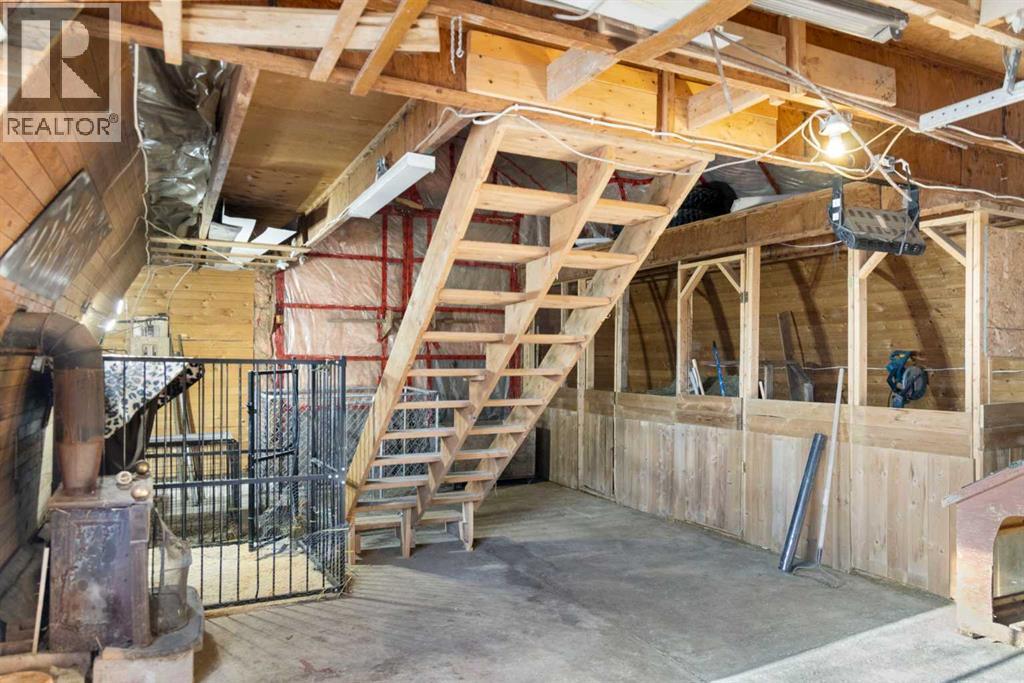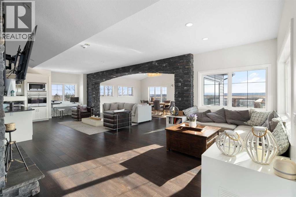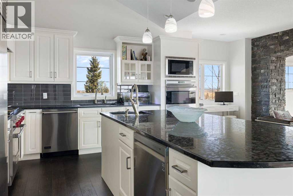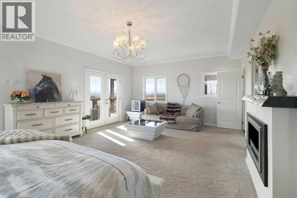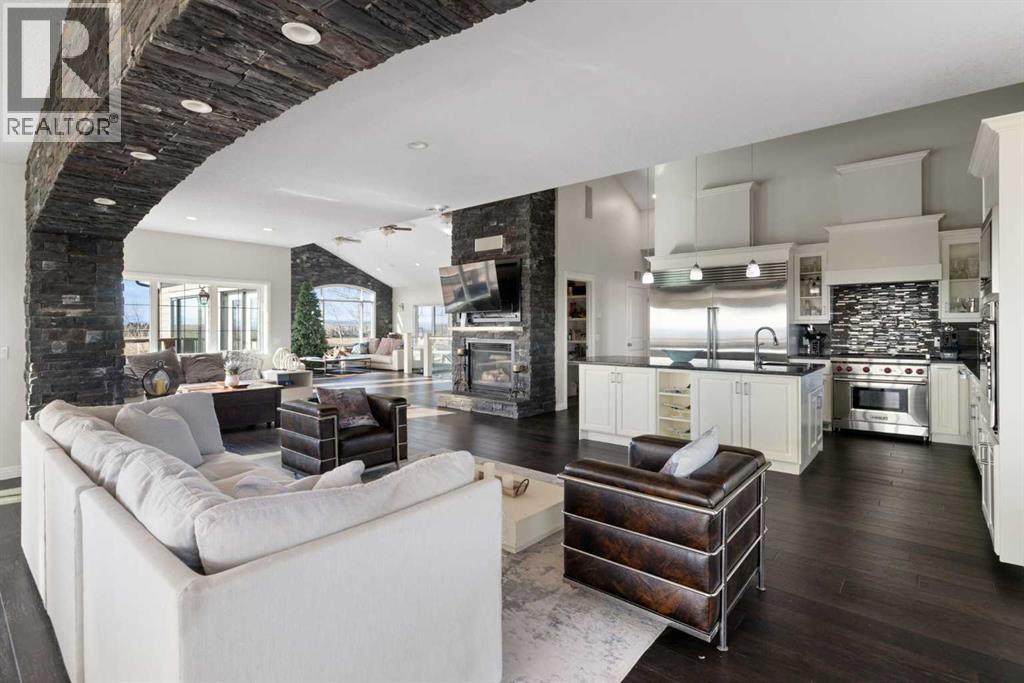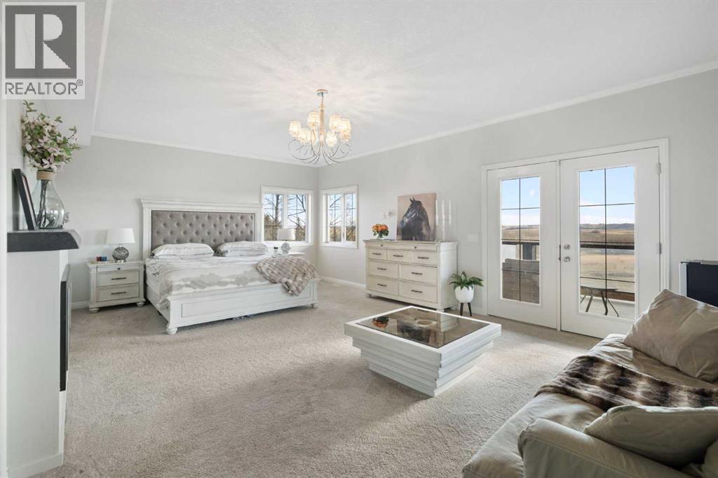 A lifestyle most only dream of! Historic Rocky Mountain views - just 8 minutes to Cochrane! Gorgeous custom-designed two-storey home featuring 4 bedrooms and 3.5 baths, with over 4900 sqft of developed living, AND 1,200 sq.ft. of wraparound decking on two levels.The main floor offers a smart, functional layout with three spacious bedrooms, including a massive primary retreat complete with a huge walk-in closet and luxurious 4-piece ensuite. Two additional bedrooms share another 4-piece bathroom with convenient main-floor laundry.Upstairs, the panoramic mountain views steal the show. The open-concept living space features 20-ft beamed ceilings, a cozy fireplace with built-in bench seating, and direct access to the south-facing deck. The chef-inspired kitchen showcases a full-size Sub-Zero fridge and freezer, granite island with seating, pot-filler over a Wolf six-burner gas range, walk-in pantry, and thoughtful design for everyday family life or large gatherings. The dining area, surrounded by three walls of windows, opens through French doors to another expansive deck — perfect for entertaining or soaking up the scenery.The walkout lower level expands your living options with a spacious one-bedroom suite (approx. 1,450 sq.ft.) featuring an open kitchen, dining, and living area, plus a media room/office, 3-piece bath, and laundry. A private entry makes it ideal for extended family, a caregiver, and successful short/long-term rental income. An interior locking door provides flexibility and security. Lots of options here.The oversized two-storey heated garage with attached carport ensures ample parking and storage.Outdoors, this fully fenced property includes manual entry gates, a quonset, and a charming barn with box and standing stalls, tack room, and loft (no power). Multiple paddocks, pastures with auto-waterers, two horse shelters, and a fenced dog run complete the setup.Enjoy peaceful rural living just minutes from Cochrane — with school bus service, shopping, and entertainment nearby. A short drive takes you to the Rockies and Alberta’s best outdoor playground.Book your private viewing today — this property truly needs to be experienced in person. (id:49203)