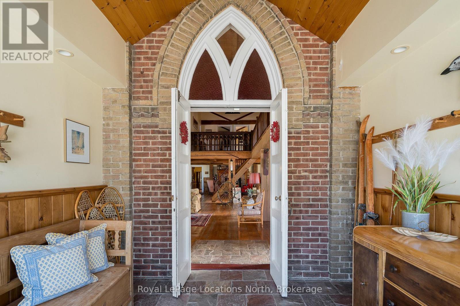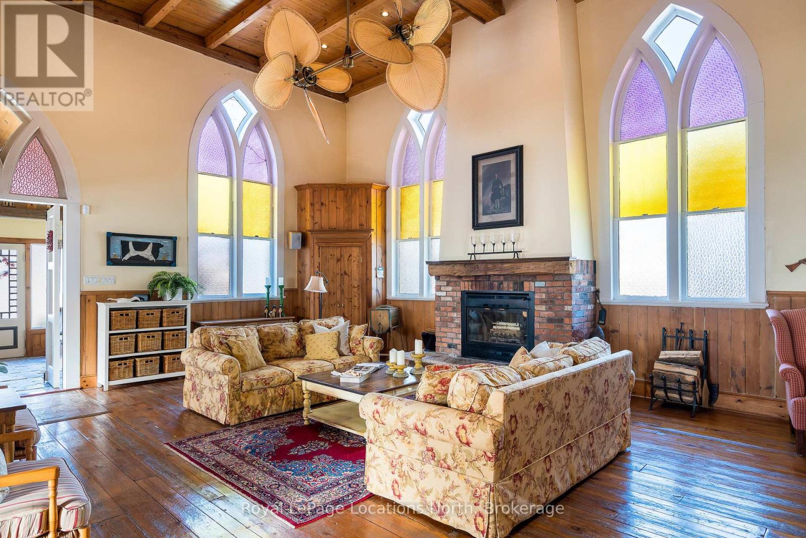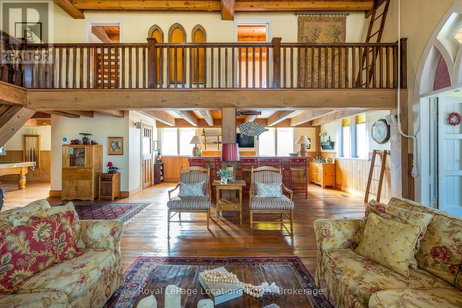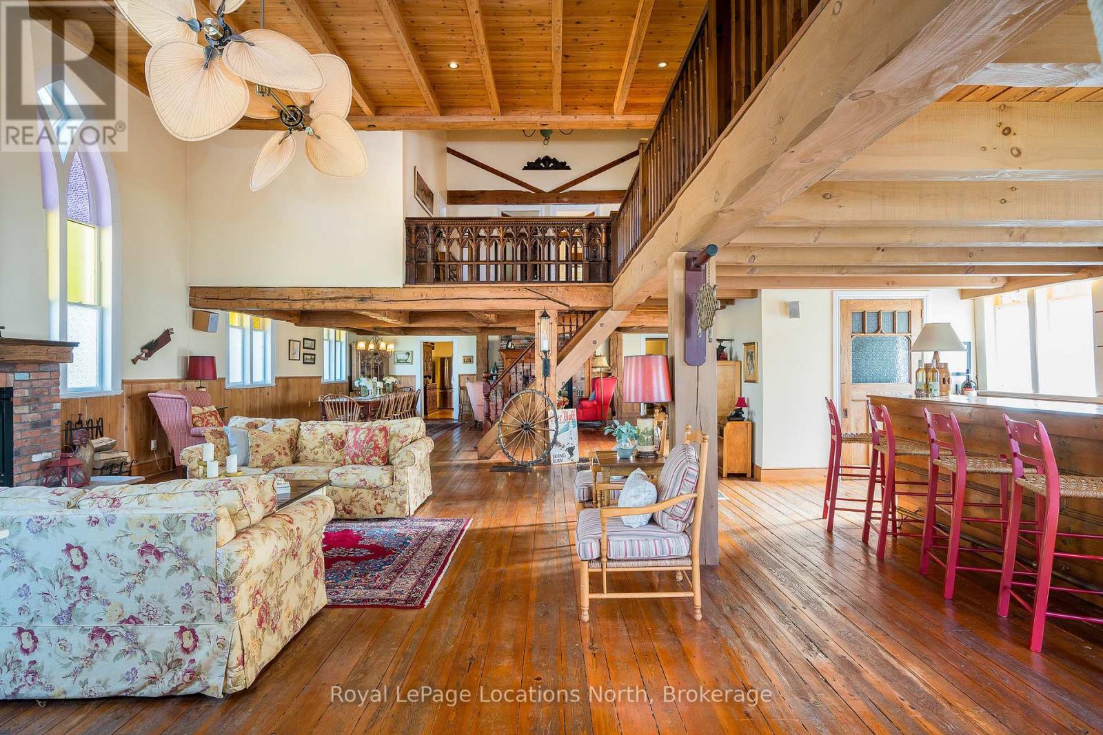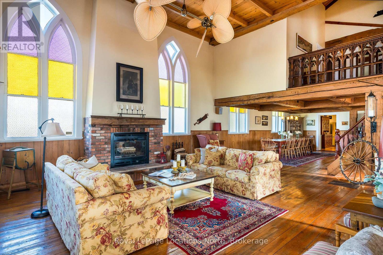 When you step inside this unique, renovated 1897 church, you can't help but imagine the fabulous holidays your family and friends would enjoy here. On the main street of the charming village of Nottawa, this is a home meant for gathering. This rare opportunity is absolutely full of thoughtful touches and decor lavished on it by its current owners, and all those touches are included in the sale. Furnishings, linens, rugs, art, lamps, antiques, even the dishes, all come with the house so moving in will be easy. Your family will enjoy the restful and restorative atmosphere of the main floor with the soft light of stained glass. The sprawling living space under post and beam cathedral ceilings has a chalet like feel. It features a primary seating area in front of a wood burning fireplace with a wonderful long and welcoming bar for entertaining. The bar itself was recovered from an old general store. An adjoining space houses another seating area in front of a gas fireplace and a large billiards table. The dining table seats 14 so no card tables will be necessary. Each space is wide open yet beautifully defined with a combination of historic details and new improvements. You will have room for all your guests in the five upstairs bedrooms, all stylishly decorated and all enjoying the comforting glow of stained glass windows.The main floor den has a pull out sofa bed and an ensuite bathroom for additional sleeping quarters. It is a home to wander in, explore, and bask in its warmth and coziness. Outside, a large backyard deck allows space for an oversized bbq and an enormous hot tub, all under a beautiful canopy of mature trees. Multiple sheds for storage and potting make maintenance easy -- and even the garden equipment is included. (id:49203)