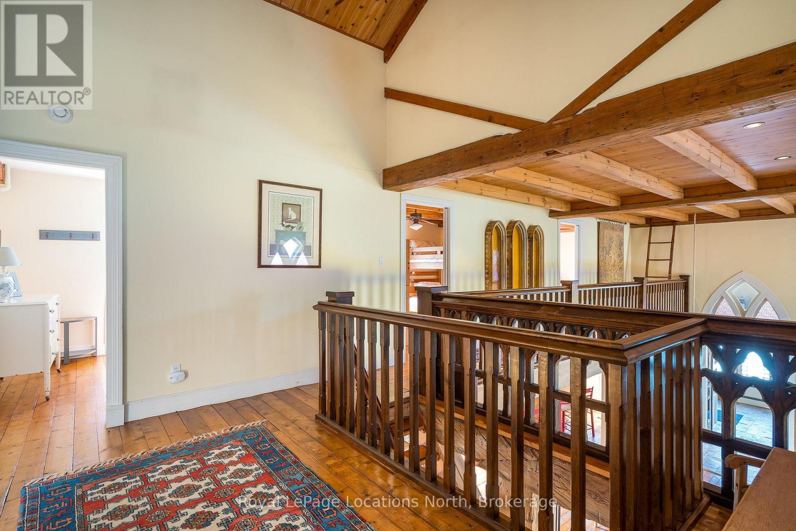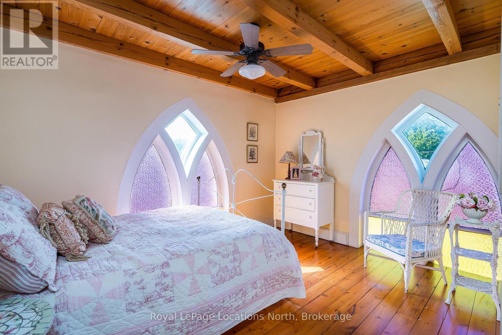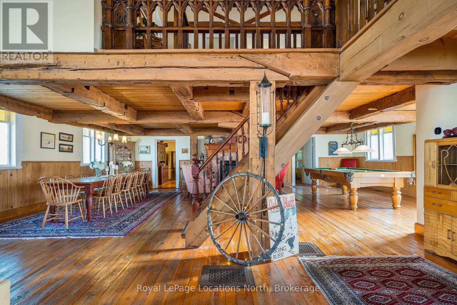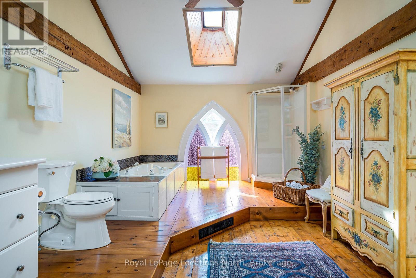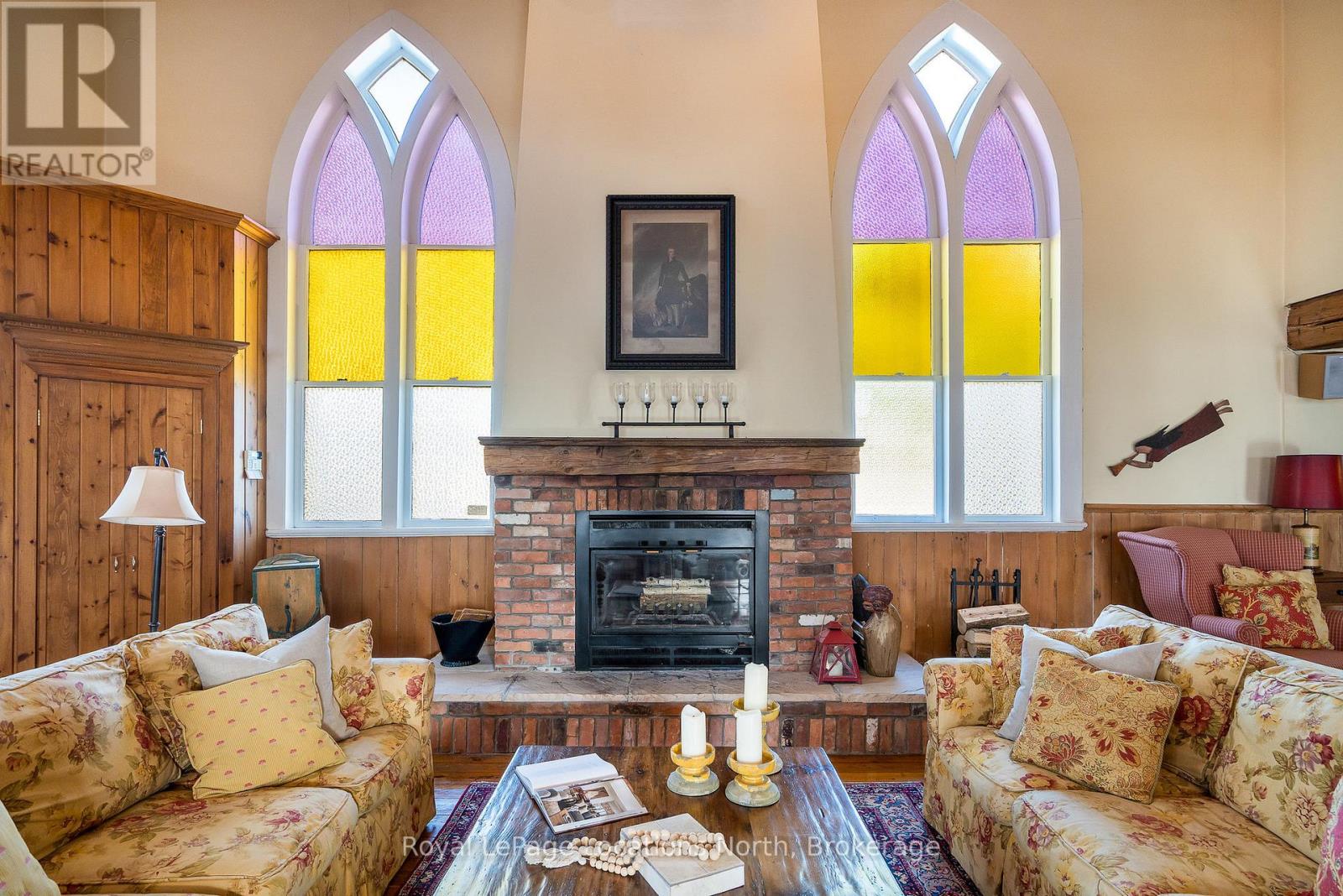 When you step inside this unique, renovated 1897 church, you can't help but imagine the fabulous holidays your family and friends would enjoy here. On the main street of the charming village of Nottawa, this is a home meant for gathering. This rare opportunity is absolutely full of thoughtful touches and decor lavished on it by its current owners, and all those touches are included in the sale. Furnishings, linens, rugs, art, lamps, antiques, even the dishes, all come with the house so moving in will be easy. Your family will enjoy the restful and restorative atmosphere of the main floor with the soft light of stained glass. The sprawling living space under post and beam cathedral ceilings has a chalet like feel. It features a primary seating area in front of a wood burning fireplace with a wonderful long and welcoming bar for entertaining. The bar itself was recovered from an old general store. An adjoining space houses another seating area in front of a gas fireplace and a large billiards table. The dining table seats 14 so no card tables will be necessary. Each space is wide open yet beautifully defined with a combination of historic details and new improvements. You will have room for all your guests in the five upstairs bedrooms, all stylishly decorated and all enjoying the comforting glow of stained glass windows.The main floor den has a pull out sofa bed and an ensuite bathroom for additional sleeping quarters. It is a home to wander in, explore, and bask in its warmth and coziness. Outside, a large backyard deck allows space for an oversized bbq and an enormous hot tub, all under a beautiful canopy of mature trees. Multiple sheds for storage and potting make maintenance easy -- and even the garden equipment is included. (id:49203)