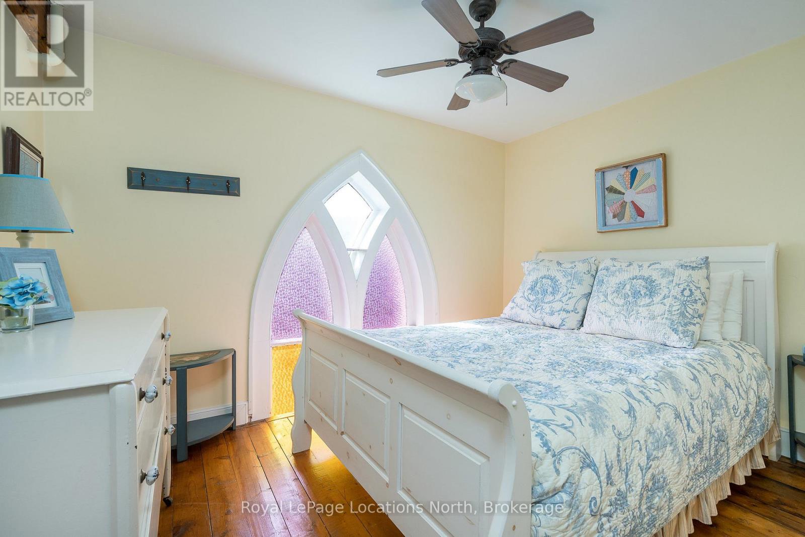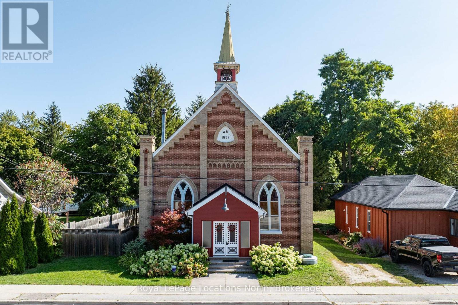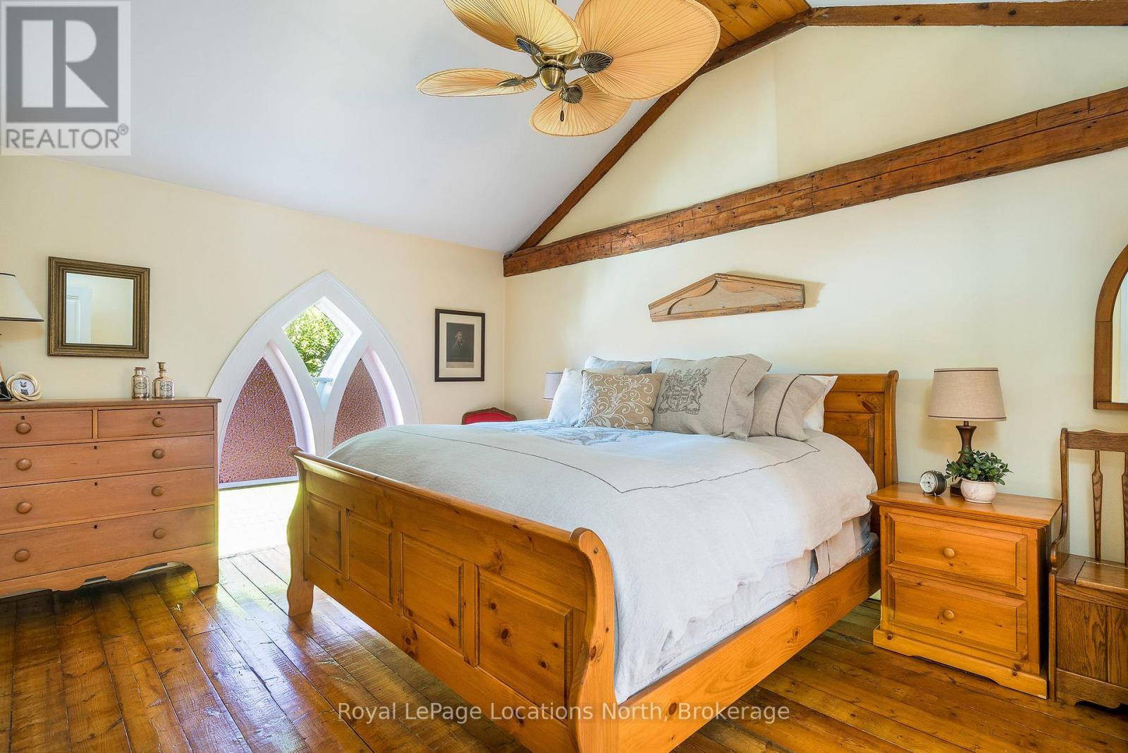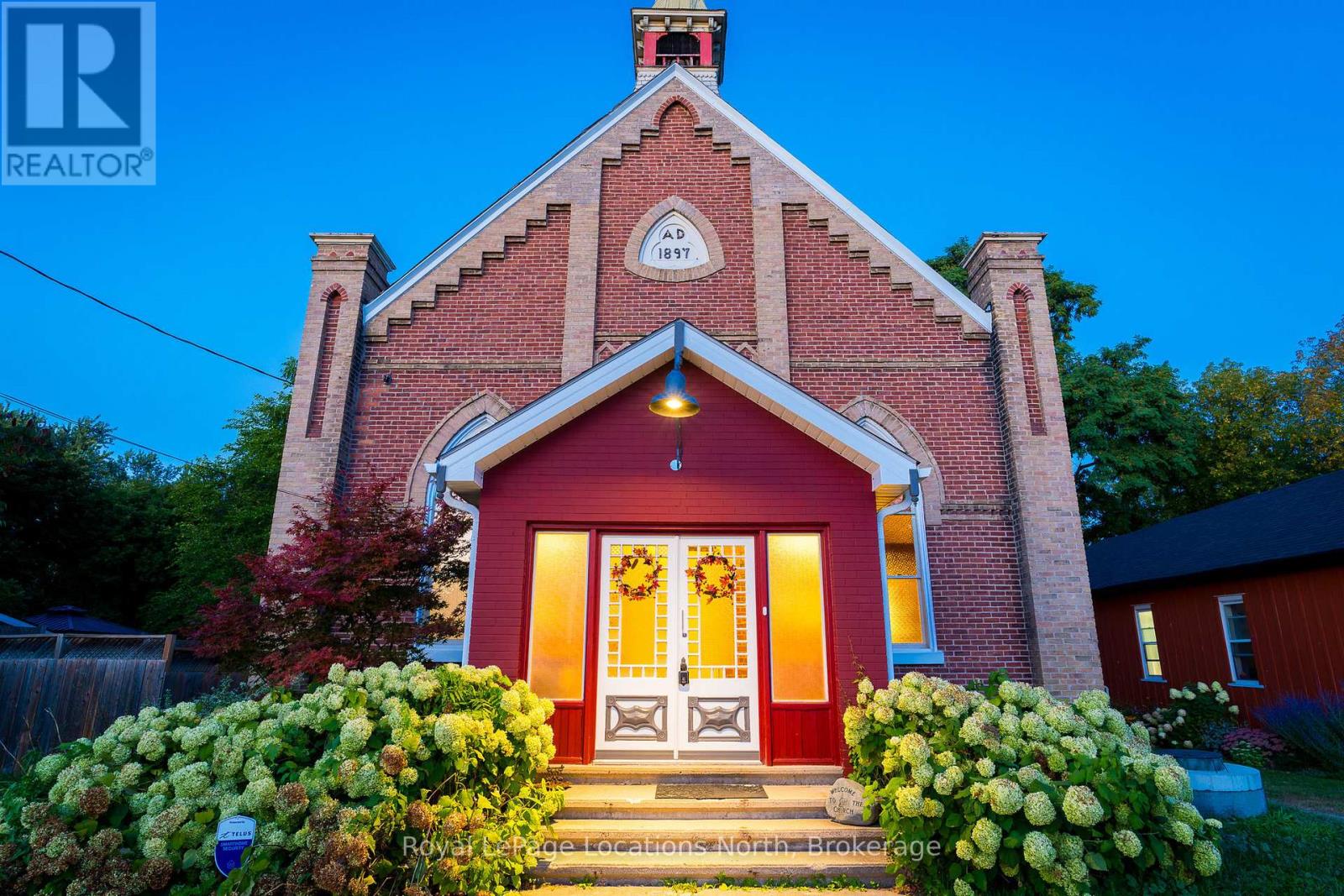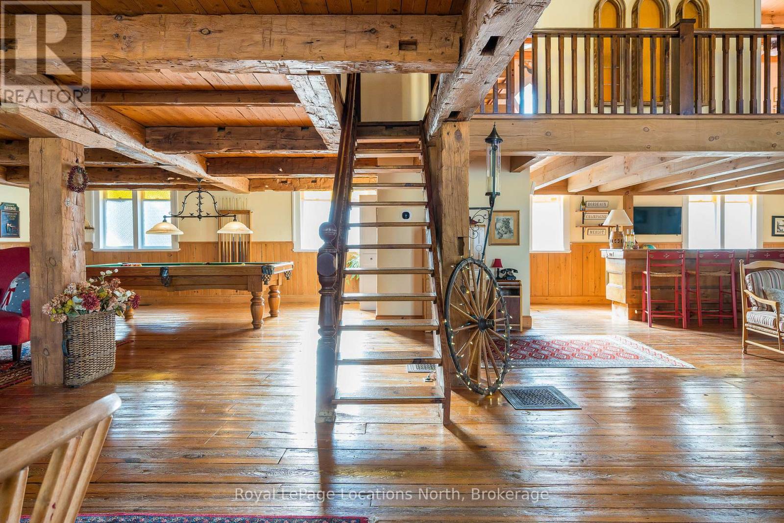 When you step inside this unique, renovated 1897 church, you can't help but imagine the fabulous holidays your family and friends would enjoy here. On the main street of the charming village of Nottawa, this is a home meant for gathering. This rare opportunity is absolutely full of thoughtful touches and decor lavished on it by its current owners, and all those touches are included in the sale. Furnishings, linens, rugs, art, lamps, antiques, even the dishes, all come with the house so moving in will be easy. Your family will enjoy the restful and restorative atmosphere of the main floor with the soft light of stained glass. The sprawling living space under post and beam cathedral ceilings has a chalet like feel. It features a primary seating area in front of a wood burning fireplace with a wonderful long and welcoming bar for entertaining. The bar itself was recovered from an old general store. An adjoining space houses another seating area in front of a gas fireplace and a large billiards table. The dining table seats 14 so no card tables will be necessary. Each space is wide open yet beautifully defined with a combination of historic details and new improvements. You will have room for all your guests in the five upstairs bedrooms, all stylishly decorated and all enjoying the comforting glow of stained glass windows.The main floor den has a pull out sofa bed and an ensuite bathroom for additional sleeping quarters. It is a home to wander in, explore, and bask in its warmth and coziness. Outside, a large backyard deck allows space for an oversized bbq and an enormous hot tub, all under a beautiful canopy of mature trees. Multiple sheds for storage and potting make maintenance easy -- and even the garden equipment is included. (id:49203)
