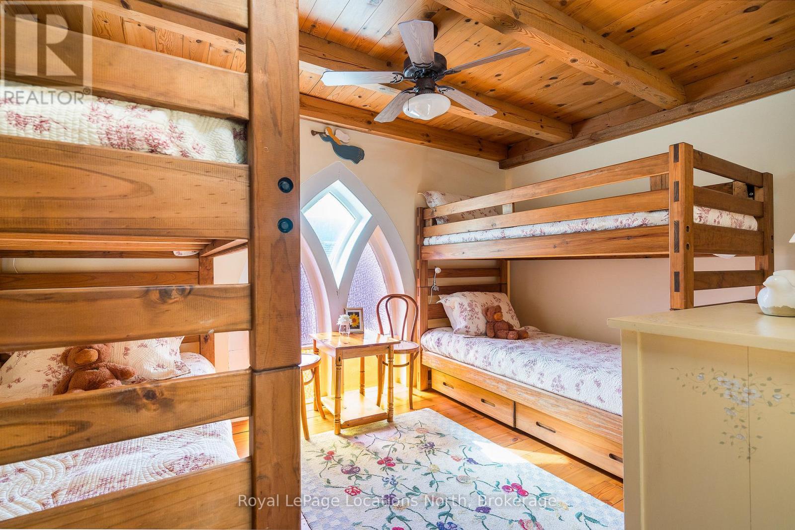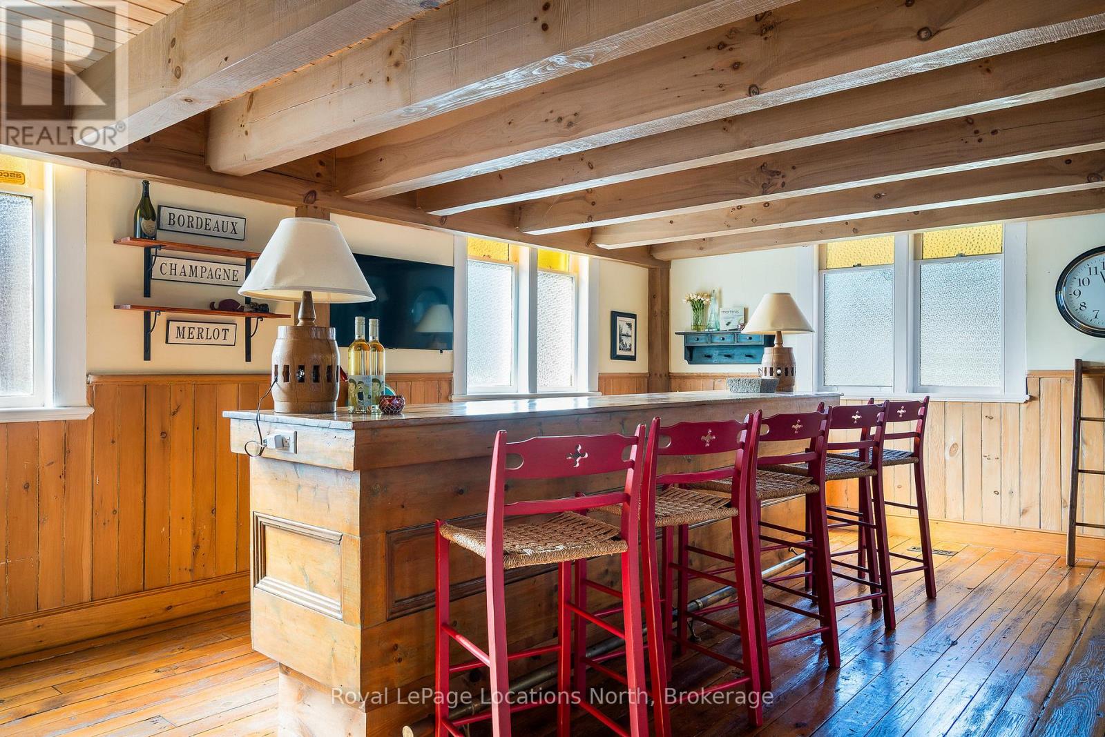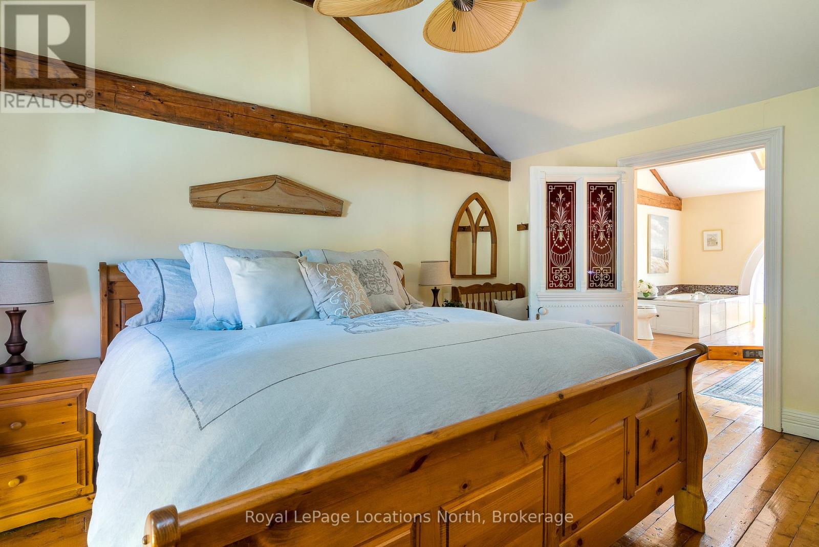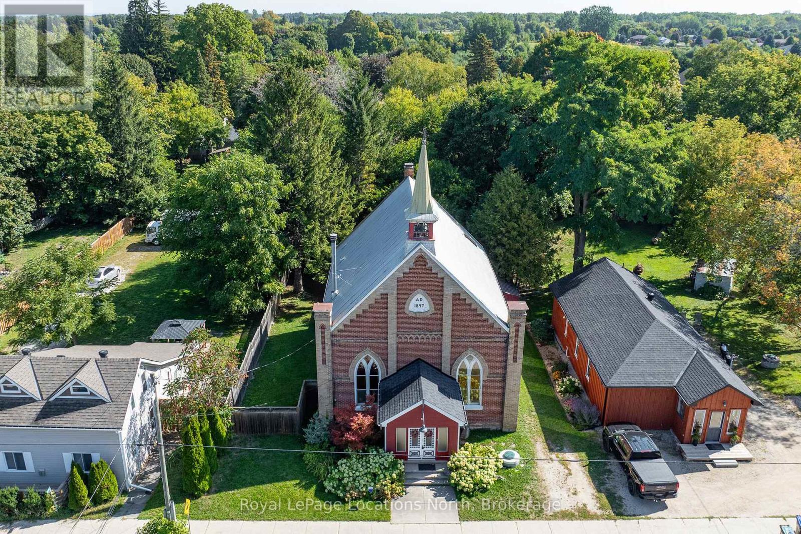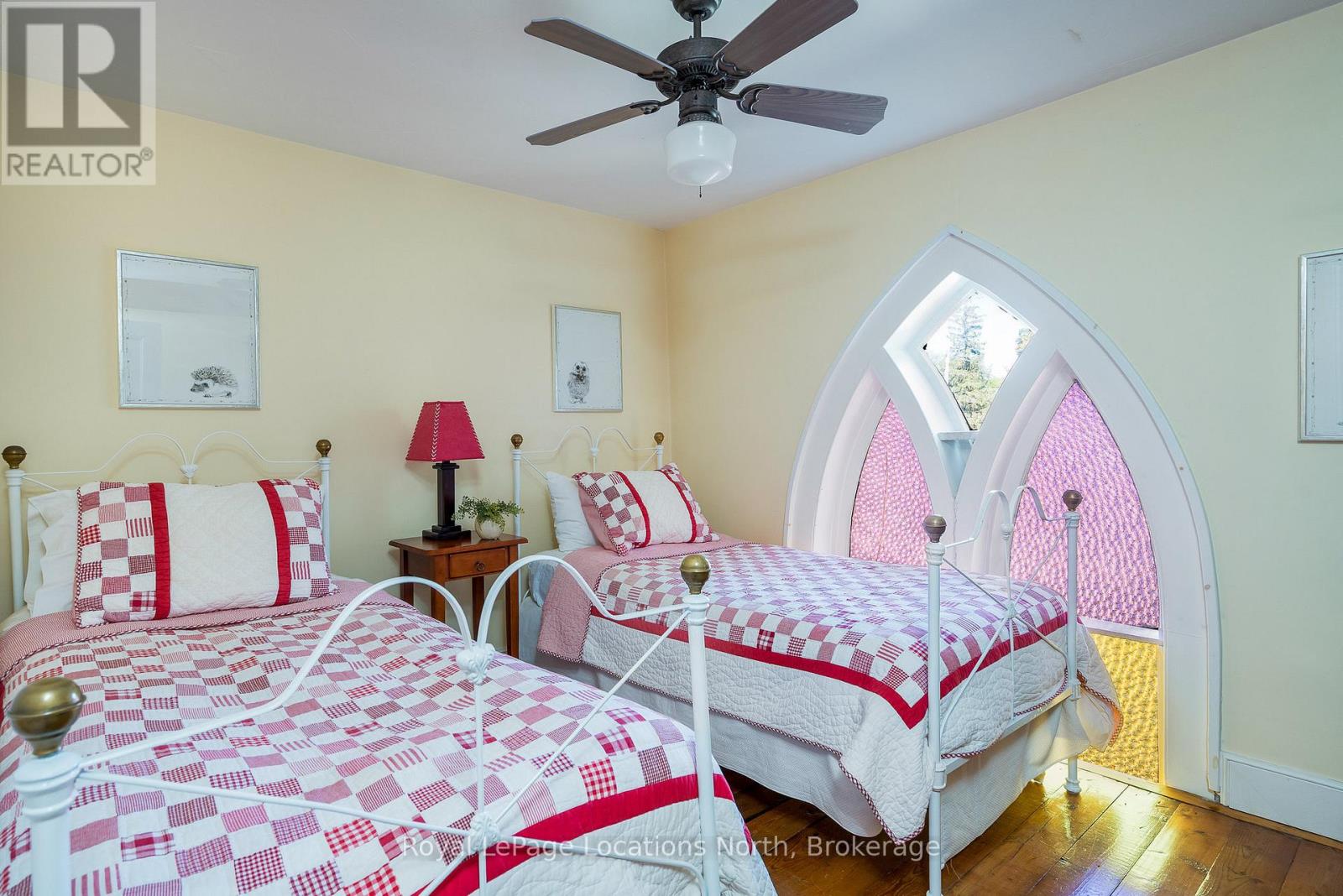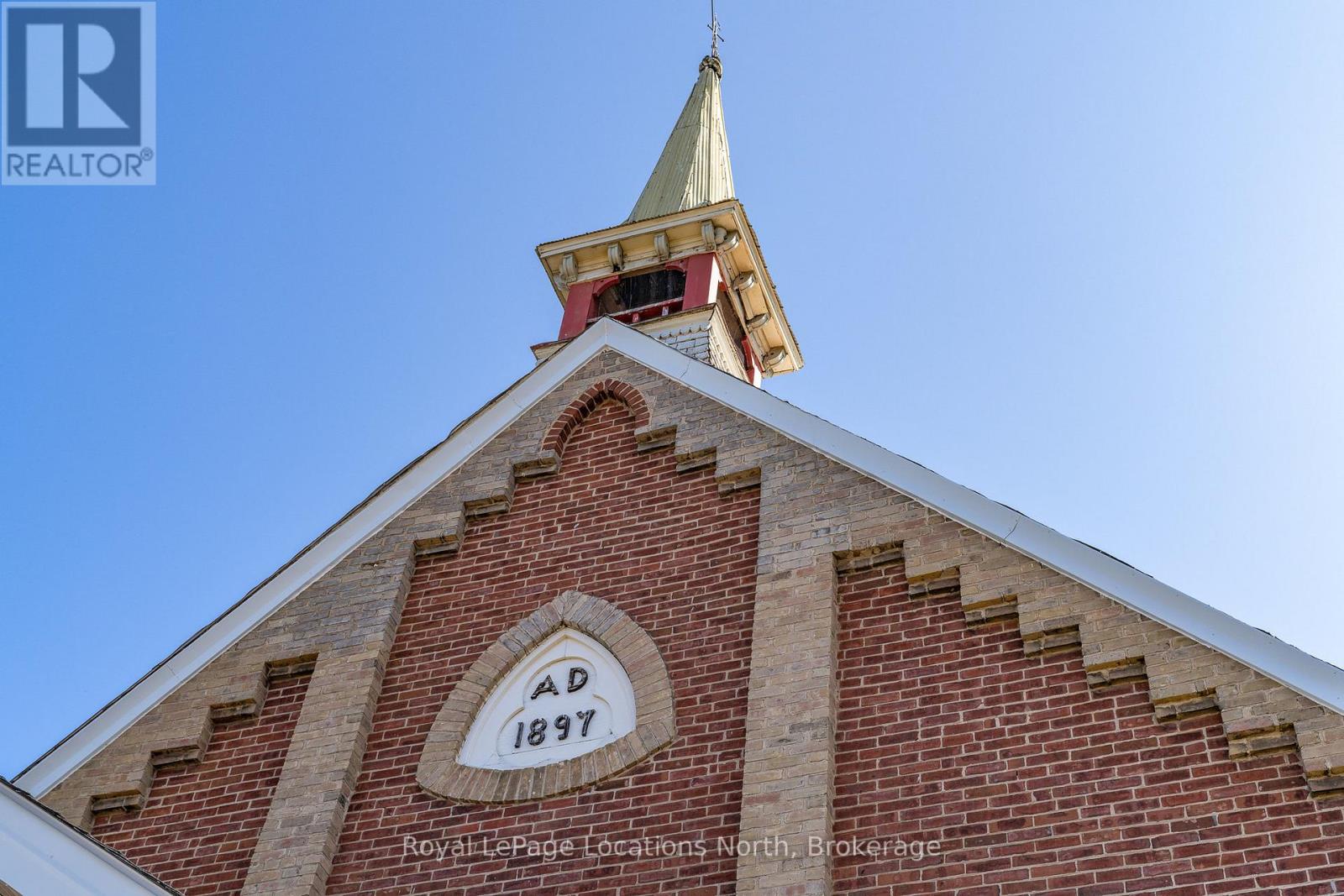 When you step inside this unique, renovated 1897 church, you can't help but imagine the fabulous holidays your family and friends would enjoy here. On the main street of the charming village of Nottawa, this is a home meant for gathering. This rare opportunity is absolutely full of thoughtful touches and decor lavished on it by its current owners, and all those touches are included in the sale. Furnishings, linens, rugs, art, lamps, antiques, even the dishes, all come with the house so moving in will be easy. Your family will enjoy the restful and restorative atmosphere of the main floor with the soft light of stained glass. The sprawling living space under post and beam cathedral ceilings has a chalet like feel. It features a primary seating area in front of a wood burning fireplace with a wonderful long and welcoming bar for entertaining. The bar itself was recovered from an old general store. An adjoining space houses another seating area in front of a gas fireplace and a large billiards table. The dining table seats 14 so no card tables will be necessary. Each space is wide open yet beautifully defined with a combination of historic details and new improvements. You will have room for all your guests in the five upstairs bedrooms, all stylishly decorated and all enjoying the comforting glow of stained glass windows.The main floor den has a pull out sofa bed and an ensuite bathroom for additional sleeping quarters. It is a home to wander in, explore, and bask in its warmth and coziness. Outside, a large backyard deck allows space for an oversized bbq and an enormous hot tub, all under a beautiful canopy of mature trees. Multiple sheds for storage and potting make maintenance easy -- and even the garden equipment is included. (id:49203)