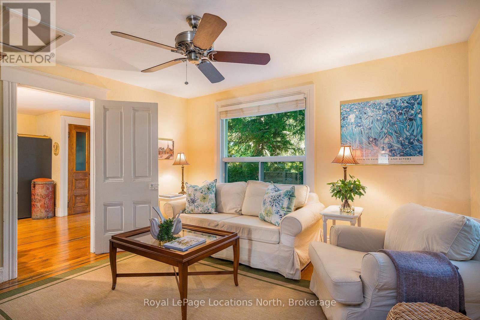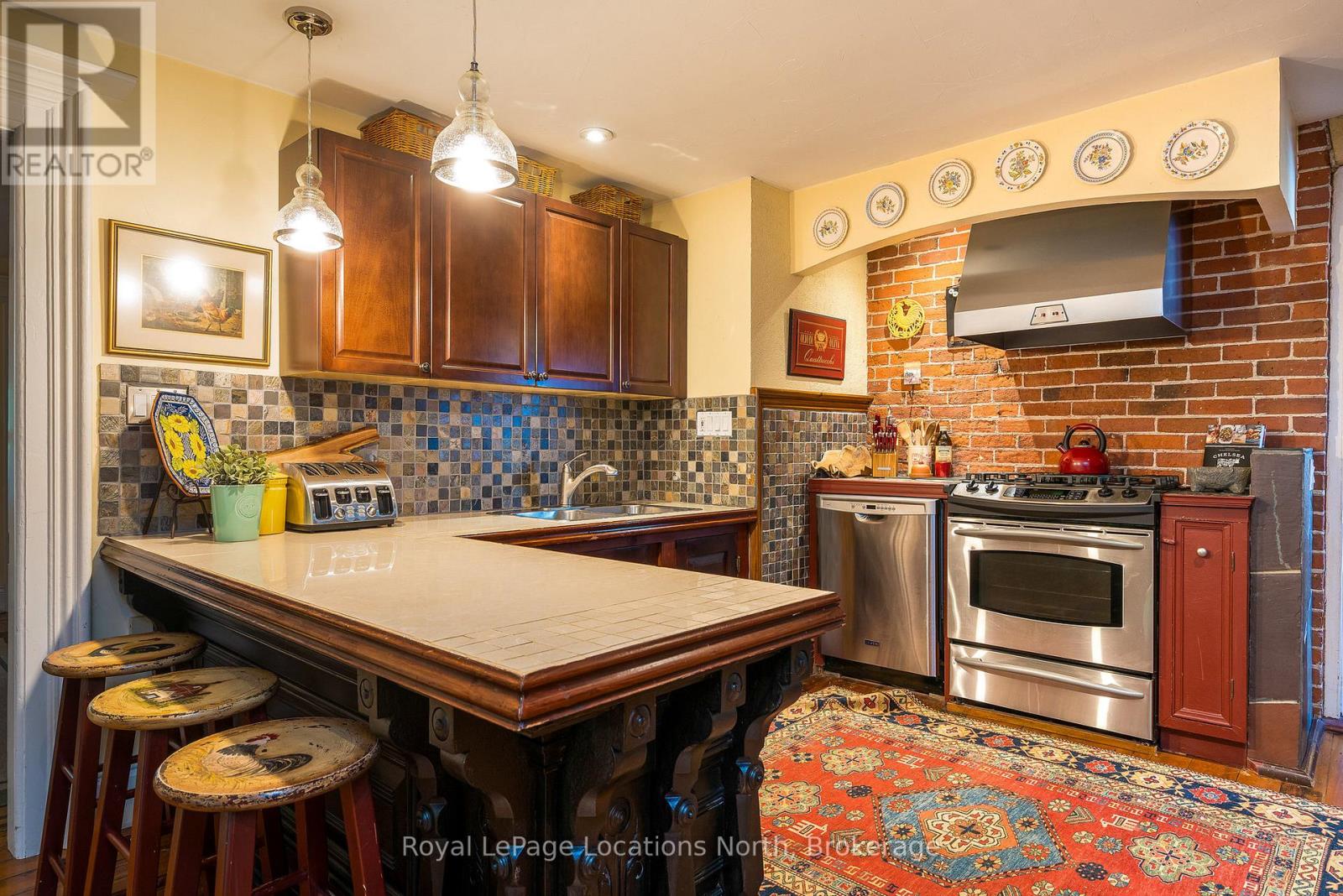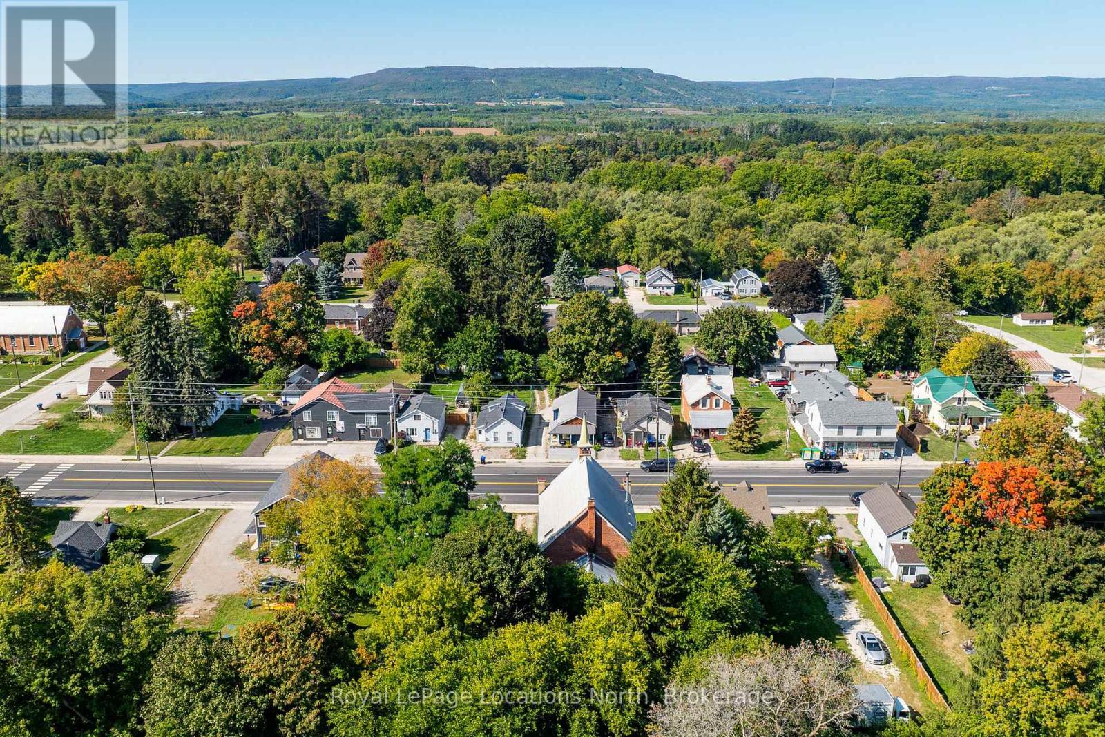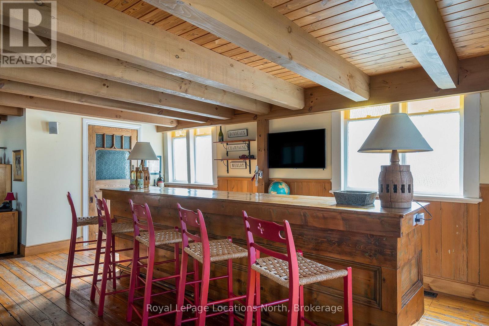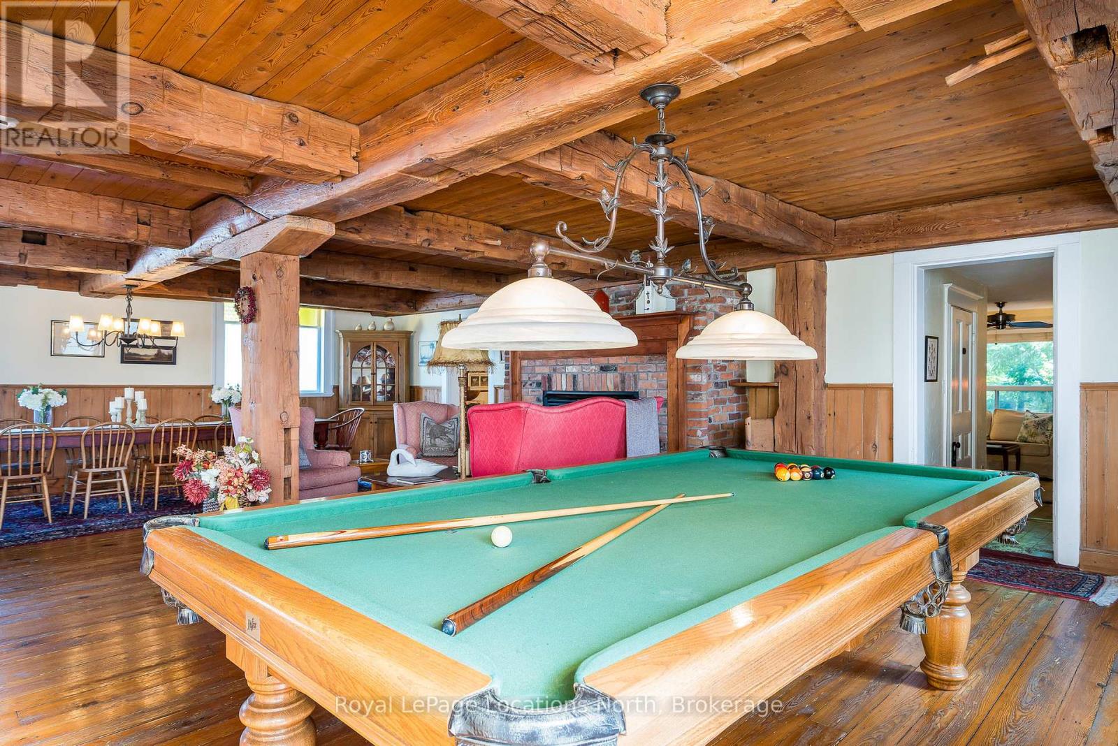 When you step inside this unique, renovated 1897 church, you can't help but imagine the fabulous holidays your family and friends would enjoy here. On the main street of the charming village of Nottawa, this is a home meant for gathering. This rare opportunity is absolutely full of thoughtful touches and decor lavished on it by its current owners, and all those touches are included in the sale. Furnishings, linens, rugs, art, lamps, antiques, even the dishes, all come with the house so moving in will be easy. Your family will enjoy the restful and restorative atmosphere of the main floor with the soft light of stained glass. The sprawling living space under post and beam cathedral ceilings has a chalet like feel. It features a primary seating area in front of a wood burning fireplace with a wonderful long and welcoming bar for entertaining. The bar itself was recovered from an old general store. An adjoining space houses another seating area in front of a gas fireplace and a large billiards table. The dining table seats 14 so no card tables will be necessary. Each space is wide open yet beautifully defined with a combination of historic details and new improvements. You will have room for all your guests in the five upstairs bedrooms, all stylishly decorated and all enjoying the comforting glow of stained glass windows.The main floor den has a pull out sofa bed and an ensuite bathroom for additional sleeping quarters. It is a home to wander in, explore, and bask in its warmth and coziness. Outside, a large backyard deck allows space for an oversized bbq and an enormous hot tub, all under a beautiful canopy of mature trees. Multiple sheds for storage and potting make maintenance easy -- and even the garden equipment is included. (id:49203)