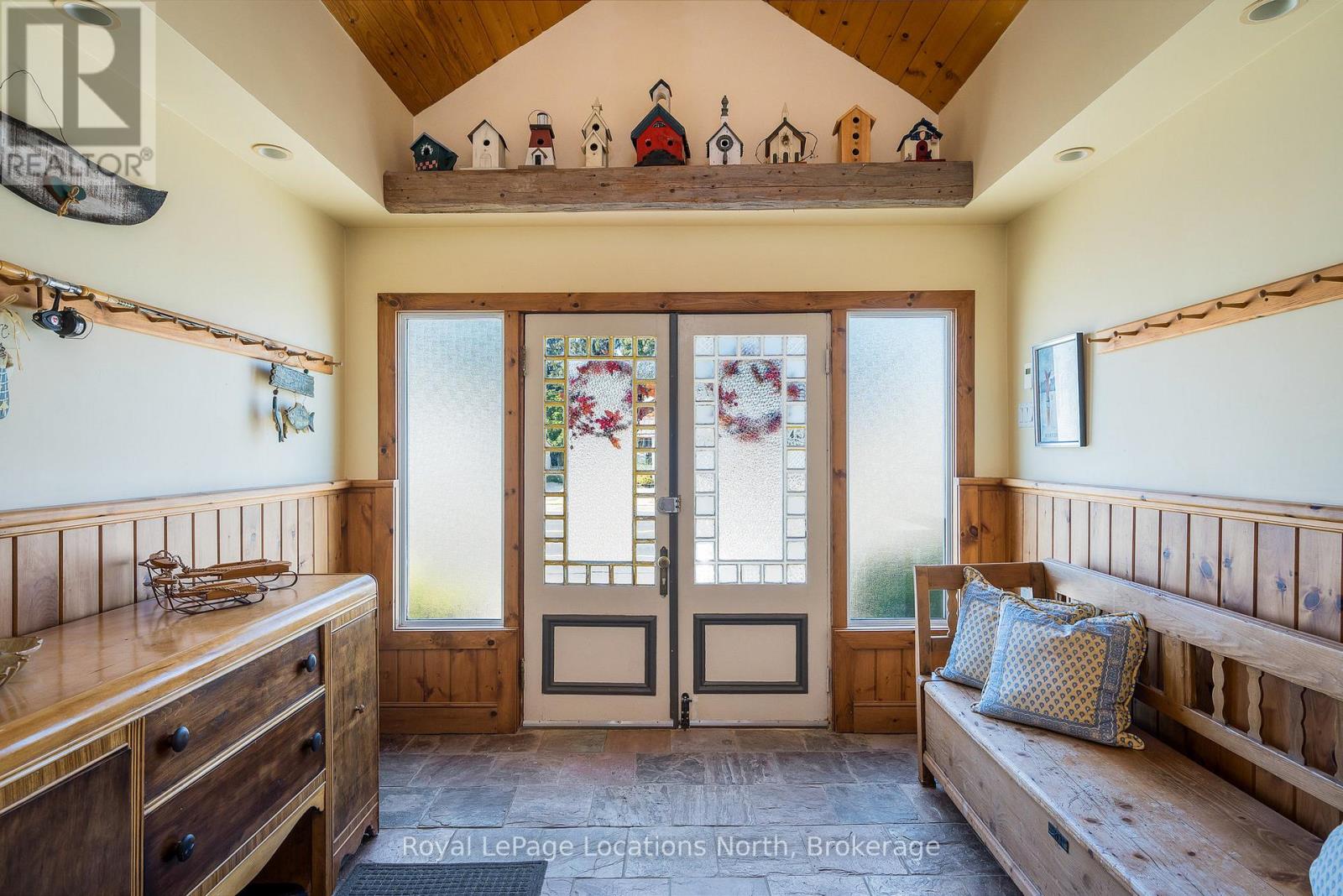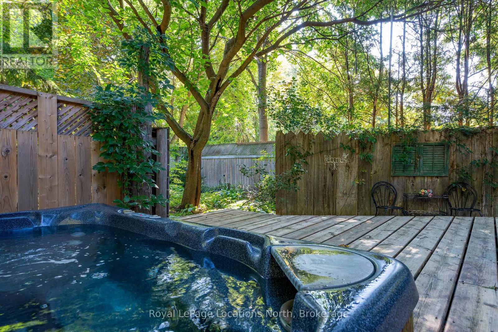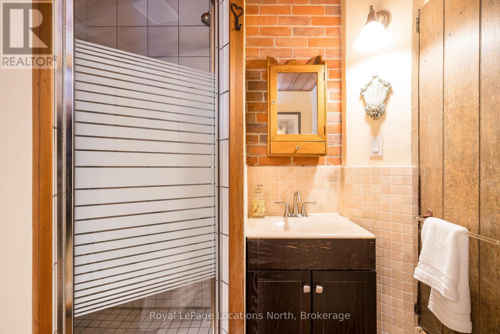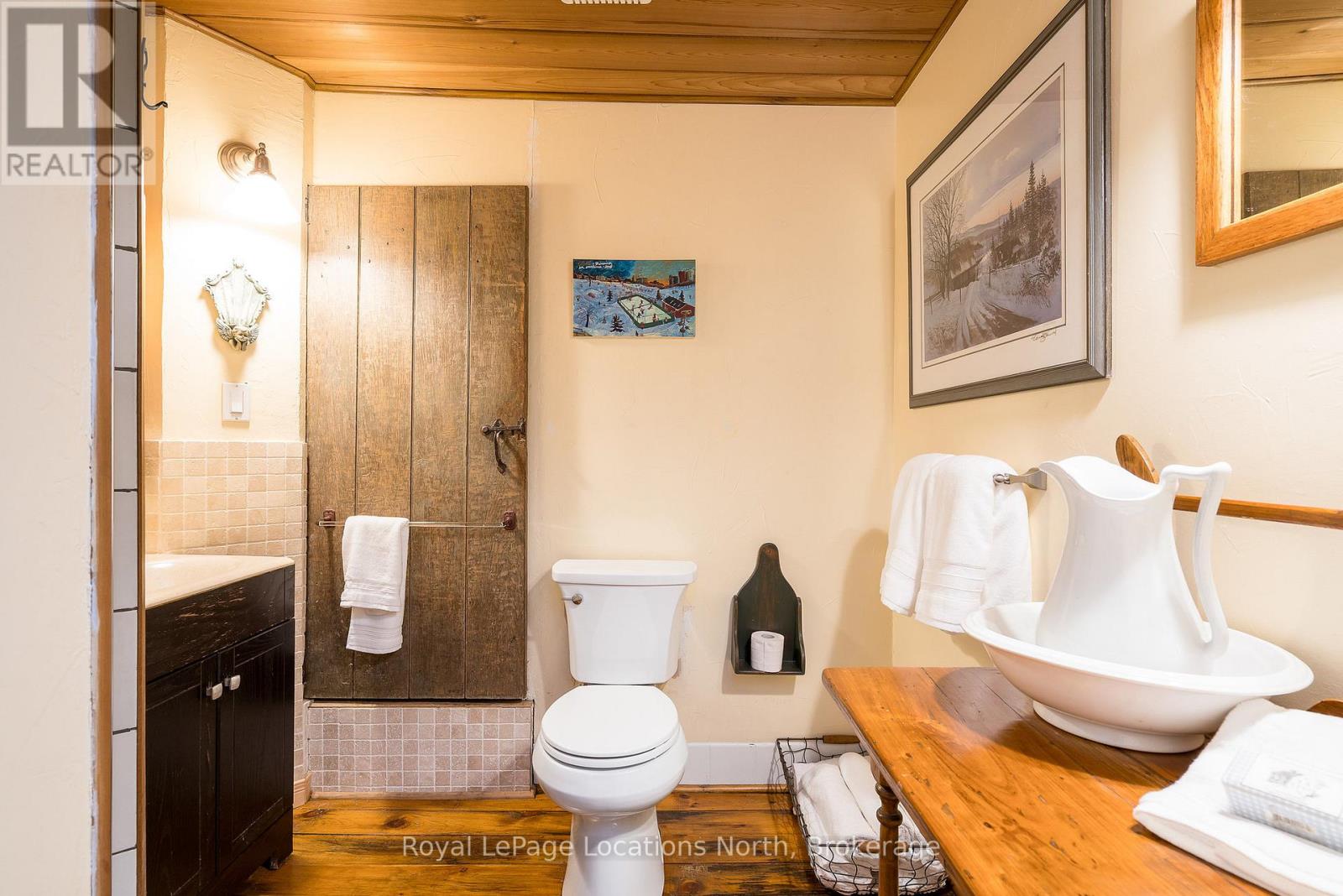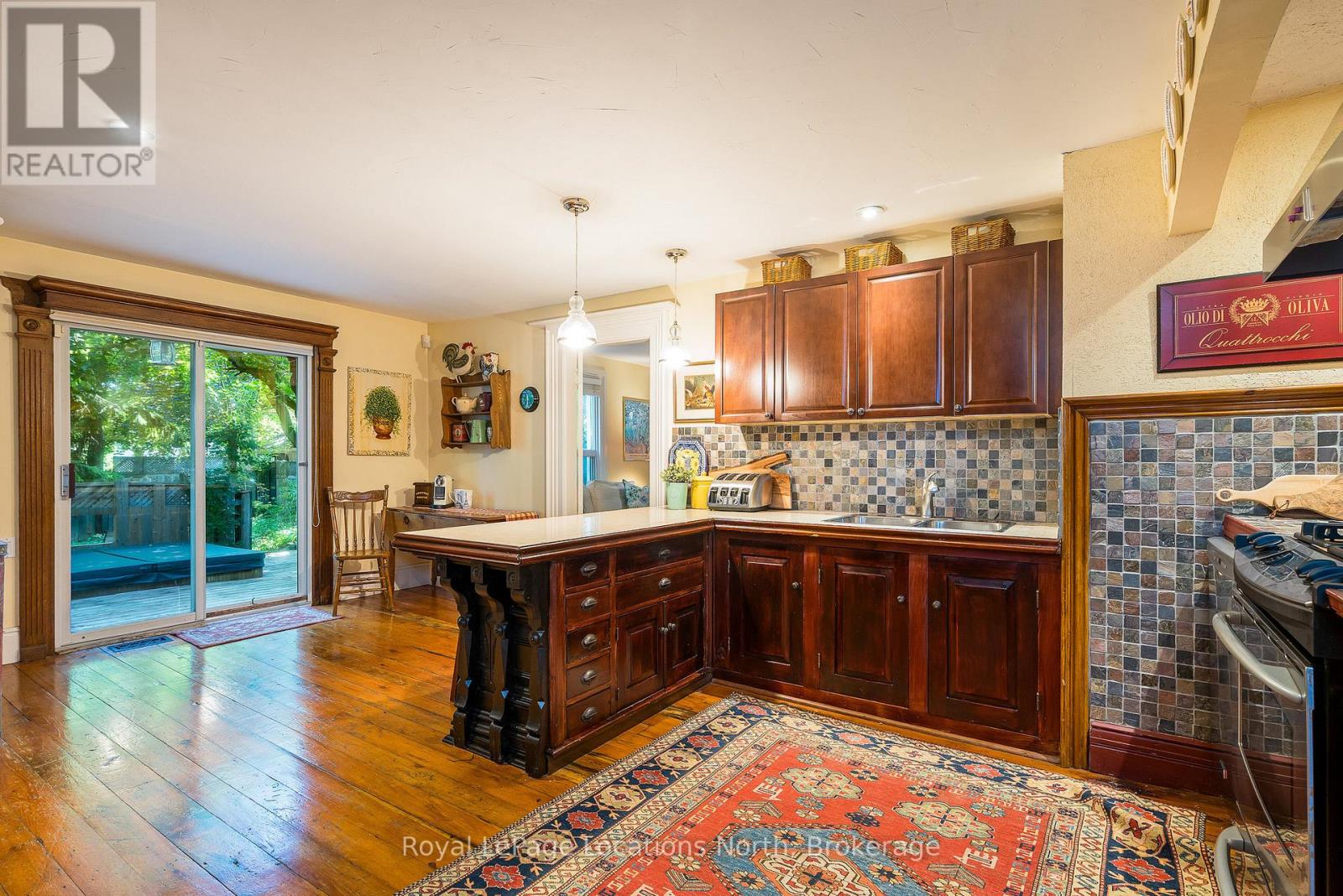 When you step inside this unique, renovated 1897 church, you can't help but imagine the fabulous holidays your family and friends would enjoy here. On the main street of the charming village of Nottawa, this is a home meant for gathering. This rare opportunity is absolutely full of thoughtful touches and decor lavished on it by its current owners, and all those touches are included in the sale. Furnishings, linens, rugs, art, lamps, antiques, even the dishes, all come with the house so moving in will be easy. Your family will enjoy the restful and restorative atmosphere of the main floor with the soft light of stained glass. The sprawling living space under post and beam cathedral ceilings has a chalet like feel. It features a primary seating area in front of a wood burning fireplace with a wonderful long and welcoming bar for entertaining. The bar itself was recovered from an old general store. An adjoining space houses another seating area in front of a gas fireplace and a large billiards table. The dining table seats 14 so no card tables will be necessary. Each space is wide open yet beautifully defined with a combination of historic details and new improvements. You will have room for all your guests in the five upstairs bedrooms, all stylishly decorated and all enjoying the comforting glow of stained glass windows.The main floor den has a pull out sofa bed and an ensuite bathroom for additional sleeping quarters. It is a home to wander in, explore, and bask in its warmth and coziness. Outside, a large backyard deck allows space for an oversized bbq and an enormous hot tub, all under a beautiful canopy of mature trees. Multiple sheds for storage and potting make maintenance easy -- and even the garden equipment is included. (id:49203)