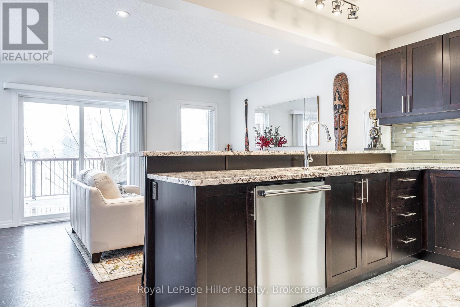 $227 MonthlyA must view end-unit townhouse condo backing onto open green space with spectacular south/west-facing views. Three full levels of finished living space. Two bedrooms plus an upper family room easily converted to a third bedroom, if needed.Open-concept main floor with a stylish granite countertop kitchen, well-maintained appliances, and sight-lines over the living area and dinette. Walk-out to a deck with motorized awning. Windows on the east, south, and west sides provide consistent natural light throughout the day. Engineered hardwood and ceramic tile throughout.Separate dining room offers flexibility as a main-floor office with privacy and strong natural light. Upper level features two generous bedrooms, a 4-piece bath and a 4pc ensuite, upper laundry room with sink, and a large walk-in closet in the Primary bedroom.Finished lower-level rec-room with walk-out to a private patio. One-owner home. Meticulously maintained. Neutral décor. Clean, disciplined finishes. Move-in ready. No deferred work. (id:49203)