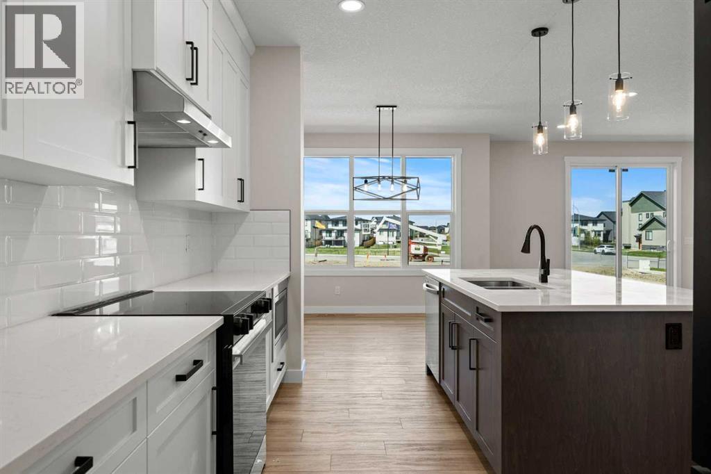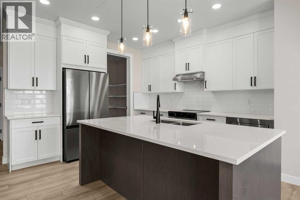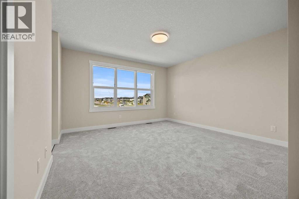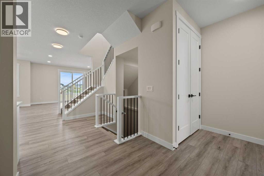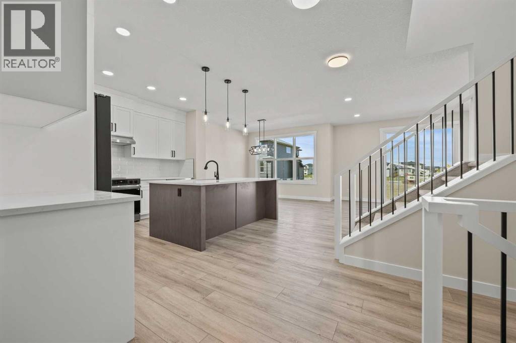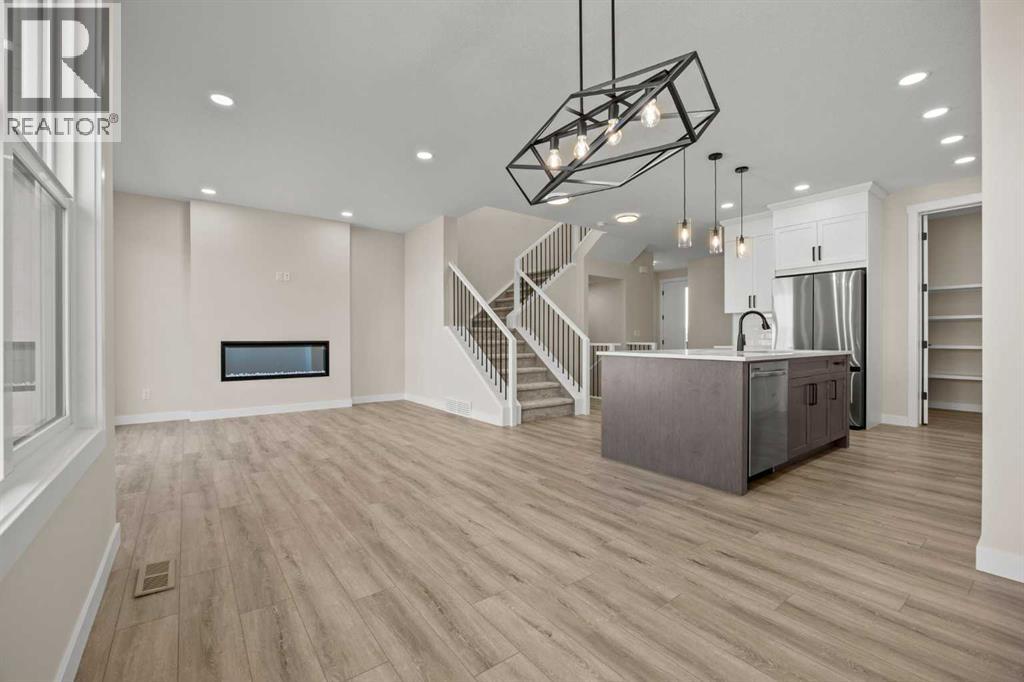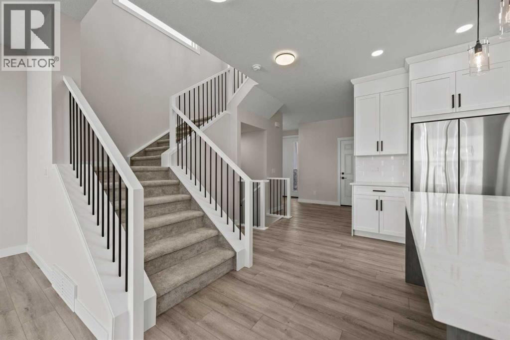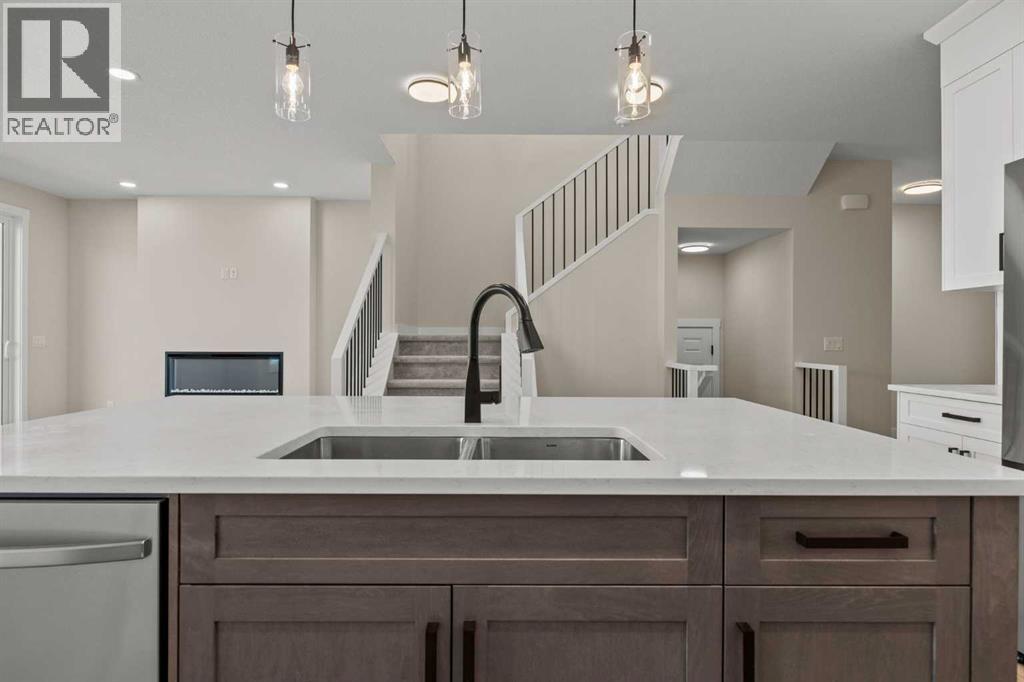 Welcome to 462 Kinniburgh Loop—an elegantly designed 1,840 sq. ft. duplex in the highly sought-after community of Kinniburgh South, Chestermere. Built by award-winning luxury builder Golden Homes, this residence blends modern living, functionality, and timeless design—all just minutes from schools, everyday amenities, and Lake Chestermere.The main floor features an inviting open-concept layout with soaring 9’ ceilings and 8’ doors, creating a spacious and grand feel. As you enter, you’re welcomed by a large 8’ front door with a built-in glass window, setting the tone for the luxury inside. The front of the home includes a convenient half bath, access to your basement, and beautifully finished stairs leading down to the undeveloped basement. This home also includes a side entrance for added flexibility.At the heart of the home is a chef-inspired kitchen boasting a striking two-tone cabinet design, quartz countertops, a large island with breakfast bar seating, ceiling-height painted cabinetry, and sleek stainless-steel appliances. Oversized triple-pane windows flood the living and dining areas with natural light, creating a bright, warm space that’s perfect for entertaining, relaxing, and everyday living. The living room is completed with an electric fireplace featuring multiple color settings and heat modes, adding both style and comfort.Upstairs, the oversized grand staircase with white railings and matte black iron spindles leads you to the luxurious primary bedroom. This bedroom offers a spa-like 5-piece ensuite with a freestanding tub, fully tiled walk-in shower, dual vanities, and an enclosed toilet. The primary bedroom also includes a custom walk-in closet with built-in shelving and organizers, plus stunning sunrise views to start your mornings. Two additional spacious bedrooms and a full bathroom provide plenty of room for family, while the tiled laundry room—complete with a quartz countertop for folding and storage—adds everyday convenience.Premium featur es throughout include an oversized 20’x22’ garage, upgraded spindle railings, MDF shelving, matte black fixtures and hardware, high-efficiency triple-pane windows for energy savings, and an enhanced party wall for superior soundproofing. Golden Homes’ signature quality and craftsmanship are evident in every detail.The exterior will be fully landscaped, including grading, loam, sod to the side entrance, and a front yard tree—offering instant curb appeal and outdoor enjoyment. With its west-facing orientation, you’ll enjoy beautiful sunrises to begin the day and softer evening light to wind down. (id:49203)