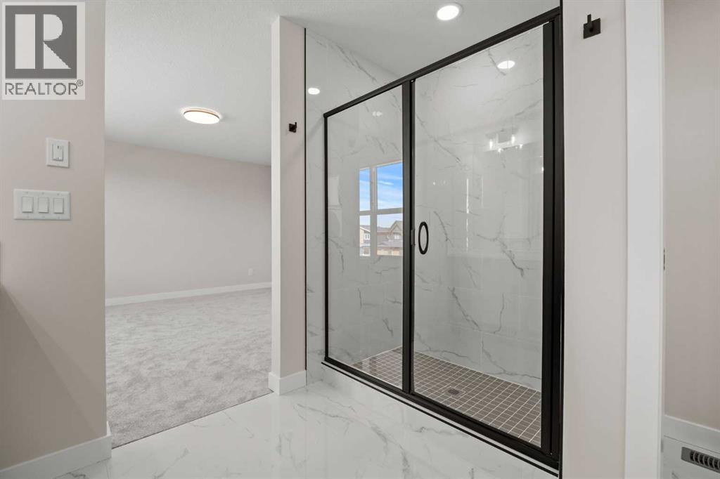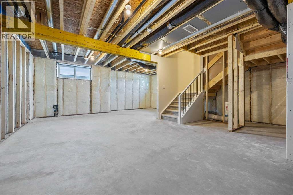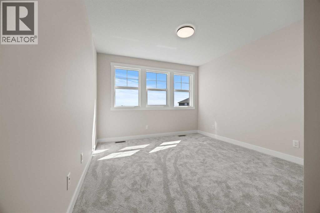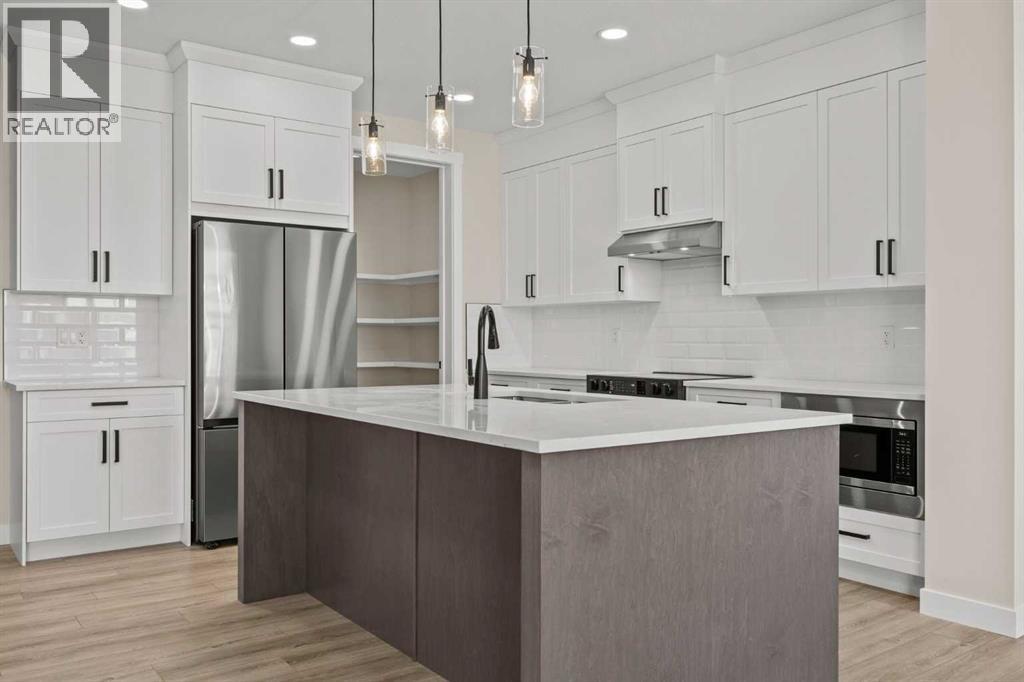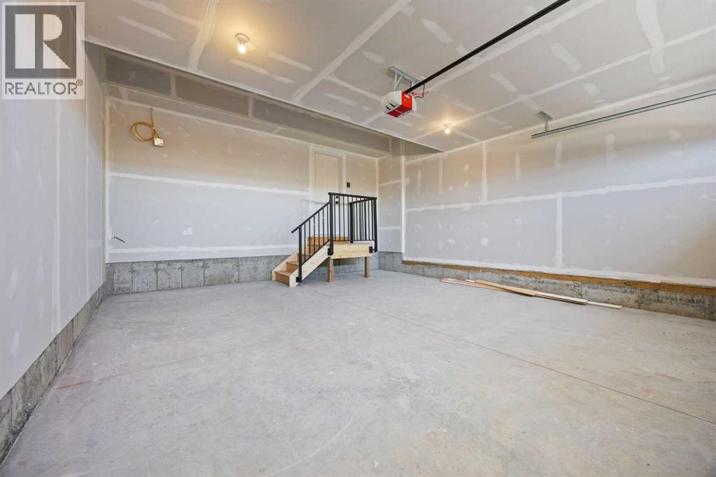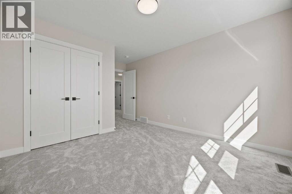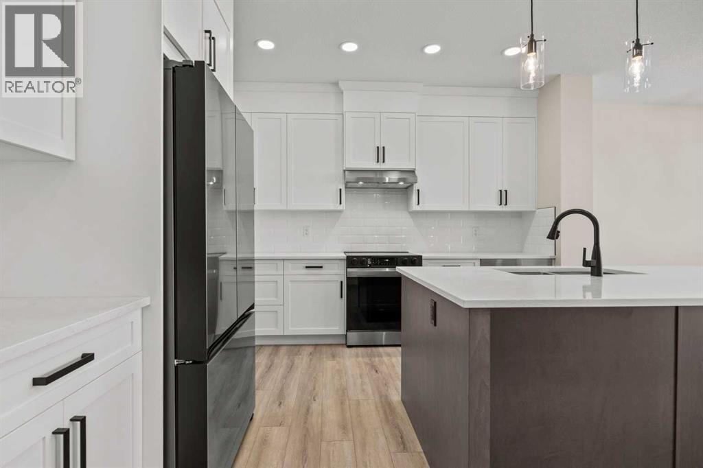 Welcome to 462 Kinniburgh Loop—an elegantly designed 1,840 sq. ft. duplex in the highly sought-after community of Kinniburgh South, Chestermere. Built by award-winning luxury builder Golden Homes, this residence blends modern living, functionality, and timeless design—all just minutes from schools, everyday amenities, and Lake Chestermere.The main floor features an inviting open-concept layout with soaring 9’ ceilings and 8’ doors, creating a spacious and grand feel. As you enter, you’re welcomed by a large 8’ front door with a built-in glass window, setting the tone for the luxury inside. The front of the home includes a convenient half bath, access to your basement, and beautifully finished stairs leading down to the undeveloped basement. This home also includes a side entrance for added flexibility.At the heart of the home is a chef-inspired kitchen boasting a striking two-tone cabinet design, quartz countertops, a large island with breakfast bar seating, ceiling-height painted cabinetry, and sleek stainless-steel appliances. Oversized triple-pane windows flood the living and dining areas with natural light, creating a bright, warm space that’s perfect for entertaining, relaxing, and everyday living. The living room is completed with an electric fireplace featuring multiple color settings and heat modes, adding both style and comfort.Upstairs, the oversized grand staircase with white railings and matte black iron spindles leads you to the luxurious primary bedroom. This bedroom offers a spa-like 5-piece ensuite with a freestanding tub, fully tiled walk-in shower, dual vanities, and an enclosed toilet. The primary bedroom also includes a custom walk-in closet with built-in shelving and organizers, plus stunning sunrise views to start your mornings. Two additional spacious bedrooms and a full bathroom provide plenty of room for family, while the tiled laundry room—complete with a quartz countertop for folding and storage—adds everyday convenience.Premium featur es throughout include an oversized 20’x22’ garage, upgraded spindle railings, MDF shelving, matte black fixtures and hardware, high-efficiency triple-pane windows for energy savings, and an enhanced party wall for superior soundproofing. Golden Homes’ signature quality and craftsmanship are evident in every detail.The exterior will be fully landscaped, including grading, loam, sod to the side entrance, and a front yard tree—offering instant curb appeal and outdoor enjoyment. With its west-facing orientation, you’ll enjoy beautiful sunrises to begin the day and softer evening light to wind down. (id:49203)